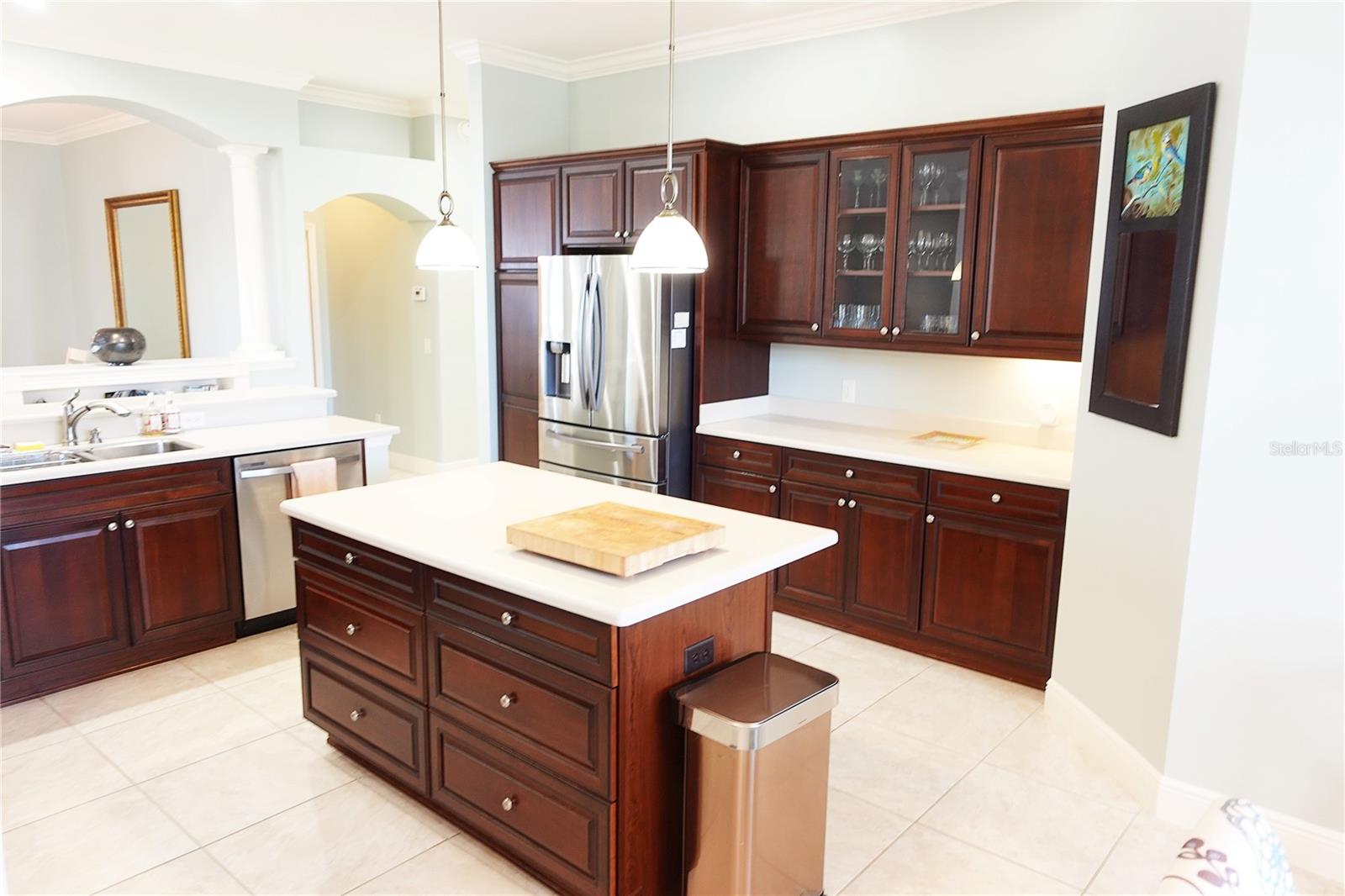 POOL HOME in exclusive Village of BRIDGEPORT AT LAKE SUMTER! This beautiful PREMIER WILLIAMSBURG is positioned on a corner lot, with no homes directly behind! Great location one entrance in neighborhood. The kitchen boasts beautiful CHERRY cabinetry, SOLID SURFACE counters, center ISLAND, and stainless appliances including a gas range and side by side refrigerator. The breakfast nook provides the perfect spot for casual dining! The open-concept living area features CROWN MOULDING, a tray ceiling in the living room and DISAPPEARING glass doors to the lanai. The master bedroom is spacious and has a tray ceiling and access to the lanai through French doors. The master bath has a garden tub, dual-sinks, a vanity area, separate toilet room and a tiled walk-in shower! The spacious lanai has a SUMMER KITCHEN with built-in gas grill, vent hood, sink and under-counter refrigerator! The HEATED POOL offers the soothing sounds of cascading water from the waterfall feature! Tropical plantings provide privacy for this wonderful outdoor entertainment space. This lovely home is CENTRALLY LOCATED in one of the most sought after all-Premier Villages! SELLER IS OFFERING A 20,000 ROOF CREDIT, AND HAS INSTALLED NEW HOT WATER HEATER. Come check out this HOME in the Beautiful Village of Bridgeport!
