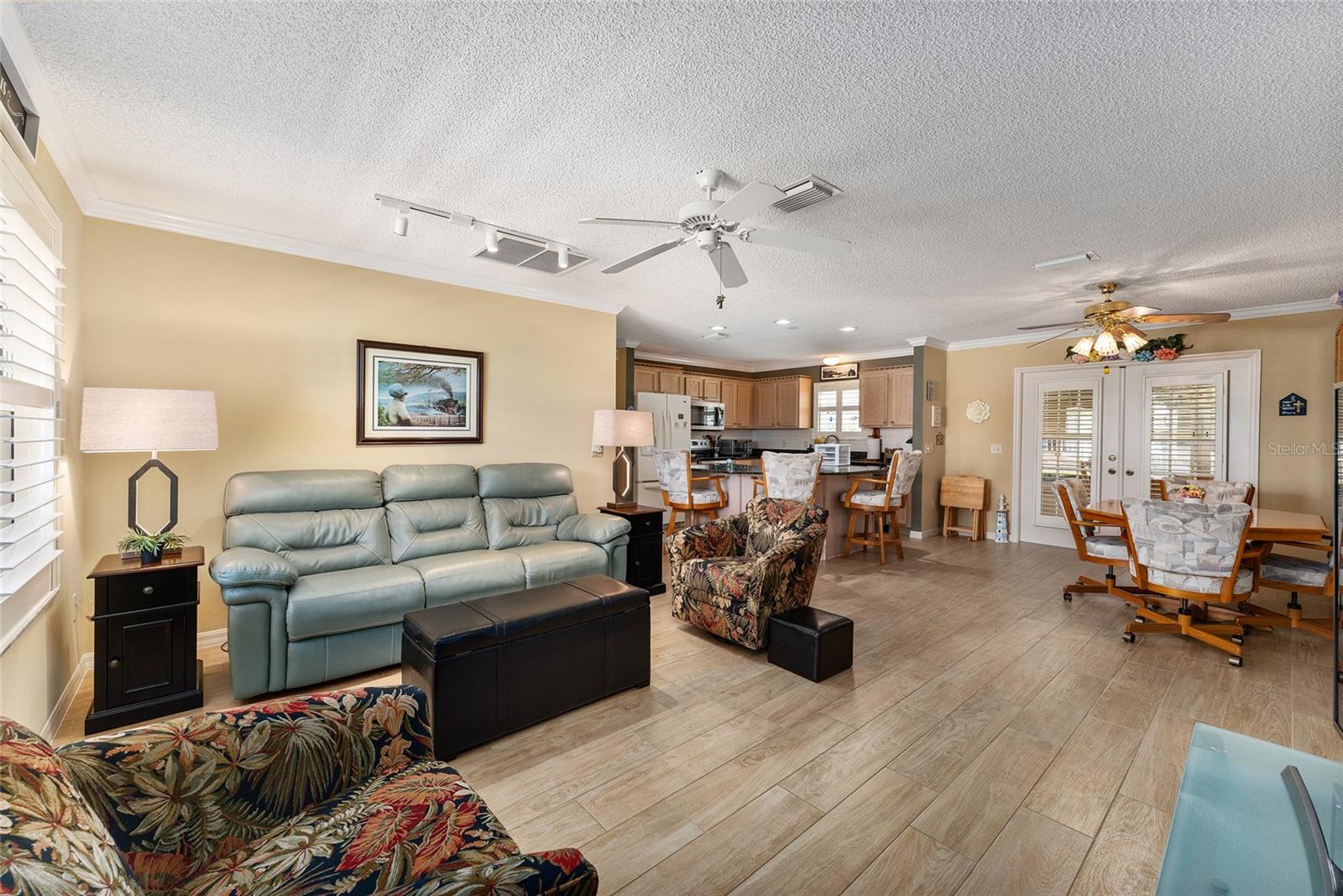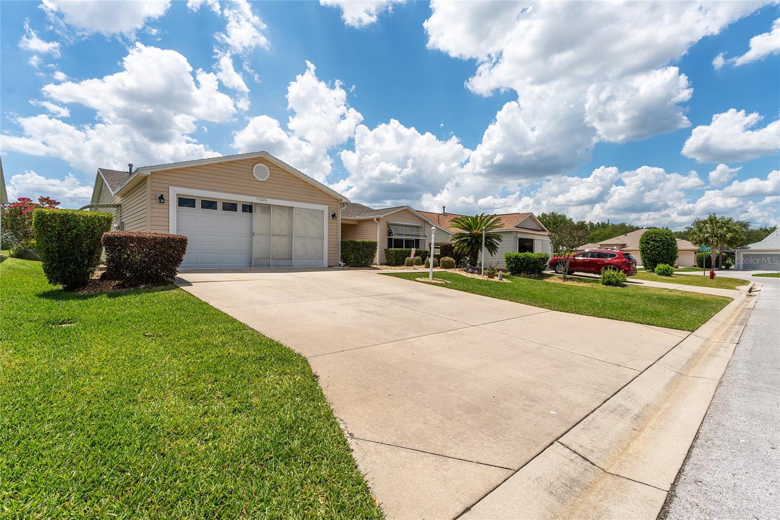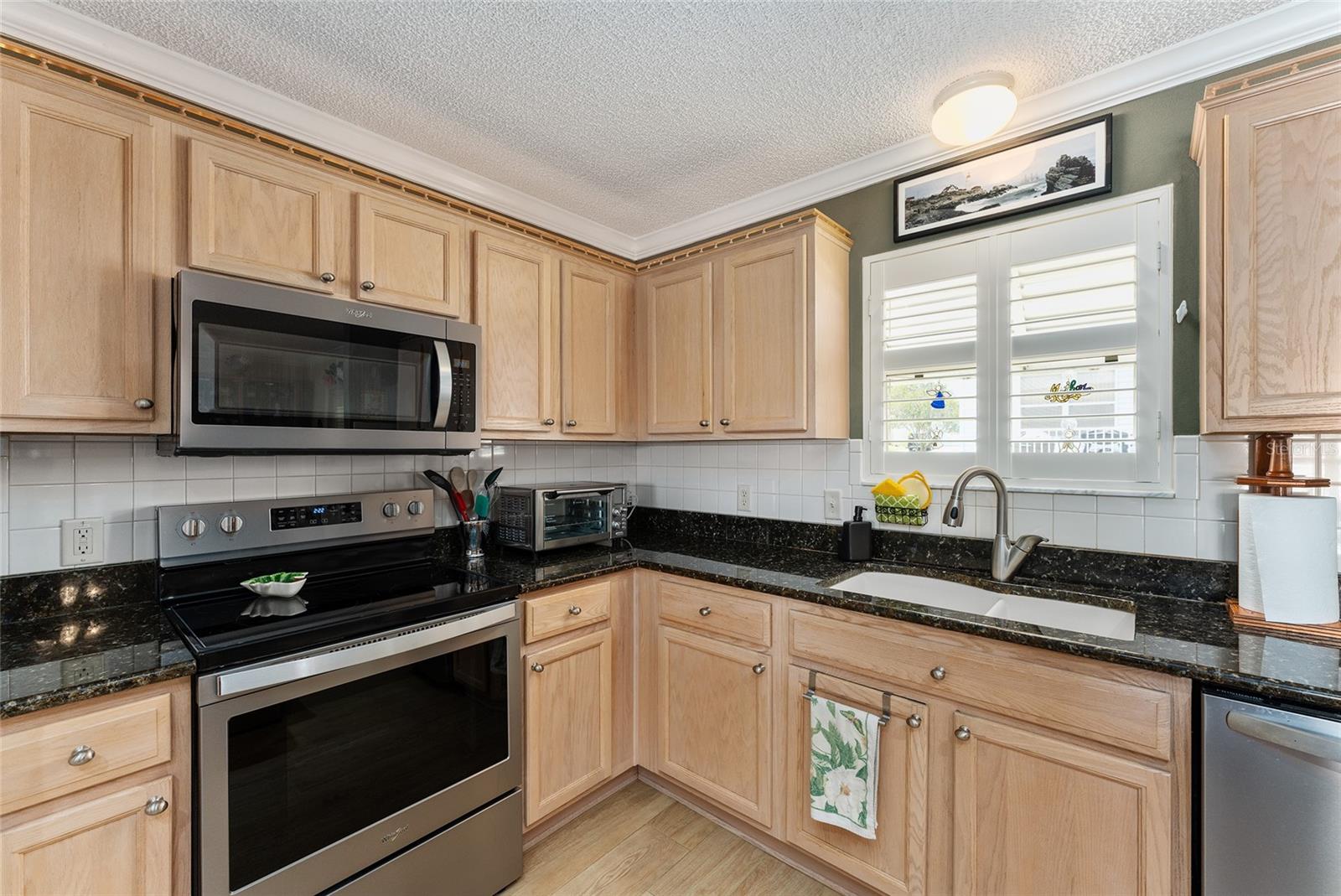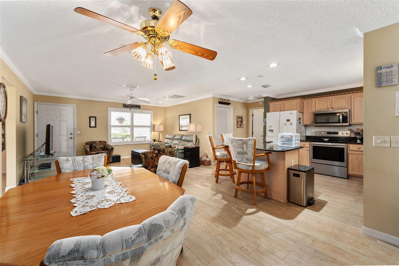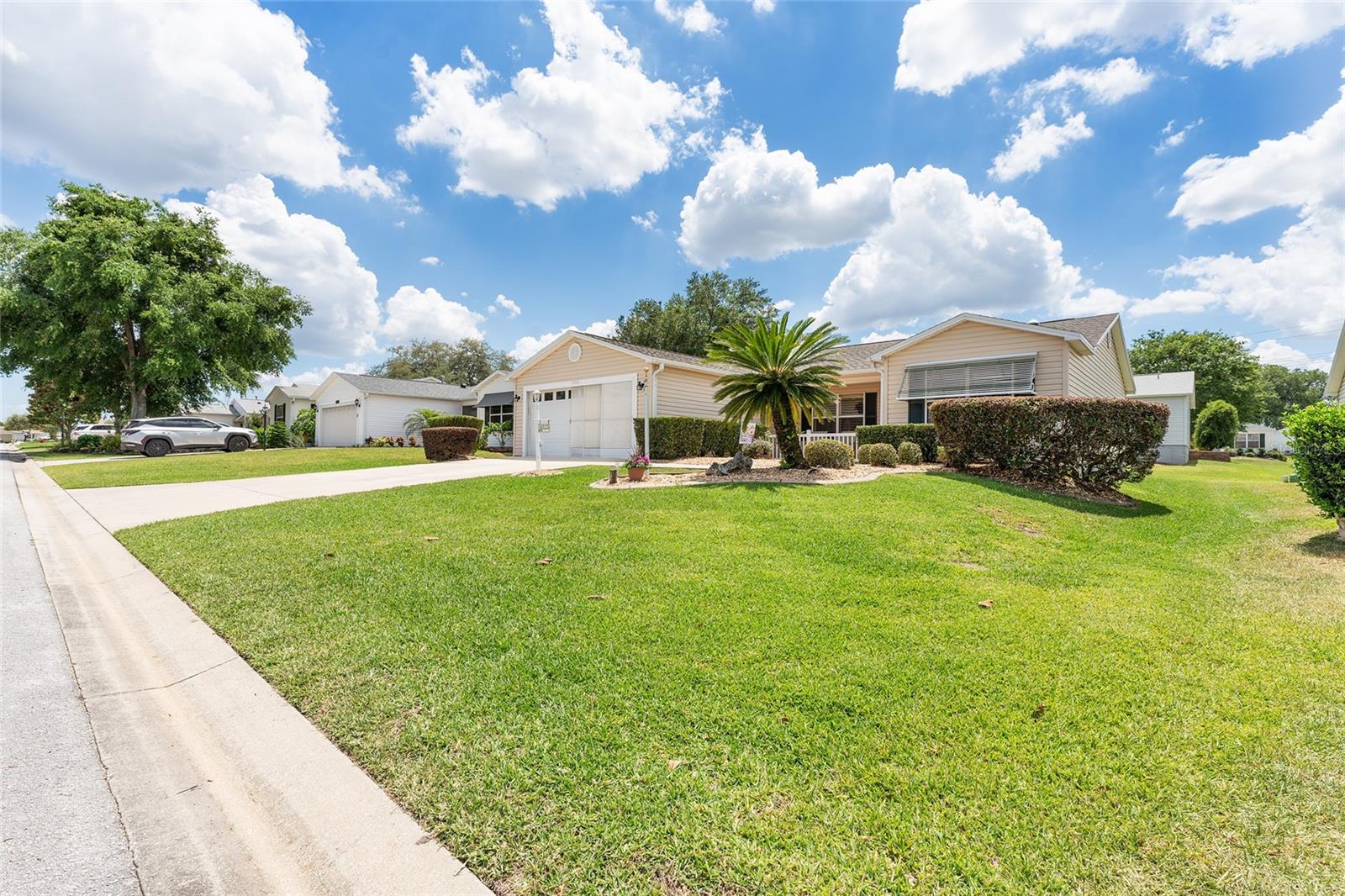 Welcome to The Villages! This Amarillo model home with a low bond offers 3 bedrooms and 2 bathrooms, combining functionality and style for comfortable living. The interior features crown molding, plantation shutters, and easy-to-maintain tile flooring throughout. The kitchen is thoughtfully designed with granite countertops and pull-out shelving in the cabinets, making it both beautiful and practical. Updated appliances, including the dishwasher, stove, and microwave (2020), add to the home’s modern convenience. The master bath has been recently updated, further enhancing its appeal. Step into the enclosed lanai, a perfect retreat to unwind and enjoy Florida’s warm evenings. Major updates include a new roof installed in 2023, ensuring peace of mind for years to come. Located near the Nancy Lopez Golf Course and a short trip to the recreation center, this home is perfectly situated for those looking to enjoy The Villages’ active lifestyle. Plus, it’s just minutes from the Villages of Spanish Springs, offering a variety of shopping and dining options. Don’t miss the chance to make this well-appointed home yours!