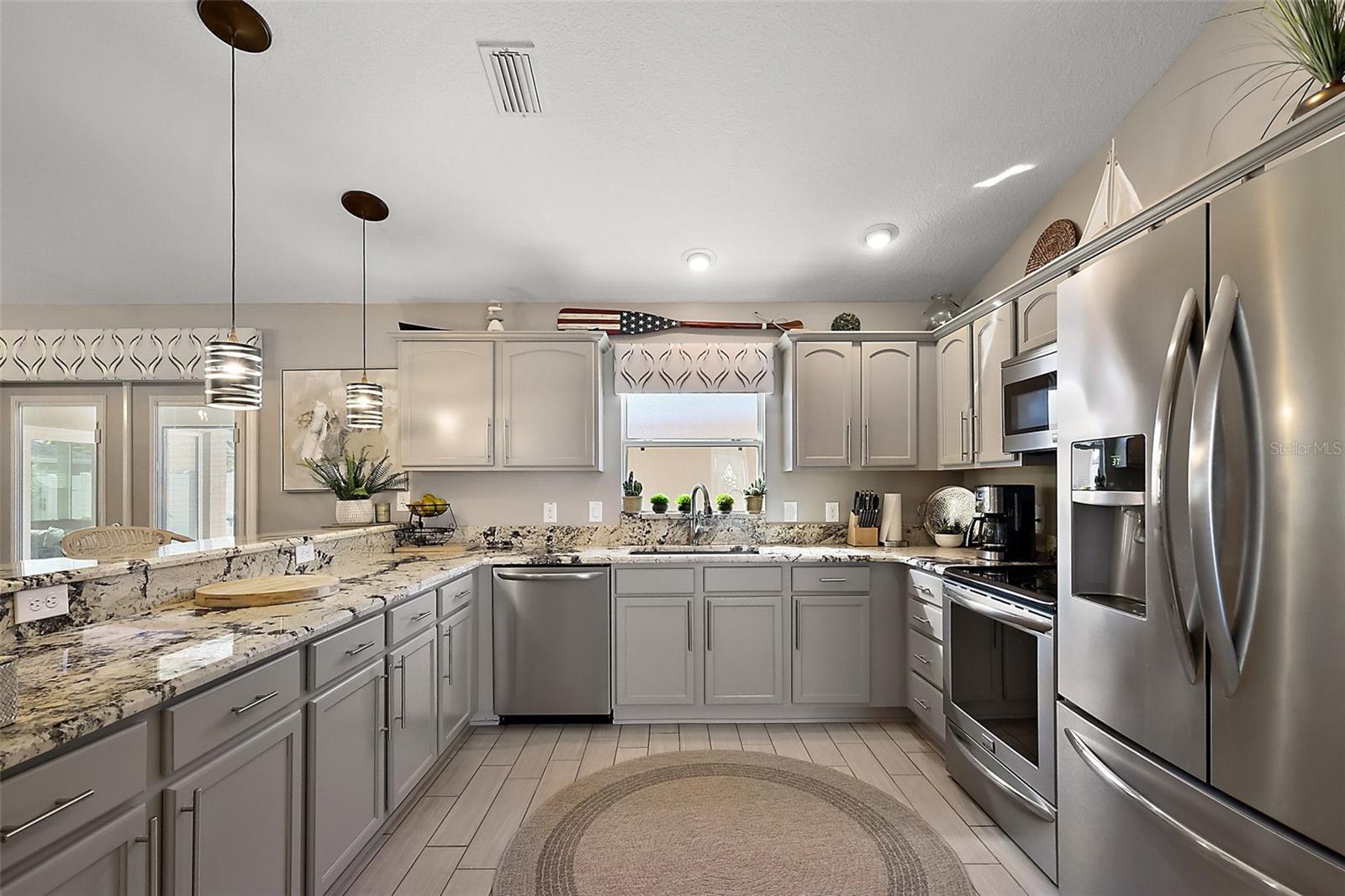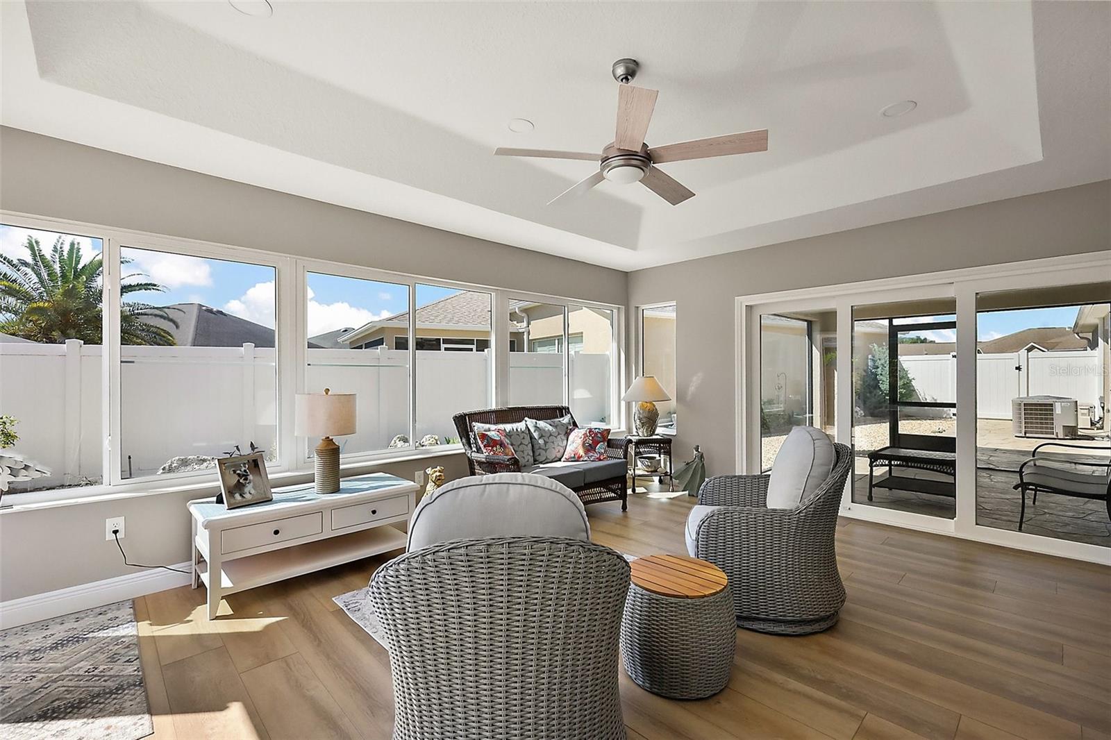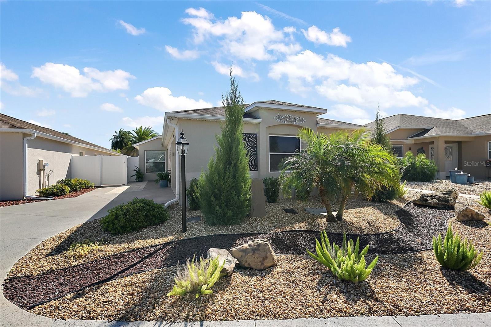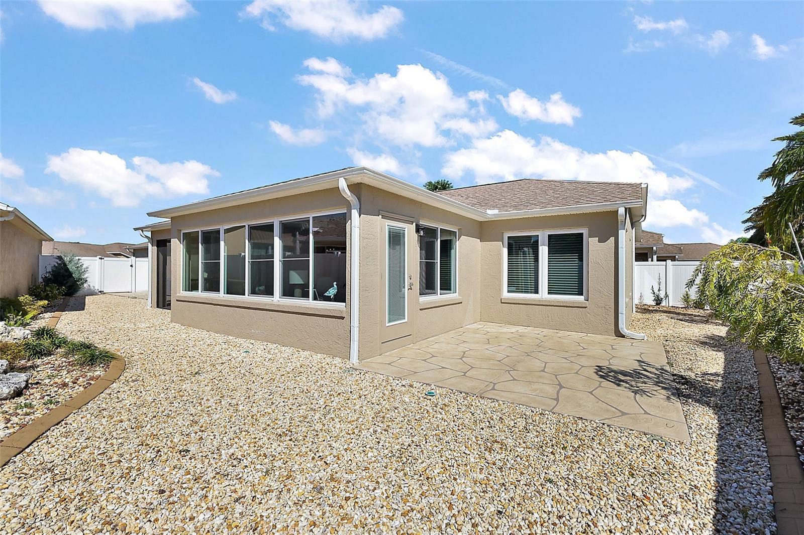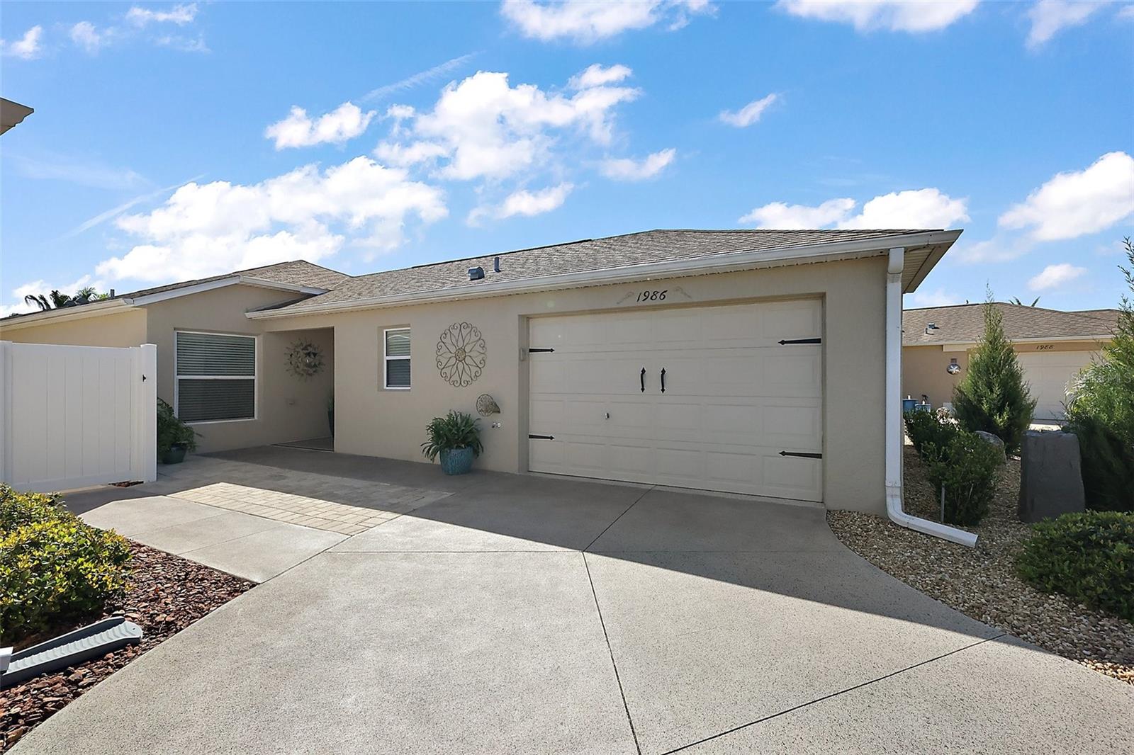 ~~~~Price Reduced!~~~~~ This luxurious and impeccably maintained expanded Foxglove Bungalow Courtyard Villa in the prestigious Village of Pennecamp offers over 2,100 sq. ft. of refined living space and is being sold fully furnished, including a 2018 GAS Yamaha golf cart. A brand NEW ROOF coming in June by a reputable company with a transferable warranty. The primary suite and living room have been expanded by 10 feet, creating a spacious, light-filled interior with luxury vinyl and tile flooring throughout, no carpet. The spa-inspired en suite boasts a walk-in shower with river rock accents, dual vanities with granite countertops, and a custom walk-in closet. The gourmet kitchen features granite countertops, stainless steel appliances, recessed lighting, and a breakfast bar. A stunning Florida Room, added in 2023, offers a tray ceiling, mini-split system, floor outlets, and tinted windows, with sliding glass doors that open to a screened, covered patio perfect for entertaining. The private courtyard features elegant, low-maintenance landscaping, while the epoxy-coated garage floor and exterior recessed lighting add to the home’s upscale appeal. Located close to Cane Garden Country Club, Lake Sumter Landing, pools, golf, and all the amenities of The Villages—this is a rare opportunity to enjoy luxury, comfort, and convenience in one of the most desirable locations.