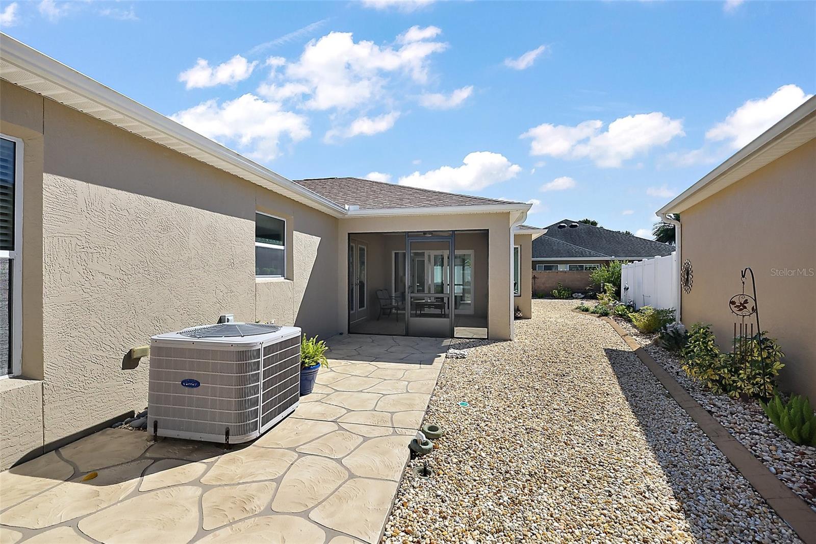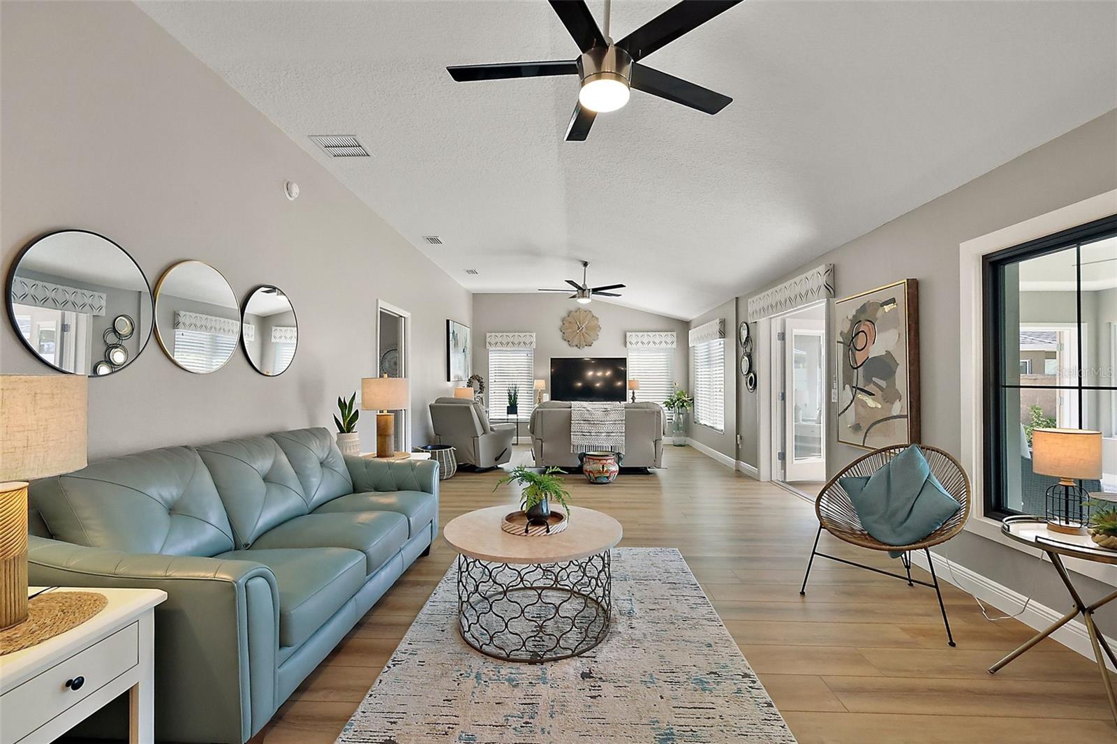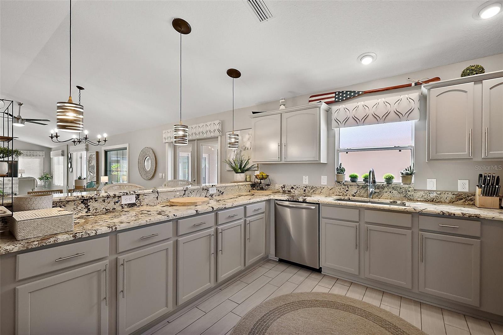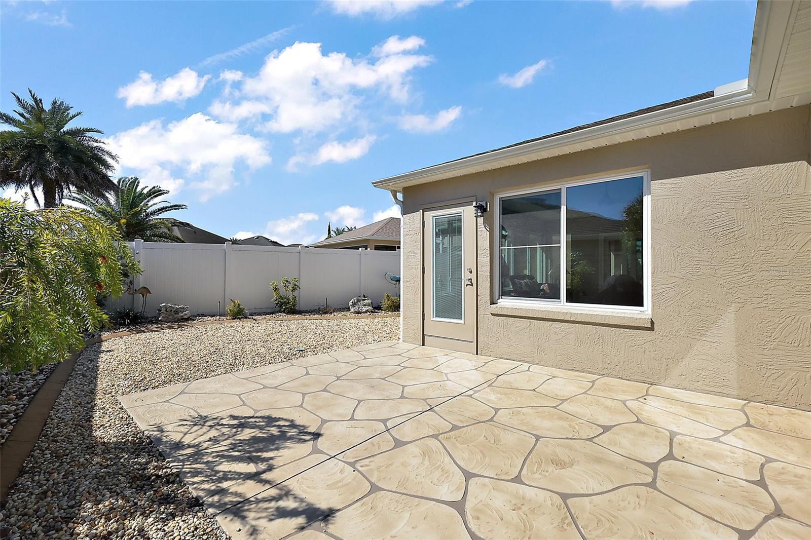 ~~~~Price Reduced!~~~~~ This luxurious and impeccably maintained expanded Foxglove Bungalow Courtyard Villa in the prestigious Village of Pennecamp offers over 2,100 sq. ft. of refined living space and is being sold fully furnished, including a 2018 GAS Yamaha golf cart. A brand NEW ROOF coming in June by a reputable company with a transferable warranty. The primary suite and living room have been expanded by 10 feet, creating a spacious, light-filled interior with luxury vinyl and tile flooring throughout, no carpet. The spa-inspired en suite boasts a walk-in shower with river rock accents, dual vanities with granite countertops, and a custom walk-in closet. The gourmet kitchen features granite countertops, stainless steel appliances, recessed lighting, and a breakfast bar. A stunning Florida Room, added in 2023, offers a tray ceiling, mini-split system, floor outlets, and tinted windows, with sliding glass doors that open to a screened, covered patio perfect for entertaining. The private courtyard features elegant, low-maintenance landscaping, while the epoxy-coated garage floor and exterior recessed lighting add to the home’s upscale appeal. Located close to Cane Garden Country Club, Lake Sumter Landing, pools, golf, and all the amenities of The Villages—this is a rare opportunity to enjoy luxury, comfort, and convenience in one of the most desirable locations.