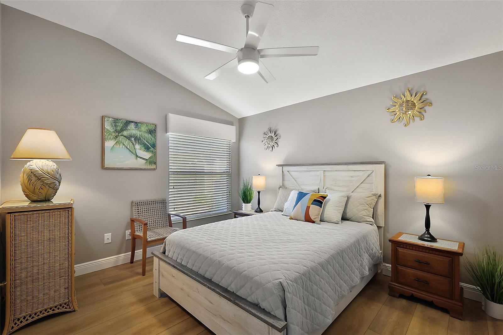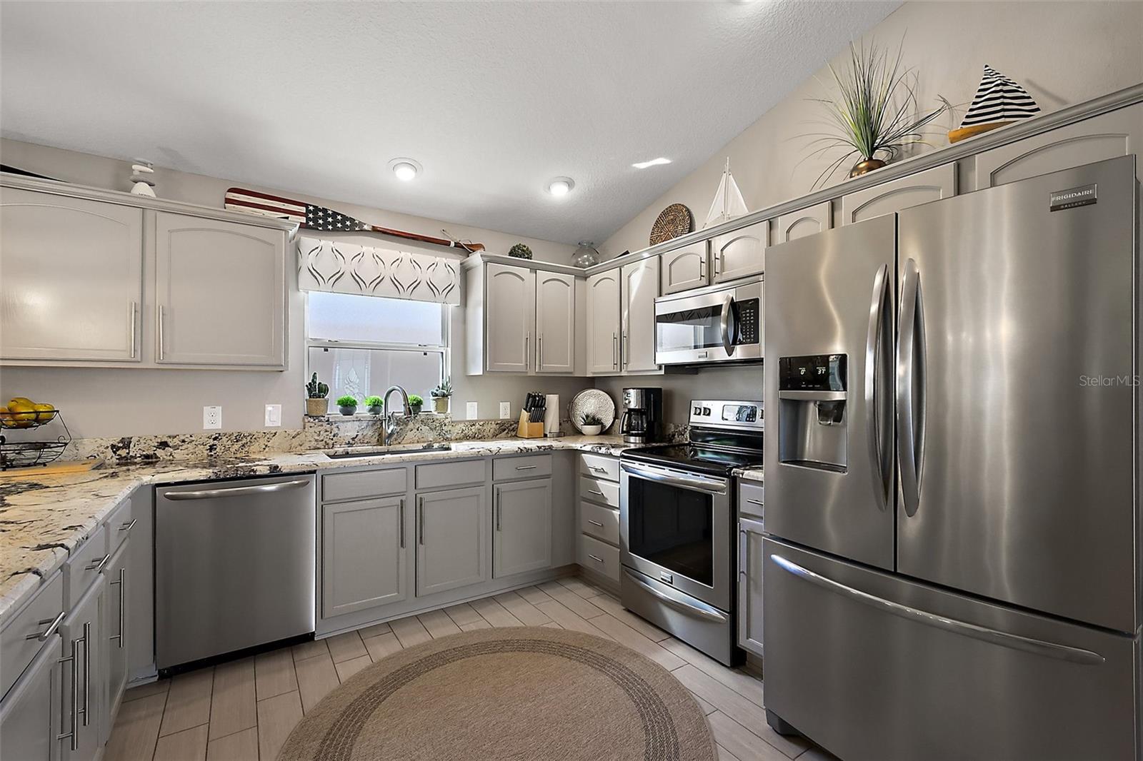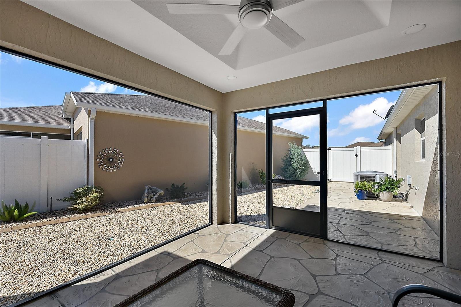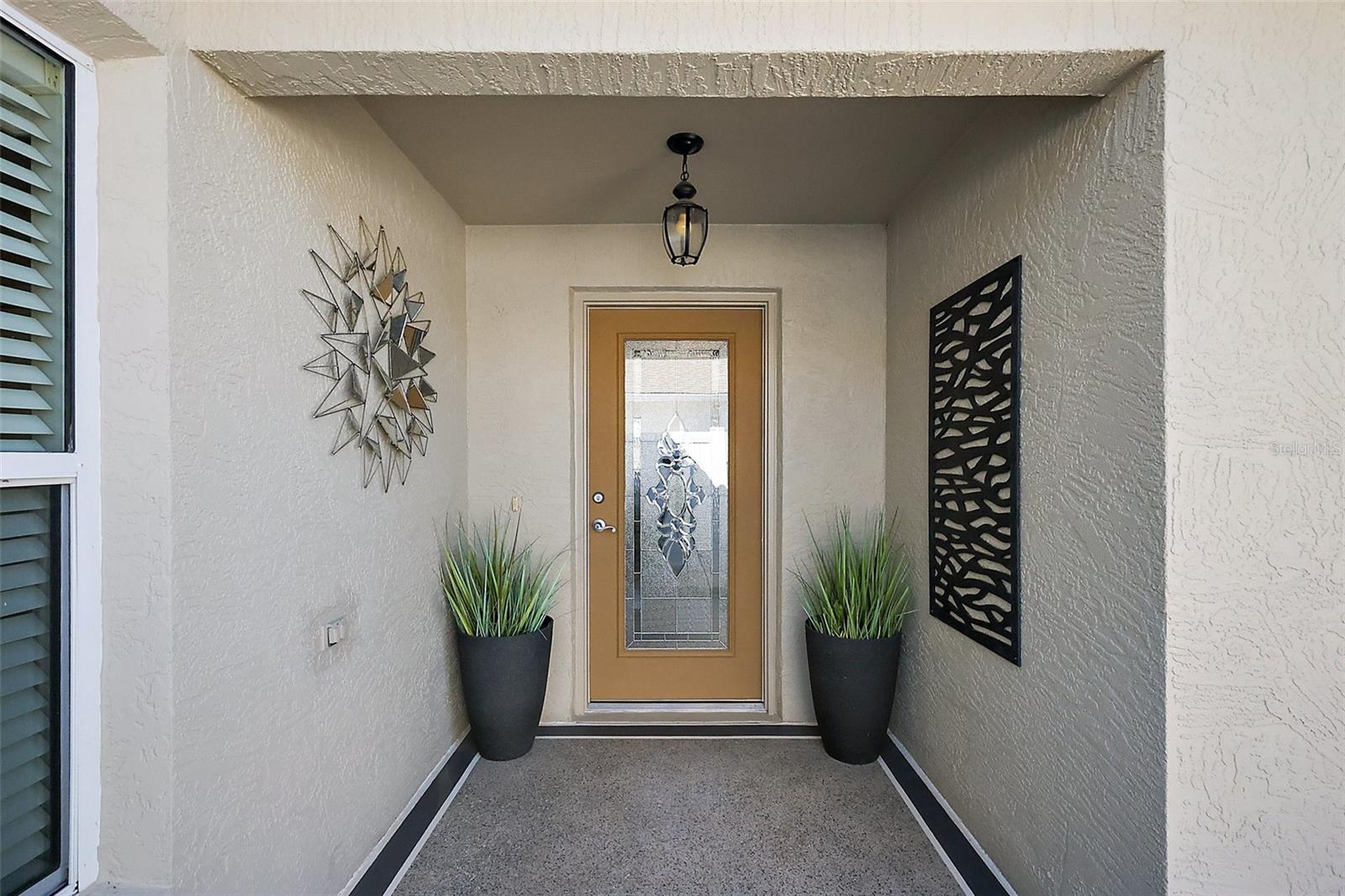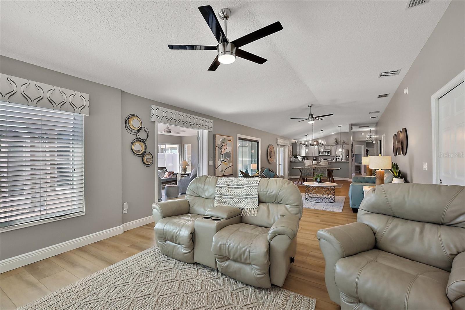 ~~~~Price Reduced!~~~~~ This luxurious and impeccably maintained expanded Foxglove Bungalow Courtyard Villa in the prestigious Village of Pennecamp offers over 2,100 sq. ft. of refined living space and is being sold fully furnished, including a 2018 GAS Yamaha golf cart. A brand NEW ROOF coming in June by a reputable company with a transferable warranty. The primary suite and living room have been expanded by 10 feet, creating a spacious, light-filled interior with luxury vinyl and tile flooring throughout, no carpet. The spa-inspired en suite boasts a walk-in shower with river rock accents, dual vanities with granite countertops, and a custom walk-in closet. The gourmet kitchen features granite countertops, stainless steel appliances, recessed lighting, and a breakfast bar. A stunning Florida Room, added in 2023, offers a tray ceiling, mini-split system, floor outlets, and tinted windows, with sliding glass doors that open to a screened, covered patio perfect for entertaining. The private courtyard features elegant, low-maintenance landscaping, while the epoxy-coated garage floor and exterior recessed lighting add to the home’s upscale appeal. Located close to Cane Garden Country Club, Lake Sumter Landing, pools, golf, and all the amenities of The Villages—this is a rare opportunity to enjoy luxury, comfort, and convenience in one of the most desirable locations.