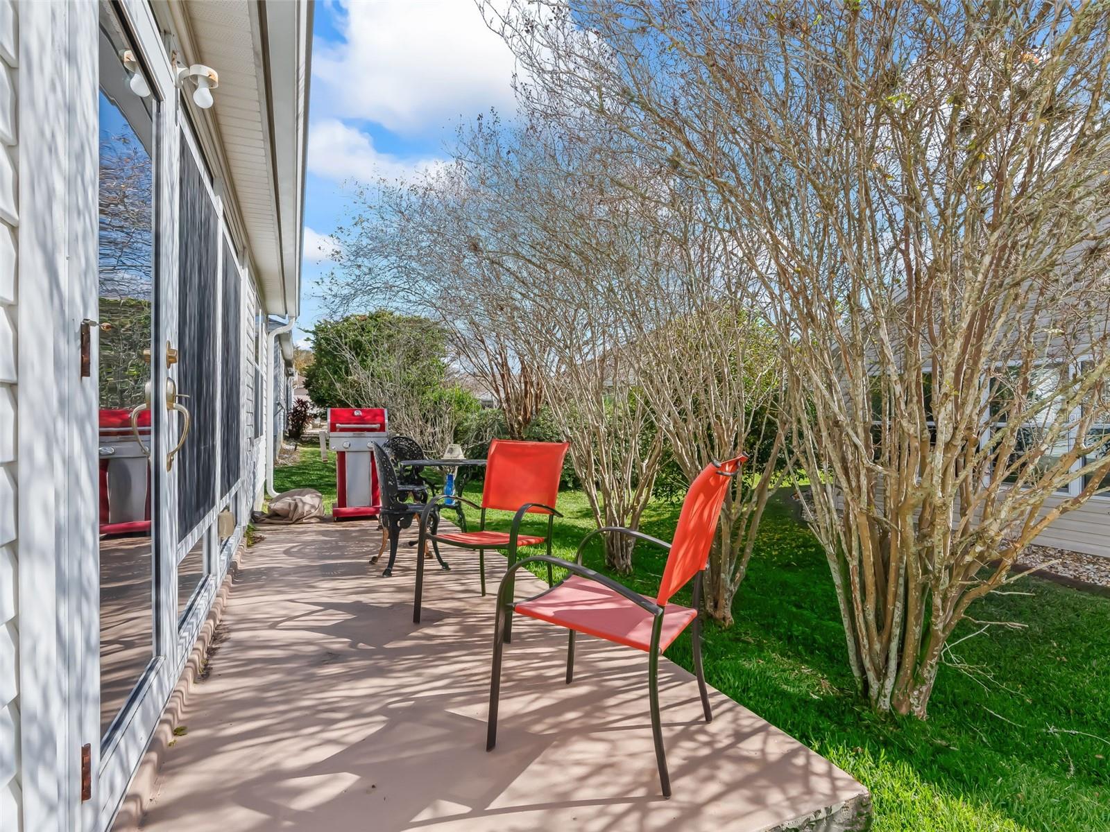 BOND PAID! ~ HVAC 2022 ~ Roof 2019 ~ Welcome to this beautiful 3-bedroom, 2-bath Cypress Designer Home, perfectly situated on a quiet, landscaped lot in the highly sought-after Village of Woodbury. From the moment you arrive, you’ll appreciate the pavered walkway and driveway, along with the inviting curb appeal. Step inside to a bright, open floor plan featuring high ceilings, tile and luxury vinyl plank flooring throughout (no carpet), and the added convenience of a rare entry closet. The spacious kitchen is a chef’s delight, offering abundant light oak cabinetry with pull-outs, a gas range, pantry, ample counter space, recessed lighting, a large bay window, and a cozy breakfast nook. The formal dining room is conveniently located just off the kitchen. The oversized living room boasts volume ceilings and abundant natural light, flowing seamlessly into the enclosed Florida Room, currently used as an art studio. This sun-filled space features roller shades and a glass door leading to the rear patio—perfect for grilling and entertaining family and friends. The expansive and private primary suite is a true retreat, featuring two walk-in closets, a ceiling fan, and an en-suite bath with dual sinks, a makeup vanity, step-in shower, and natural light. The guest wing, located on the opposite side of the home, includes two bright guest bedrooms with built-in closets and ceiling fans; one bedroom offers direct access to the lanai through sliding glass doors. The guest bath features tile flooring, a tub/shower combo and a hall linen closet. Additional highlights include an indoor laundry room with front-load washer and dryer, cabinetry, extra storage, a utility tub, and space for a small home office. The garage offers extra depth, pull-down attic access, and built-in cabinets for optimal storage. This prime location is located just a short golf cart ride to the Springdale Pool, Dog Park, Mulberry Grove Regional Recreation Center, Nancy Lopez Country Club, First Responders Recreation Center, and Mulberry Grove Shopping Center offering grocery, drugstore, banking, medical, VA clinic, dining, and more! Entertainment at Savannah Center and dining at Nancy Lopez Legacy and Glen View Country Clubs are just minutes away. This home is move-in ready, available for a quick close, and waiting for you to start enjoying The Villages lifestyle today! Schedule your private home tour today! Room Measurements and Square Footage are approximate and should be verified by buyer/buyer’s agent. All information is deemed reliable but not guaranteed.