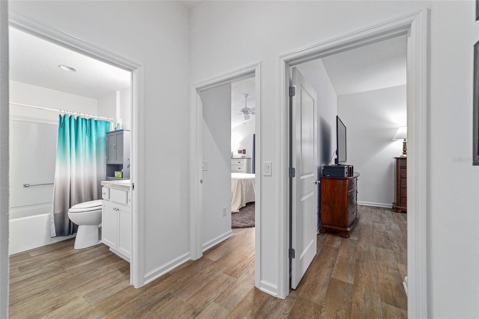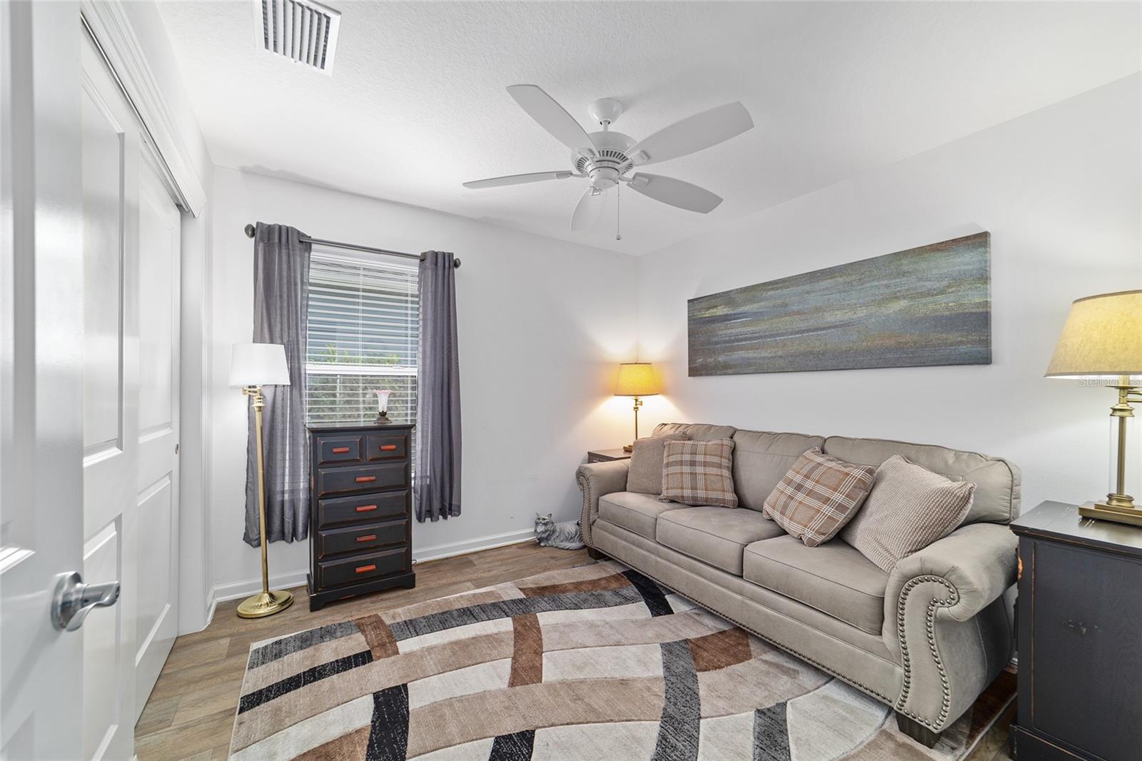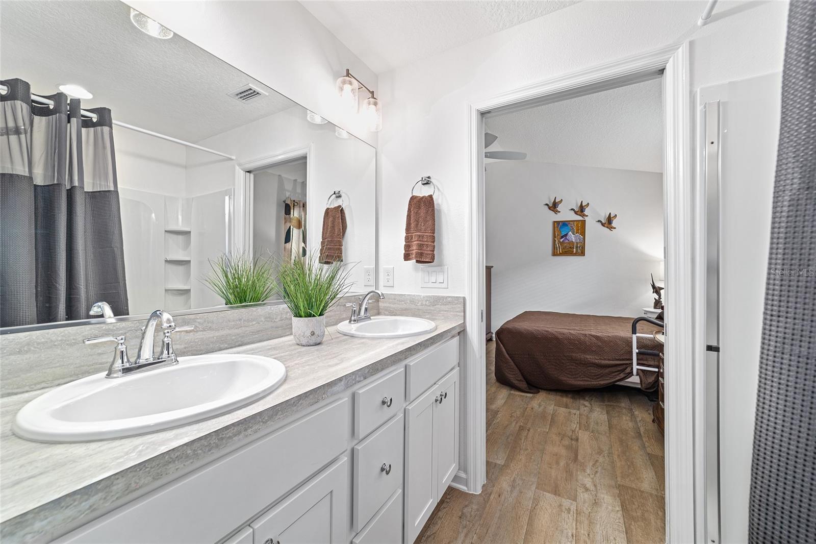 Come live your dream in this RARE find 3 bedroom 2 bath Emerald model with GOLF CART GARAGE in the Village of Hawkins. Perfectly located minutes from Eastport Town Center, Sawgrass Grove, the Magnolia Shopping Plaza and Hawkins Pool/Postal. All the shopping, dining, entertainment and recreation you'll need! The easy care landscape, painted driveway and covered front entry welcome you inside to volume ceilings, an open floor plan and vinyl flooring throughout. The kitchen is a dream with large island/bar seating, abundant cabinetry and upgraded refrigerator. Dining area and sliders to the side patio round out the entertaining possibilities! The primary suite offers a vaulted ceiling and walk-in closet. Bathroom w/ dual sinks, step-in shower (door available), linen and toilet closet. Second bedroom boasts a vaulted ceiling, built in closet and nearby bath. The private 3rd bedroom is located near the foyer with built in closet, a perfect spot for an office (sleeper sofa available). There's a spacious 14'x20' garage AND side entry golf cart garage w/ utility sink. Could be a possible workshop or additional storage option. New washer/dryer and storage nook housed inside the laundry closet. Additional features include a whole house water softener and security system. View the virtual tour and picture yourself enjoying this home soon!