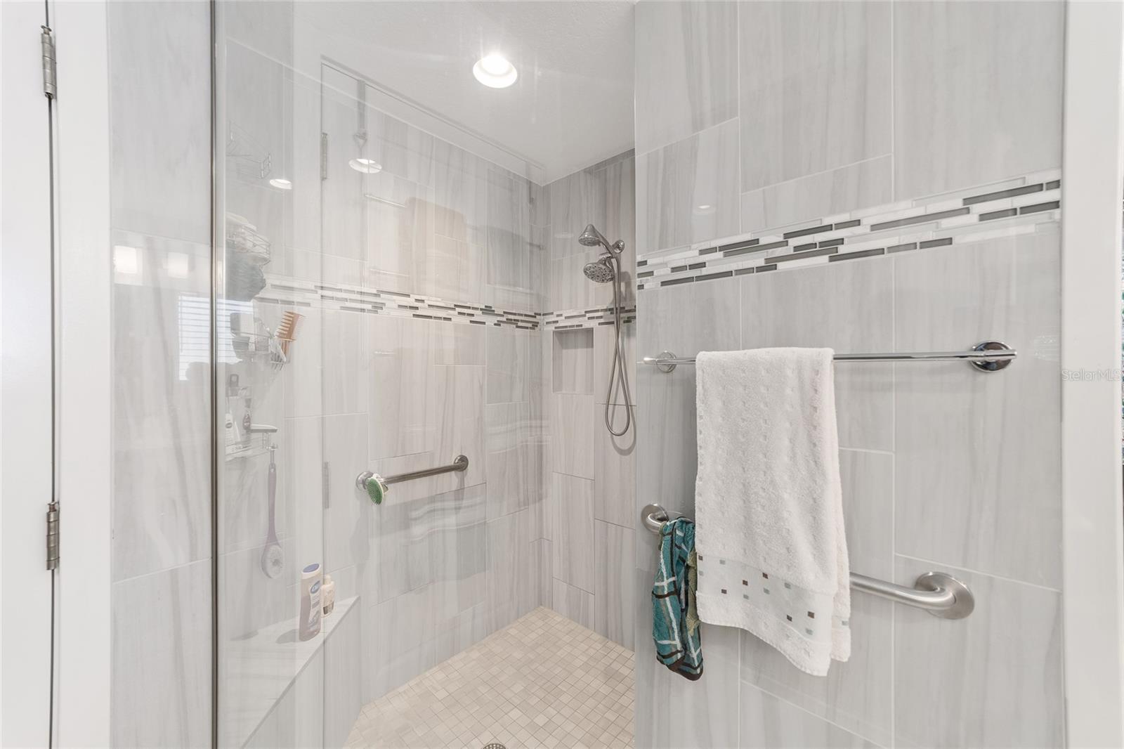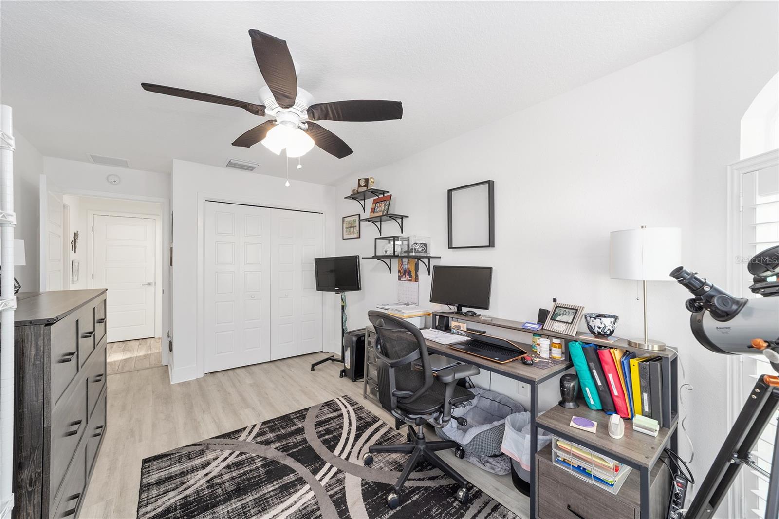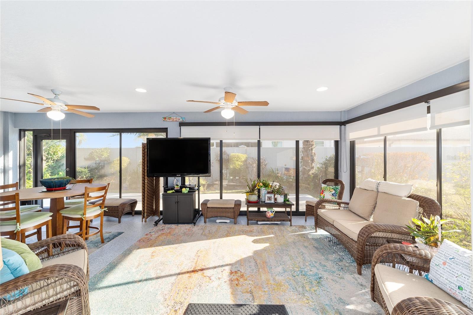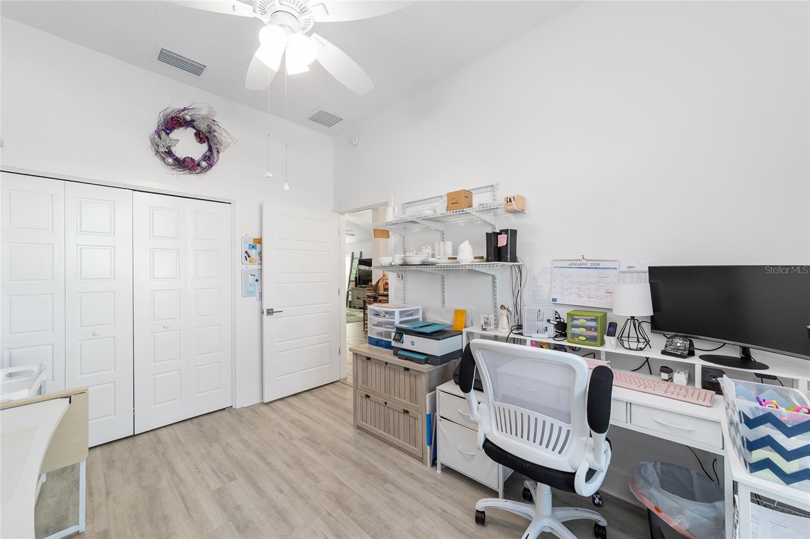 Beautiful move-in ready Designer home (Aspen) in the highly desirable Citrus Grove area, offering an OPEN-CONCEPT layout and a SPLIT-FLOOR PLAN with NO CARPET and ELEGANT PLANTATION SHUTTERS throughout. Enjoy added PRIVACY as the home backs to a wall, along with a spacious EXPANDED BACK PATIO and a GLASS-ENCLOSED LANAI with SLIDING GLASS WINDOWS, a MINI-SPLIT SYSTEM, and shades, making it ideal for comfortable, year-round relaxing or entertaining. The kitchen is a true highlight, featuring 42" CABINETRY, TILE BACKSPLASH, a LARGE CENTER ISLAND WITH STORAGE, STAINLESS STEEL APPLIANCES includes a GAS STOVE, and a stylish BUILT-IN WINE BAR—perfect for hosting. Additional upgrades include a WATER FILTRATION SYSTEM, GAS TANKLESS WATER HEATER, GUTTERS, PAINTED DRIVEWAY, WALKWAY and LANAI, and ENDHANCED LANDSCAPING. This home offers OVER $29,000 IN UPGRADES. The SPACIOUS GARAGE includes a GOLF CAR GARAGE and an ATTIC LIFT SYSTEM for easy attic storage access, providing EXCEPTIONAL STORAGE and convenience. Excellent location just minutes to recreation centers, pools, dog park, pickleball courts, restaurants, and Sawgrass Grove for nightly entertainment...and the soon to open new town square EASTPORT!