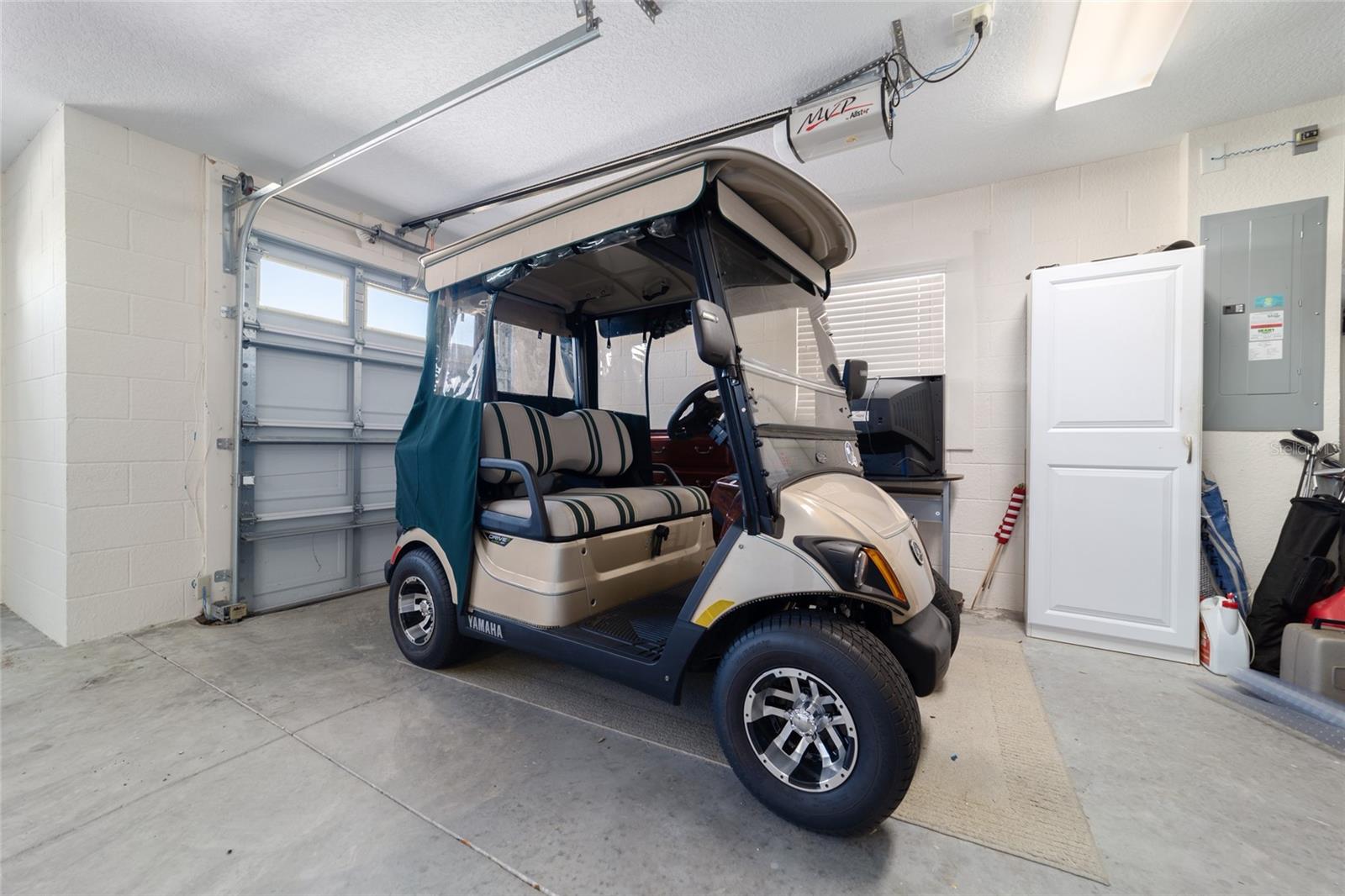 Welcome home! NO BOND and ideally located "between the 6s" in the Village of Bonita, this Begonia model is a short golf cart ride to Lake Sumter Landing or Brownwood Square. The home is situated on a CORNER LOT with painted driveway and offers a 2 CAR PLUS GOLF CART GARAGE. Glass front door and transom windows along the front welcome you inside to the PERFECT floor plan. Ceramic tile on the diagonal, high ceilings, NEUTRAL TONES, lots of natural light and a very PRIVATE lanai awaits. The kitchen includes designer walnut cabinetry with pullouts, stainless appliances, a breakfast nook and bar seating. The convenient layout offers EASE OF LIVING and the expandable sliders off the living and dining room gives you an entertaining option -- NO KISSING LANAIS and tasteful landscape providing privacy. The expansive primary suite has a tray ceiling, lanai access and dual walk in closets in the bedroom. The bath offers dual vanities, a walk-in Roman shower, linen and water closets. Your guest space includes a bedroom and bath with tiled shower/tub combo, linen closet and additional room for an office or den -- all behind a pocket door for a quiet opportunity. Rounding out this beautiful home is a laundry room with cabinets and utility sink, expansive garage with attic pull down/storage flooring and of course the 2019 Yamaha GOLF CART is ready to go! Multiple close by opportunities to visit the community pools, recreation facilities and golf courses. Shopping, restaurants and medical offices are very convenient to this home's location as well. You can have it ALL! (Turnkey including golf cart can be optional if not desired). HVAC 2025 Roof 2010