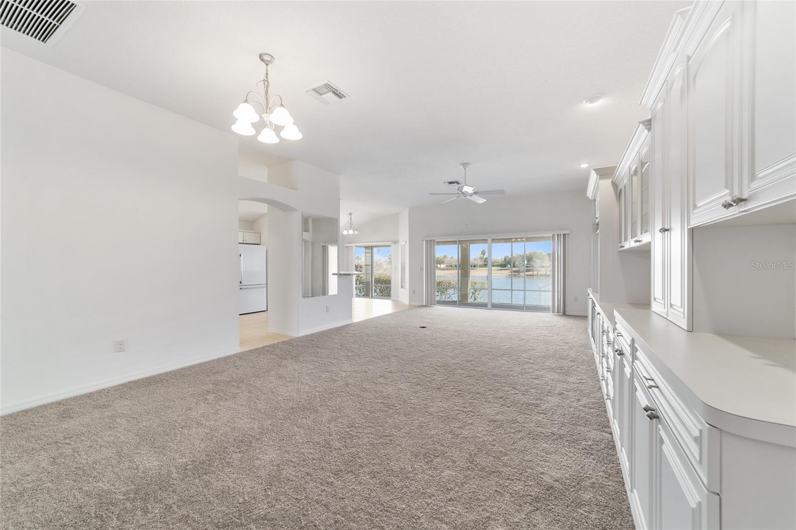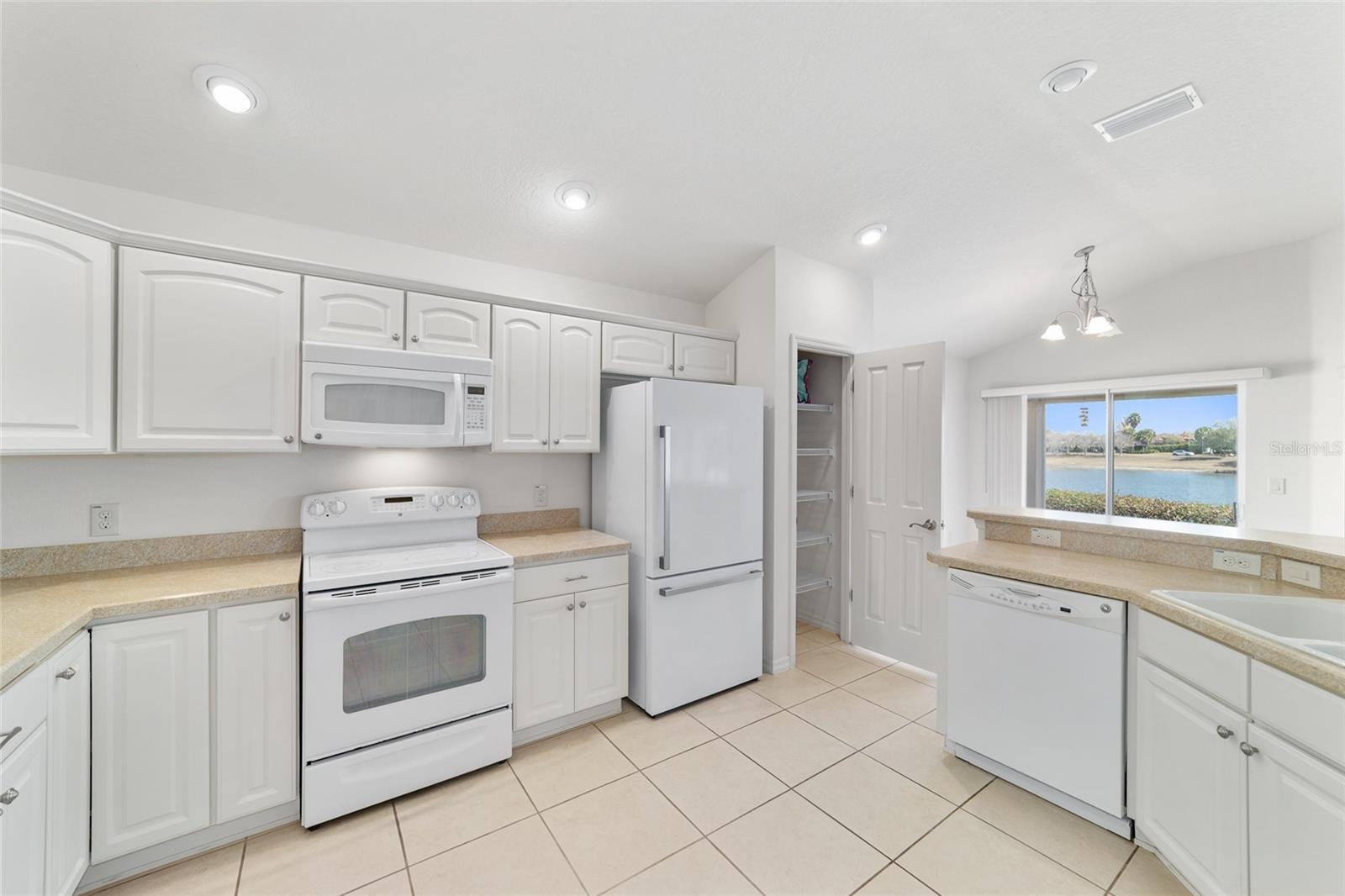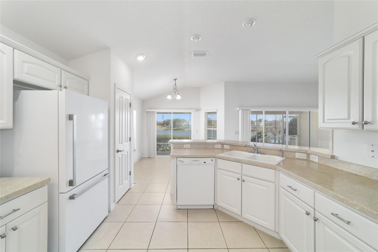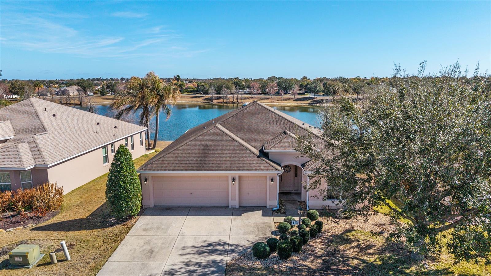 WATER VIEW and sought after LOCATION in the heart of The Villages! This designer Iris in the Village of Bonita offers 1965 living square feet with volume ceilings, generously sized bedrooms and a 2 CAR PLUS GOLF CART garage. Welcome in to a SHOW-STOPPING peaceful view of the pond out back. Home is WEST FACING giving you perfect morning sun on the screened lanai and cooler afternoons and evenings. This floor plan provides a large living/dining room that's open to the kitchen, both with sliders to the outdoors providing a LIGHT & BRIGHT feeling. Kitchen features WHITE cabinetry and appliances, NEUTRAL countertops and a closet pantry. Wake up to that VIEW again in the primary bedroom offering tray ceiling, an ensuite bath with tiled Roman shower, dual sink vanity and a CUSTOM walk-in closet you will LOVE! Two roomy additional bedrooms, linen closet and convenient bath are located behind a pocket door for guest privacy. The laundry room includes washer/dryer, utility sink, cabinetry and a BONUS AREA with room for a desk/office (or make it a walk-in pantry). Shelving in the garage for all your needs yet plenty of room for all your toys! Multiple close by opportunities to visit the community pools, recreation facilities and golf courses. Shopping, restaurants and medical offices are very convenient to this home's location btwn 466 and 466A. ROOF and HVAC are original HWH 2018