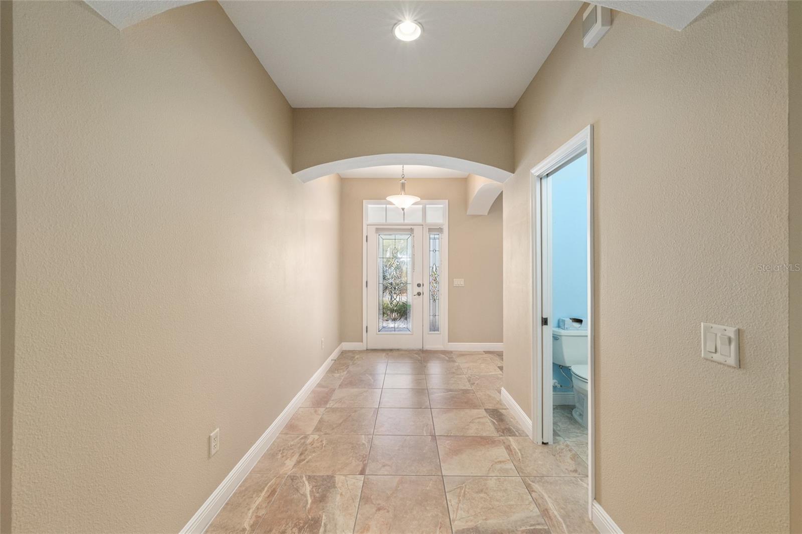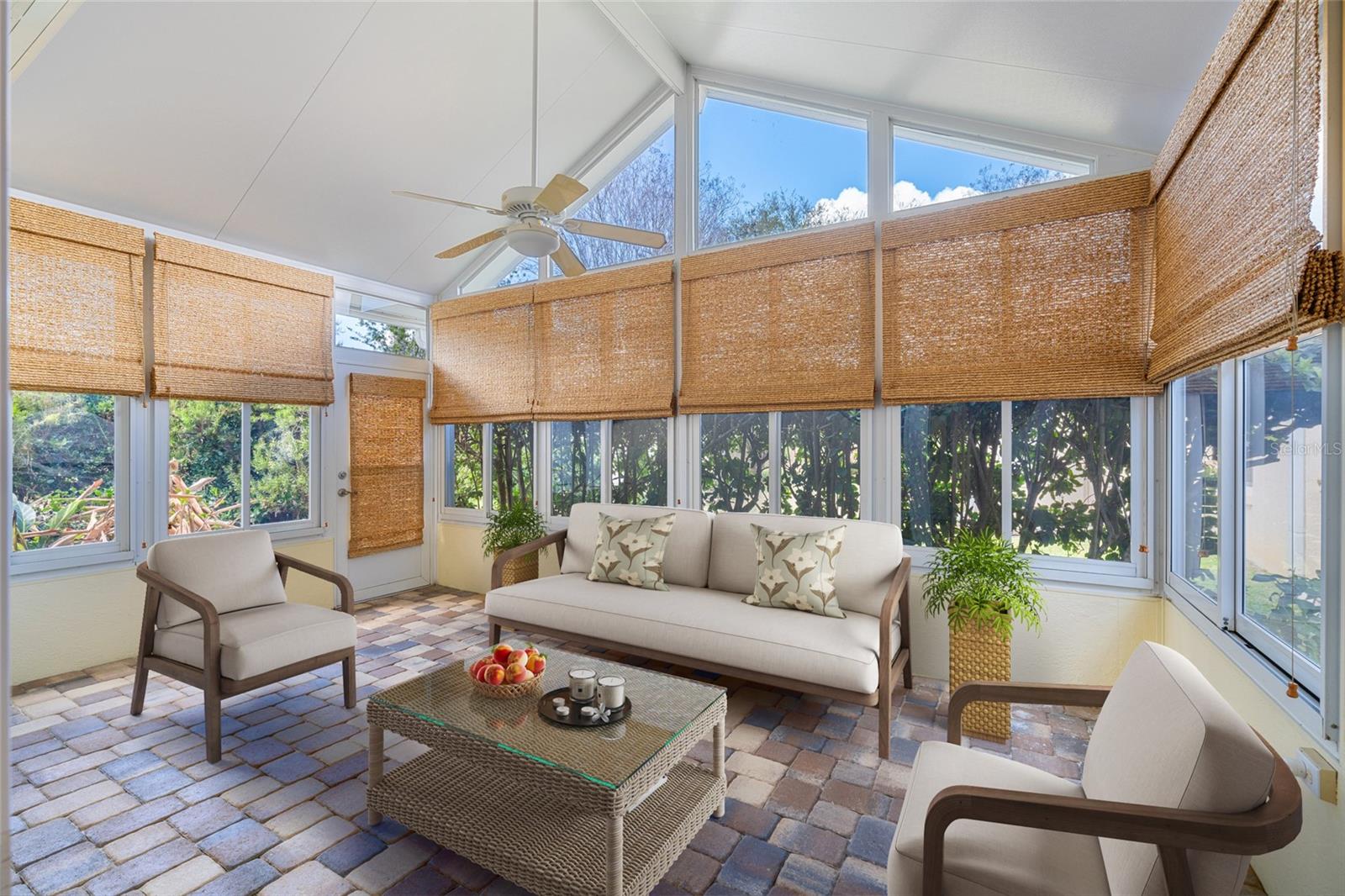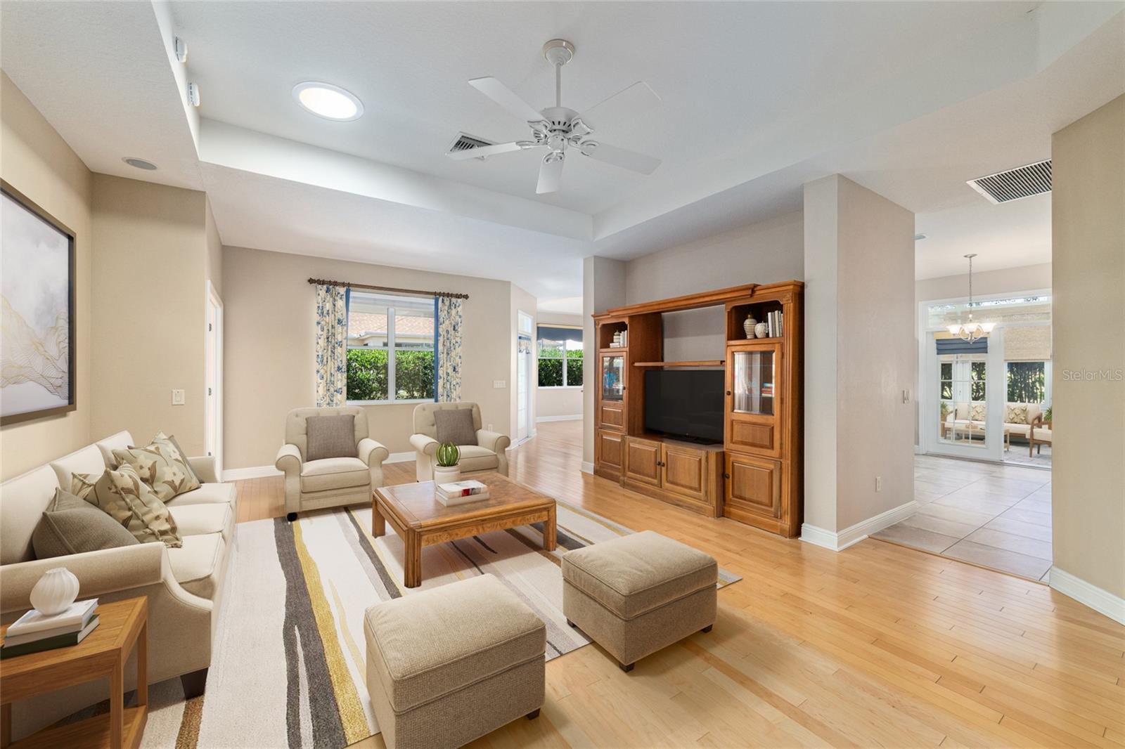 This updated Bridgeport Designer home with a golf cart garage is nestled on a quiet cul-de-sac in the VILLAGE OF BONNYBROOK, so close to everything The Villages! The home features three bedrooms, two full bathrooms, and a powder room conveniently located off the grand foyer. The entry showcases a beautiful, beveled glass front door with matching side light, welcoming you from the attractive paver driveway, sidewalk, and front porch. Upon entering, you'll enjoy a clear view straight through to the back of the house. In this split bedroom layout, two guest rooms at the front are connected by a Jack & Jill bathroom. The expansive living/great room includes a solar tube for natural light, while the dining room offers a tray ceiling. The generous kitchen is equipped with abundant cabinetry, and island and granite countertops. Adjacent to the kitchen, you'll find the Florida Room through French doors, which features paver stone flooring, acrylic windows, and a vaulted ceiling, plus a door leading out to the backyard. Off the dining room is a screened lanai, perfect for unwinding. The primary bedroom boasts double-door entry, engineered hardwood floors, a two-foot bump out and tray ceiling, and an elegant ensuite with dual vanities topped with granite, a dedicated makeup station, a spacious walk-in closet, and a Roman shower. There is a Tankless water heater, the Roof was replaced in 2022, the HVAC was replaced in 2015 and has been meticulously maintained. The seller is providing a 1-Year Broward Factory Service Home Warranty. This home is easy to show! Call now to schedule your visit to this beautiful home! ***Some photos have been virtually staged.***