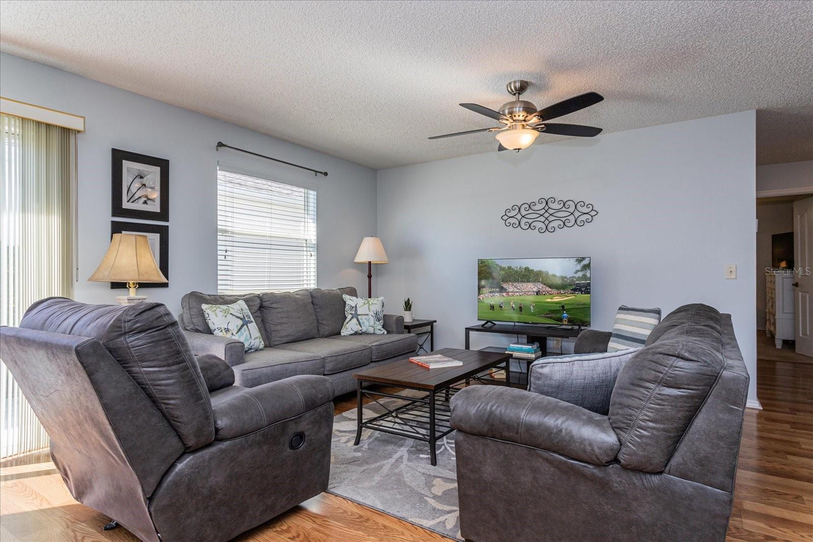 MOVE-IN READY! This adorable 2/2 Patio Villa is TURNKEY and there's NO BOND. Many Updates to Move Right In! Enjoy the Newer Contemporary Furnishings Throughout, with Plenty of Room to Entertain Large Gatherings or Share an Intimate Event. Laminate Flooring in Open Concept Living/Dining/Kitchen. New Lighting & Fans in Living Room/Master Bed/Bath/Kitchen and Newer Fans in Guest Bed/Enclosed, Tiled Front Patio, Complete with Heat & AC for Approx. 110 SF of Additional Entertaining Space! Kitchen Has Gas Appliances, Solar Light, Corian Countertops & Bar w/Integrated Double Sink for Easy Maintenance, Tiled Back Splash w/Inside Laundry Area & Pantry. Large Entertainment Area in Living/Dining Room w/ Access to Side Exterior Patio for Indoor/Outdoor Gatherings. Master Bedroom Boasts Plenty of Room w/ White Furnishings, King Bed, Large Walk-In Closet, Private Bath w/Shower & Separate Linen Closet. Guest Bedroom has Queen Bed & Large Closet for Good Addt. Storage. Both Bedrooms have Nice, Newer Neutral Carpeting. 1.5 Car Garage Fits Both your Vehicle and a Golf Cart Comfortably! Updated Landscaping. Great Area Convenient to Spanish Springs, The Polo Fields, Lake Sumter & Both the 441and 466 Shopping & Medical Corridors. Roof 2020, AC 2017, HWH 2023. INVESTORS DREAM!