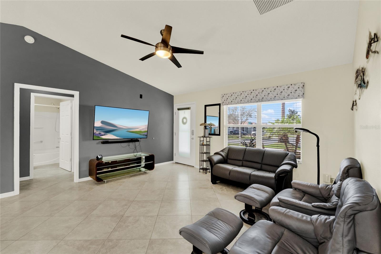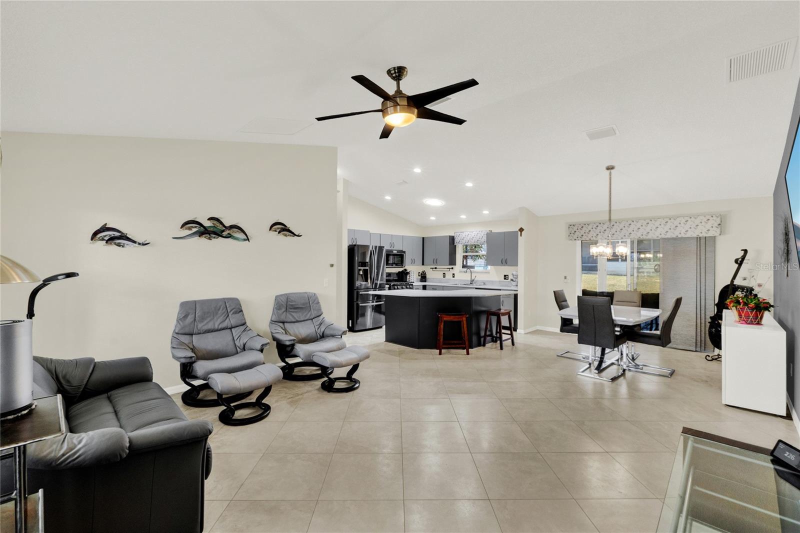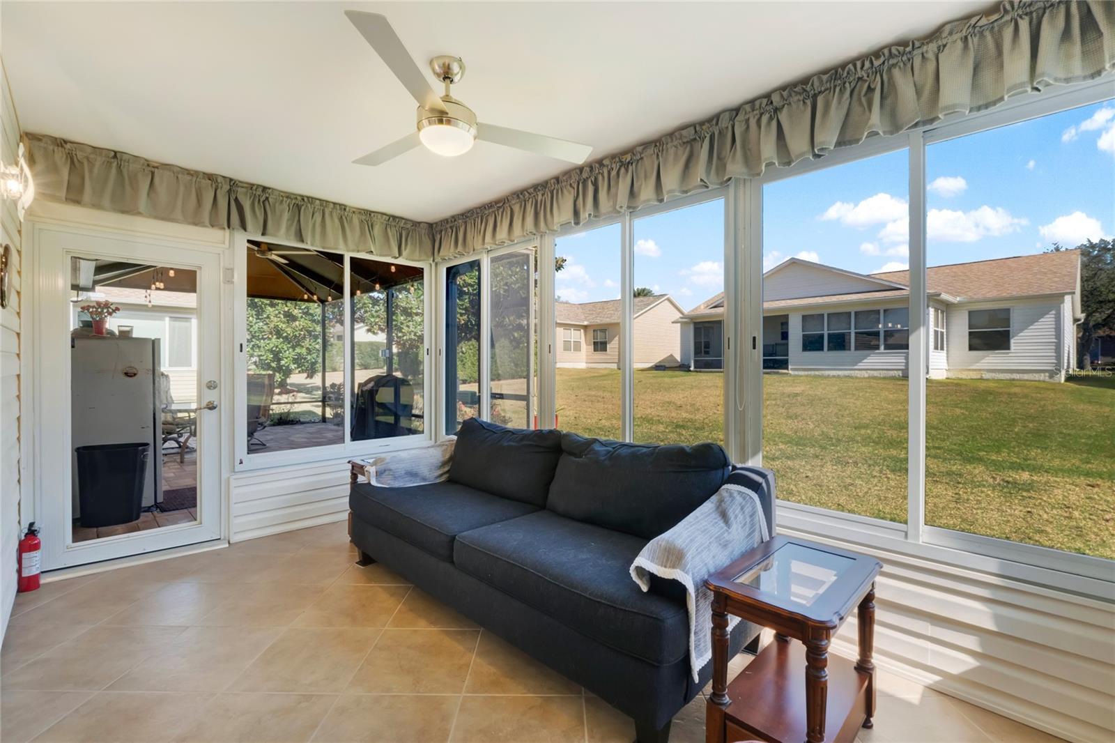 Welcome to your dream home with NO BOND, nestled in the highly sought after VILLAGE OF DUVAL! With 3 spacious bedrooms and 2 full bathrooms, this stunning AMARILLO model home has been meticulously maintained and is ready for its new owners to enjoy! Boasting over 1,500 square feet of living space, this stunning property was thoughtfully designed for comfort and convenience. 1-YEAR AMERICAN HOME SHIELD WARRANTY INCLUDED! Step inside this spacious and inviting residence and prepare to be captivated by a tastefully updated, open-concept floorplan. With stainless steel appliances and ample cabinet space, the well-appointed kitchen effortlessly connects to the adjoining dining area, fostering a seamless and inclusive environment for entertaining and everyday living. Featuring 3 solar tubes, the vaulted ceilings allow natural light to flood through the home, creating a bright and cheerful atmosphere. Showcasing a delightful combination of coziness and practicality, this exceptional property offers beautiful ceramic tile flooring throughout the entire home, enhancing its natural radiance. The free-flowing living and dining area provides the perfect space for hosting gatherings or unwinding after a long day. From the living area to the fully enclosed lanai, prepare to fall in love with the warm and welcoming atmosphere in the outdoor oasis. The oversized birdcage with a canvas cover invites you and your loved ones to relax outdoors, regardless of the elements. Boasting an attractive curb-appeal, a two-car garage, two recently remodeled bathrooms, a screened-in front porch, accessible features, and so much more, this exquisite home is the perfect blend of timeless charm and functionality. The primary suite is a true retreat, complete with dual walk-in closets and a luxurious en-suite bathroom equipped with accessible features, and an amazing glass-enclosed shower. The split floor-plan design allows guests to have their own privacy, with direct access to the lanai from the second bedroom. Located in one of The Villages’ most desirable neighborhoods, this home is perfect for those seeking a vibrant, active lifestyle. Enjoy access to world-class amenities, golf courses, recreation centers, and social activities just moments from your doorstep. Whether you’re relaxing indoors or exploring the community, this home offers the ideal balance of style, convenience, and fun. Don’t miss the opportunity to make this home yours! Schedule a showing today and experience all this home and The Villages lifestyle have to offer.