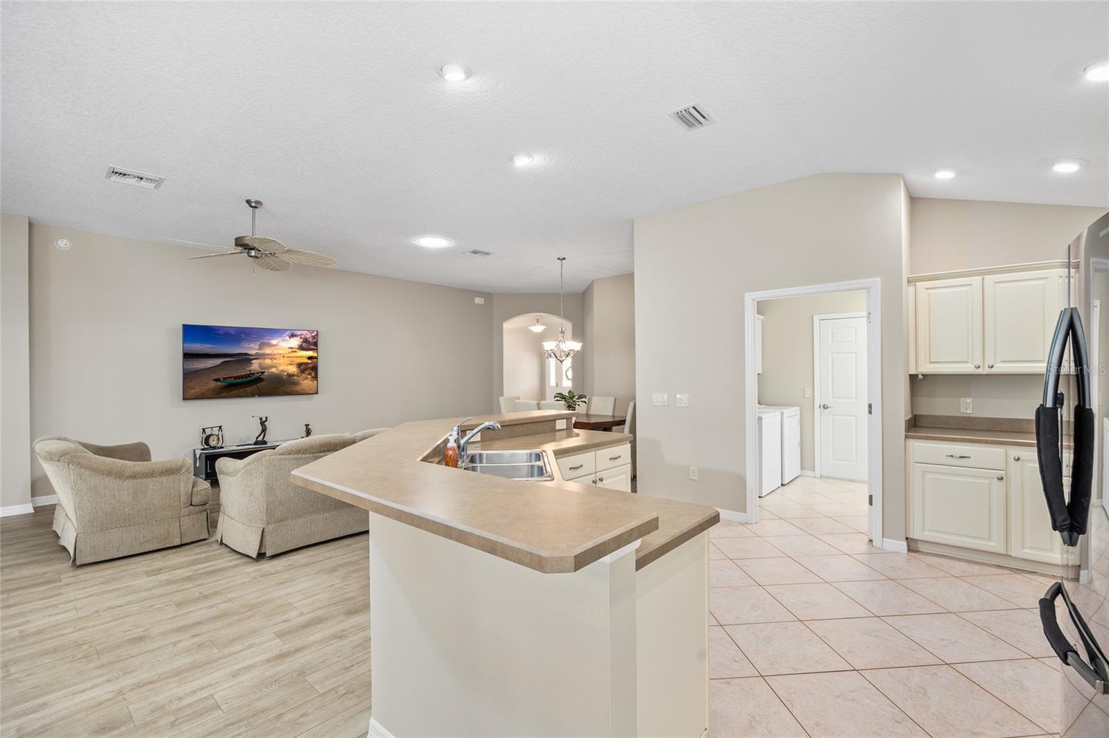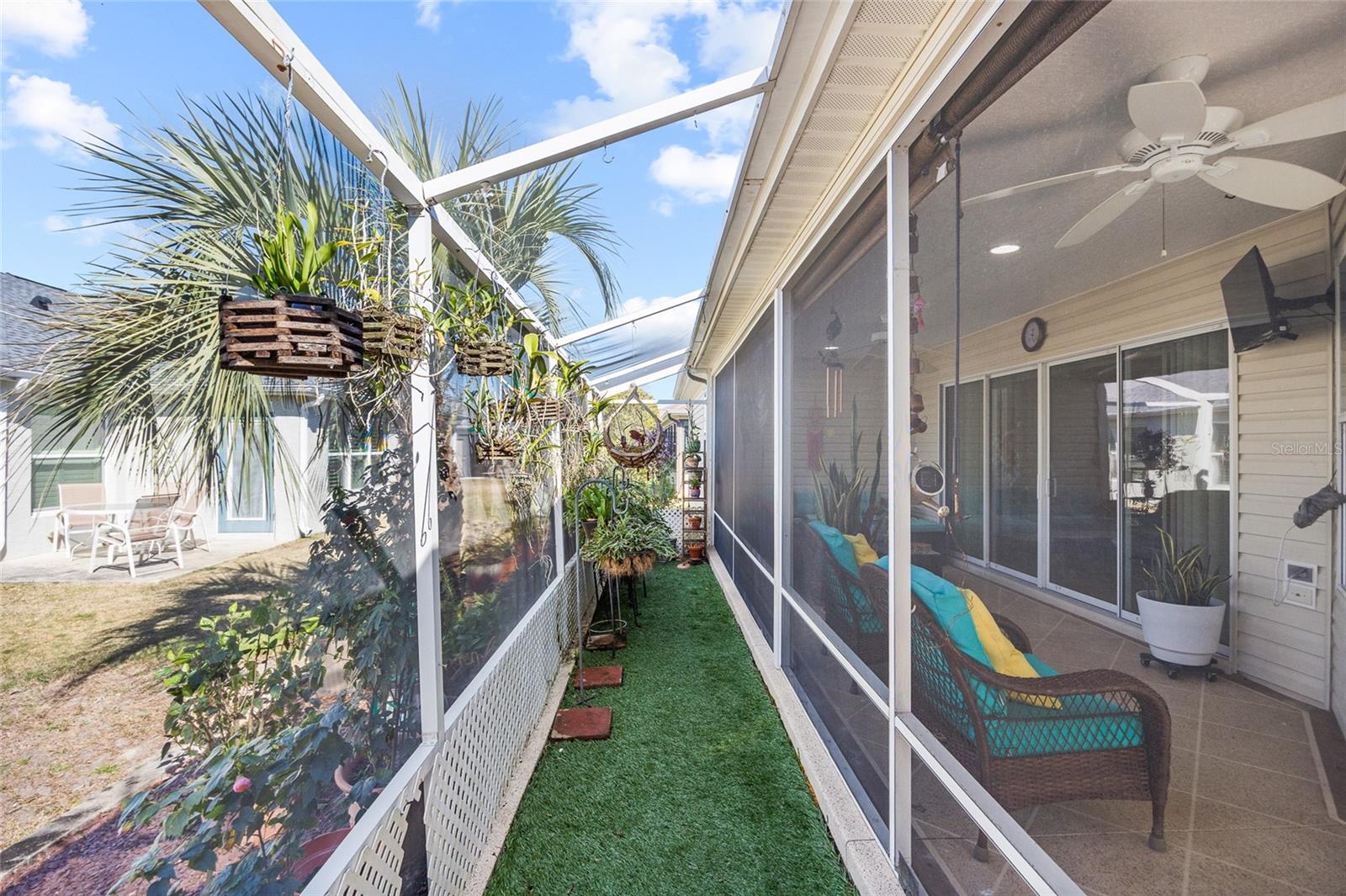 Welcome to this well-appointed Lilac model home located in The Villages, a premier 55+ retirement community. Offering 1,956 square feet of thoughtfully designed living space, this three-bedroom, two-bath residence features an open layout that is both spacious and functional and has been freshly painted throughout the interior. The large kitchen is ideal for entertaining, with a generous breakfast bar, ample cabinetry, and tile flooring that continues through the wet areas, including the kitchen and baths. Laminate flooring runs throughout the main living areas and bedrooms for a clean, cohesive look. The primary suite provides a comfortable retreat with a walk-in shower, dual vanities with spacious countertops, a large walk-in closet, and a pocket door for the water closet. The oversized laundry room includes cabinet storage for added convenience. A standout feature of this home is the expansive screened-in back porch, along with a unique, separately partitioned screened area perfect for plant enthusiasts. This additional space is fully enclosed with its own screening and offers flexibility for gardening, hobbies, or relaxing year-round. The home includes a two-car garage plus a dedicated third garage bay for a golf cart. The water heater was replaced in 2025. Conveniently located just steps from a community pool, this home offers an exceptional opportunity to enjoy the lifestyle and amenities The Villages is known for. Schedule your private showing today.