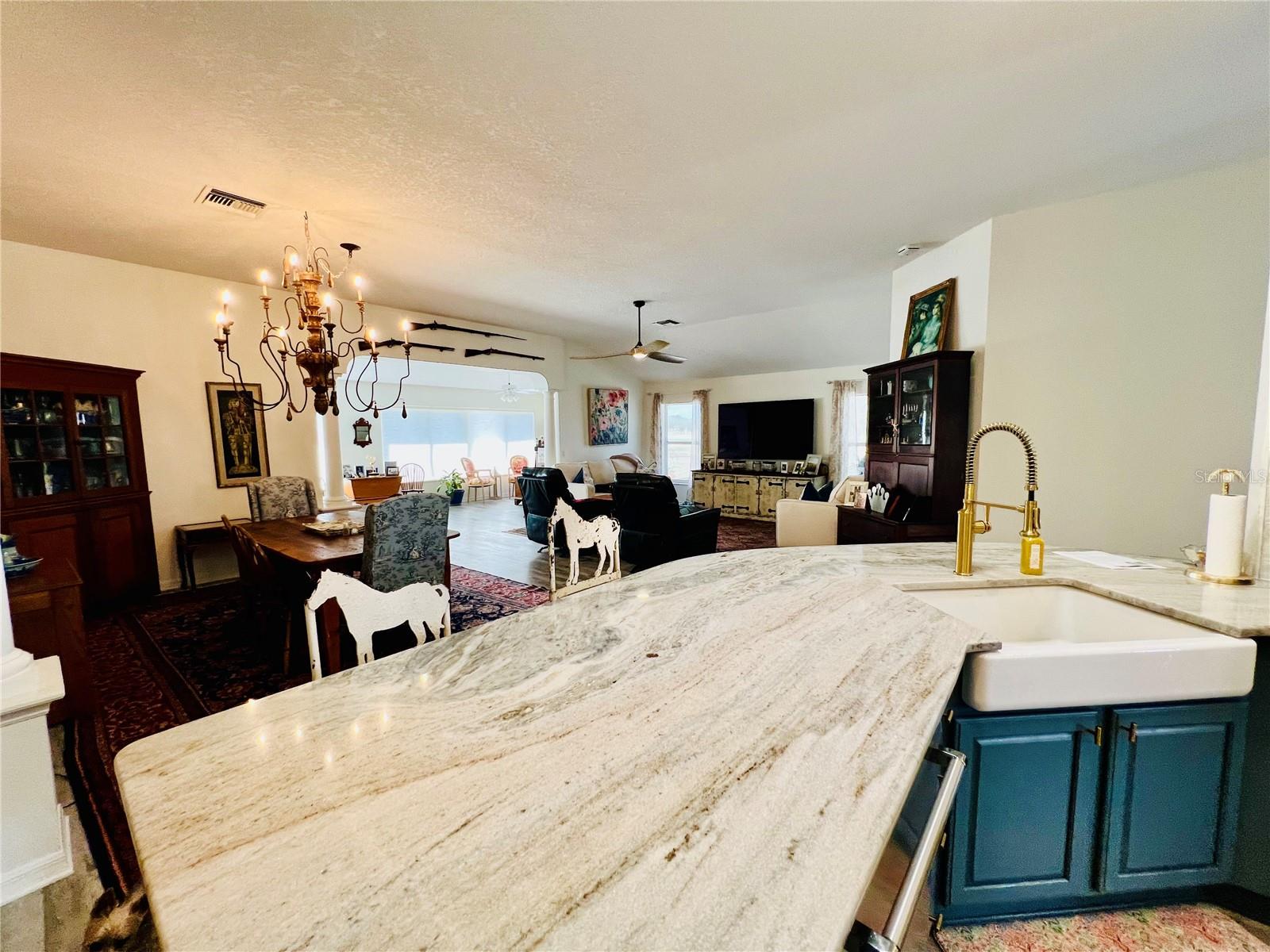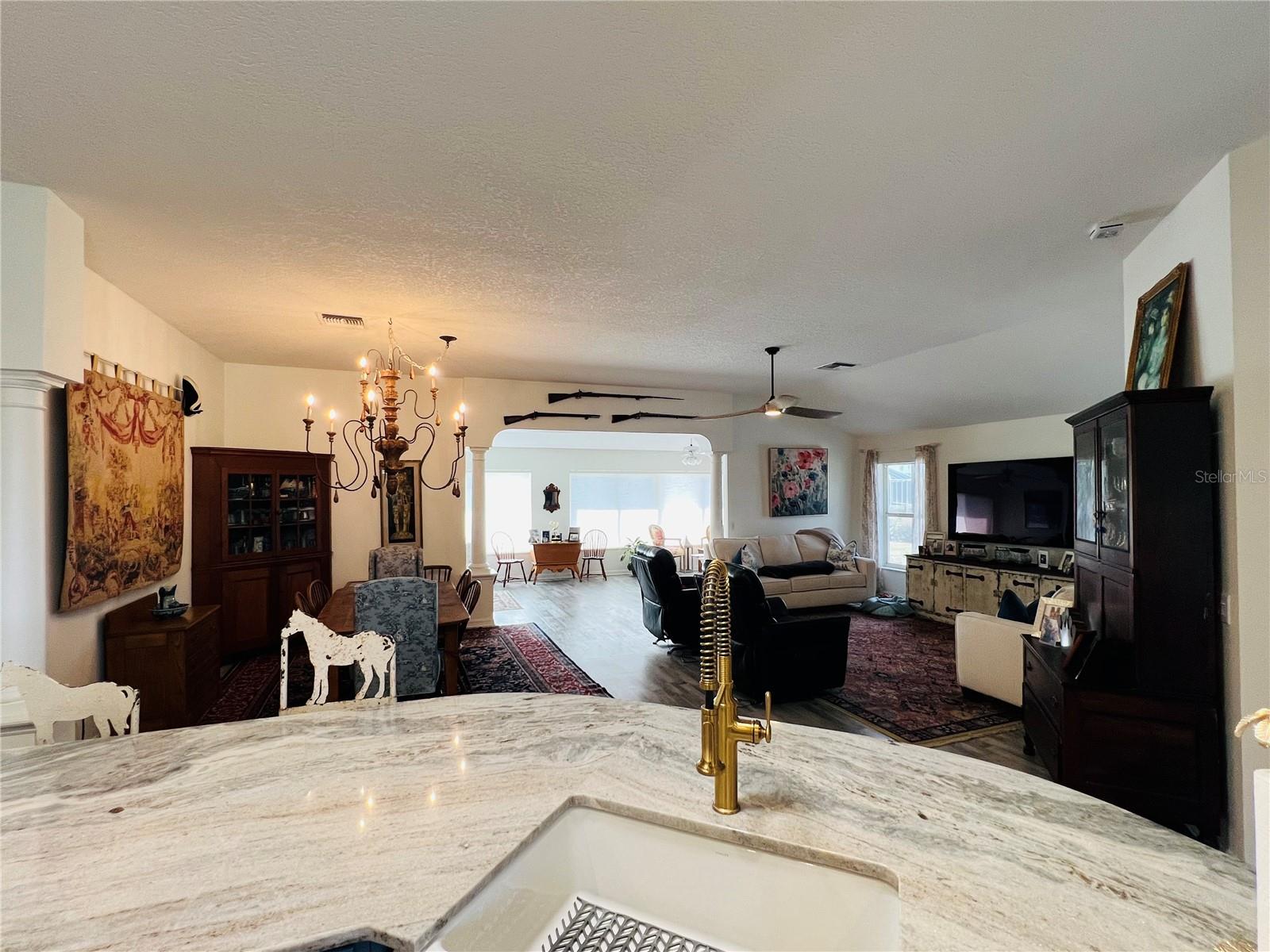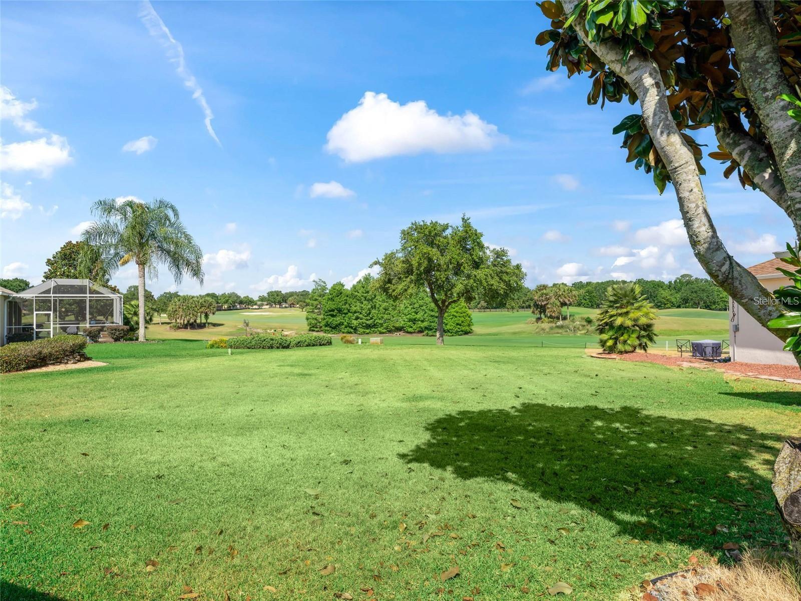 Fore!! Your Villages of dream is within range. Grab your golf cart and park it in front of your 3-bedroom, 2-bath highly sought-after Gardenia model home with stretched floorplan on a cul-de-sac in Polo Ridge. You’ll love the panoramic golf views on the 7th hole of the Stirrup Cup Championship Golf Course. Tropical landscaping and new exterior lighting greets you as you enter the custom stamped concrete driveway and approach the covered walkway to the front door. Upon entering, you’ll be greeted by high ceilings and an open floor plan that allows for endless options as you host guests eager to indulge with you in this Florida lifestyle. The owner hit a birdie with the continuous luxury vinyl plank flooring throughout the entire home. Natural light flows through huge double-pane windows in the front of the home, providing the perfect amount of sunshine and tropical views. Travel through the open concept to the extended air-conditioned Florida Room and lush getaway out back. Natural Florida awaits with a well-landscaped backyard, perfect for taking in those amazing golf course views from your brand-new expansive screened-in lanai with a cement slab and Sierra slate pavers on top. Your eyes won’t know whether to fixate on the show-stopping backyard or the modern kitchen under your fingertips. From sleek granite countertops and a continuous backsplash to the light, stylish wood cabinets, gold hardware, and under-cabinet lighting, this kitchen will be the heart of your new home. The oversized island, with seating for at least six, has a two-tone effect that compliments the stainless steel appliances, white matte convection oven, under mount sink, and eat-in area. Imagine family gatherings in the open great room, creating one large space for time with loved ones. Like a shiny new set of clubs, when you retire home, you have options! The split floor plan offers the privacy of the primary suite on one side and two additional bedrooms on the other. Even if you hit bogeys all day, you’ll find refuge in your spacious primary suite, complete with a relaxing en suite bathroom featuring a walk-in shower, new granite countertops, and two under mount sinks. You’re going to love the two brand-new custom-tailored walk-in closets. Two spacious guest rooms offer space to relax, with plenty of windows to welcome that morning sun. The guest bathroom features an updated vanity with a granite top, under mount sink, and a soaking tub/shower combo. You’ll be hitting way above your handicap with this one. Updates include a newer roof and three skylights (2020), Rheem tankless water heater (2019), new fans and lighting (2025), updated Eaton Power Panel, new paint inside and out, and the bond is paid! The extended garage offers plenty of storage for your golf cart and those shiny new clubs you’re going to need. Just a chip shot away are endless sunsets from your backyard or at any of the famous Village Town Squares. Short drive to the Southern Trace shopping area & across the street from the polo fields. Act fast, because this home is an ace in the hole and won’t last long!