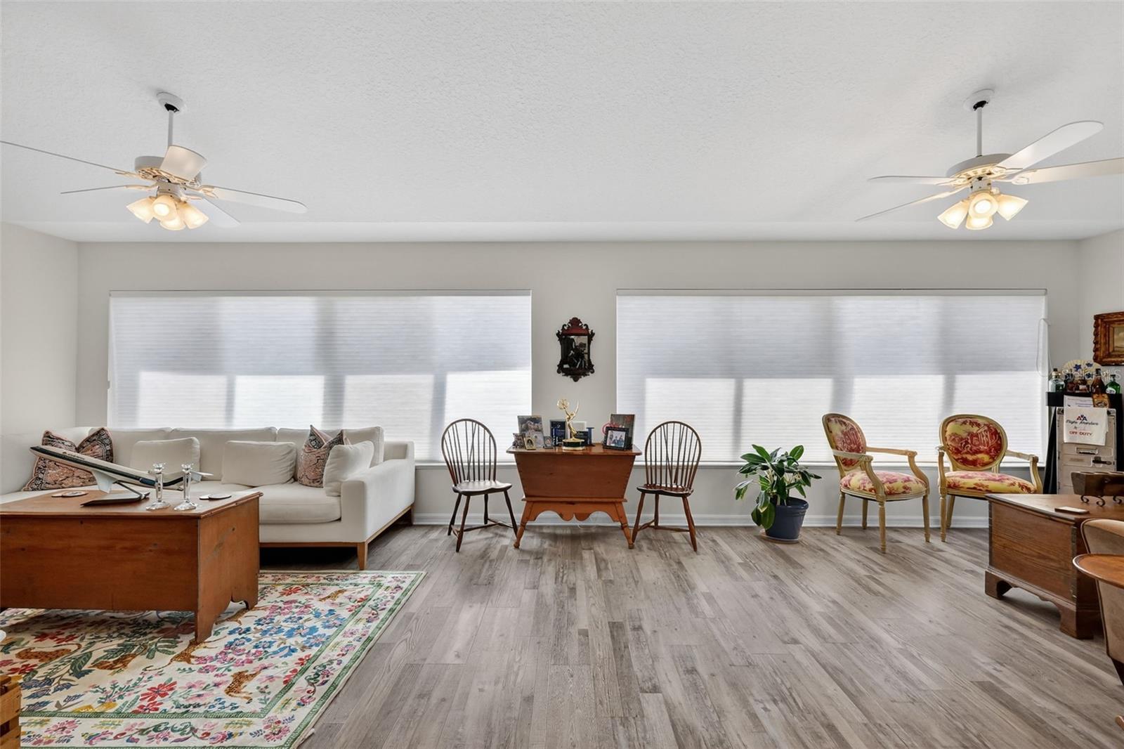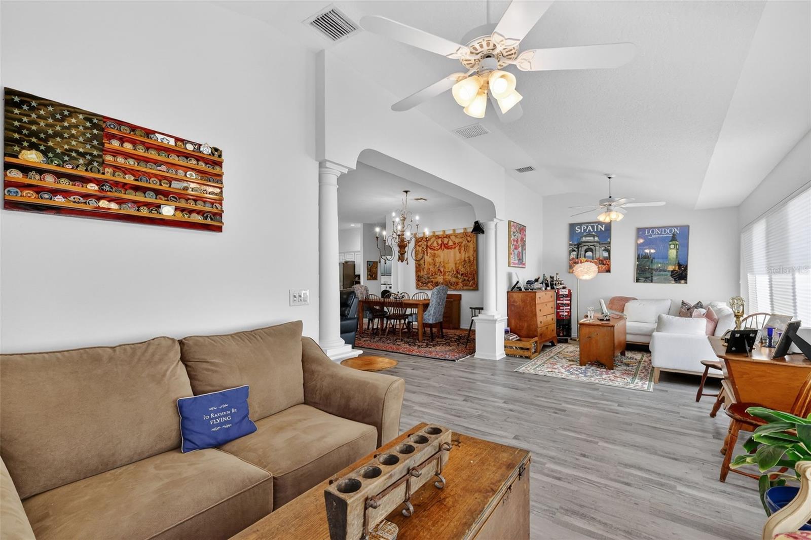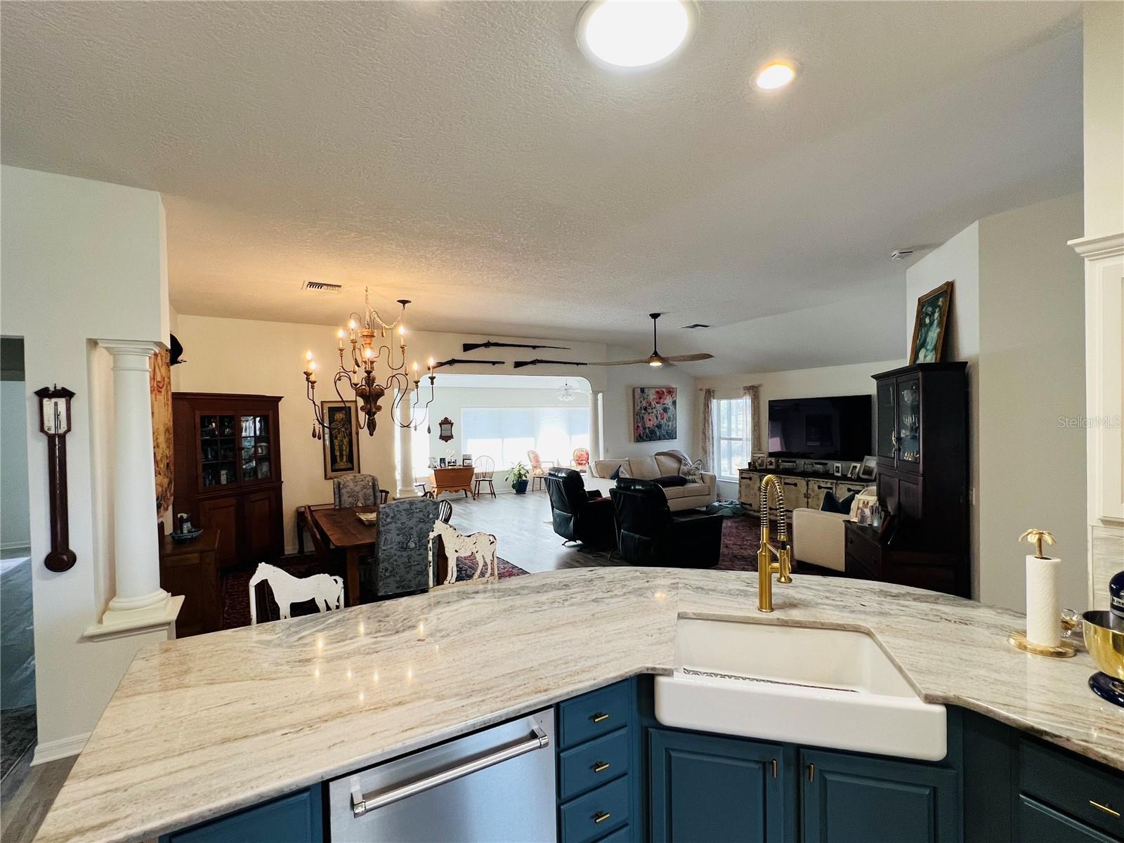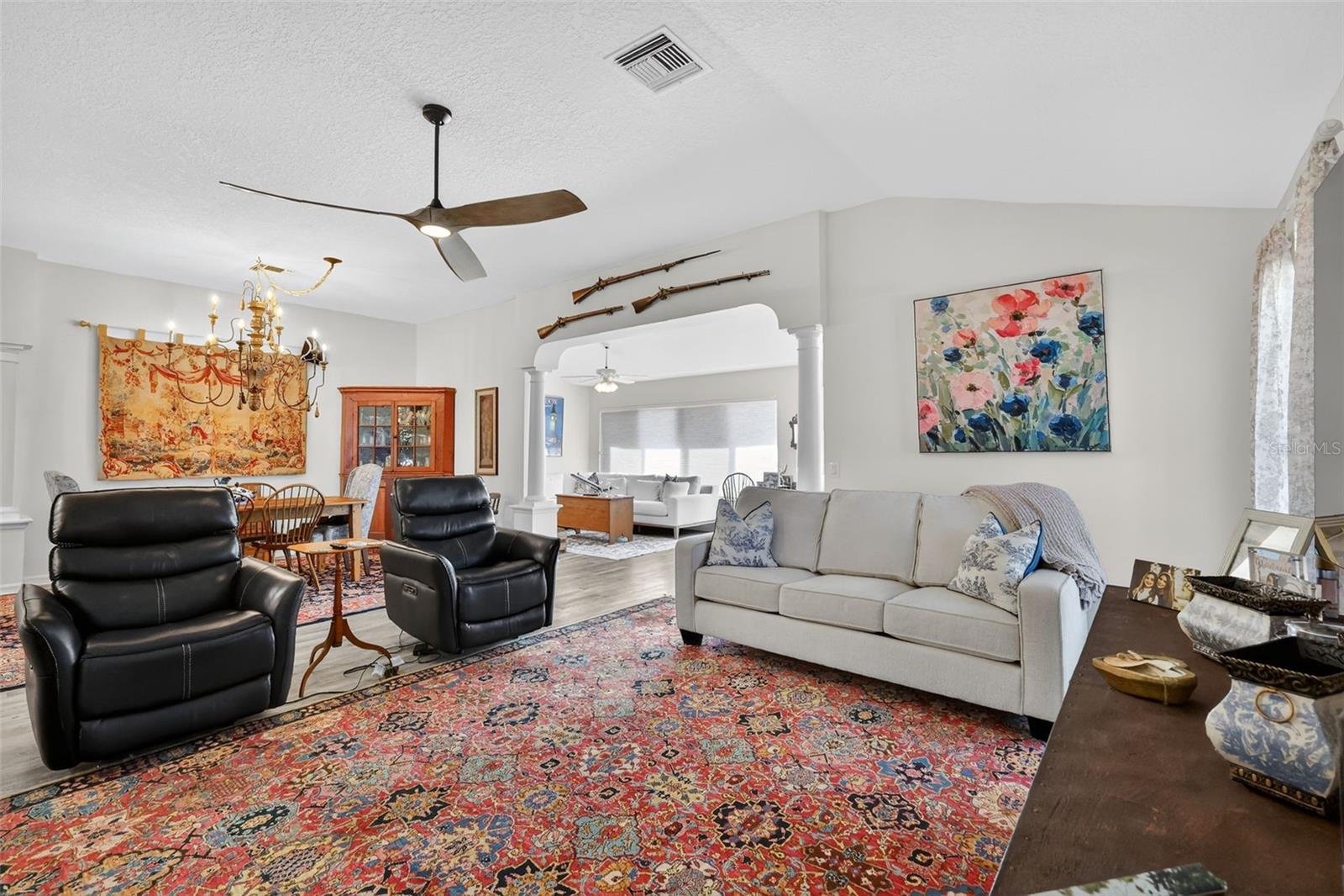 Fore!! Your Villages of dream is within range. Grab your golf cart and park it in front of your 3-bedroom, 2-bath highly sought-after Gardenia model home with stretched floorplan on a cul-de-sac in Polo Ridge. You’ll love the panoramic golf views on the 7th hole of the Stirrup Cup Championship Golf Course. Tropical landscaping and new exterior lighting greets you as you enter the custom stamped concrete driveway and approach the covered walkway to the front door. Upon entering, you’ll be greeted by high ceilings and an open floor plan that allows for endless options as you host guests eager to indulge with you in this Florida lifestyle. The owner hit a birdie with the continuous luxury vinyl plank flooring throughout the entire home. Natural light flows through huge double-pane windows in the front of the home, providing the perfect amount of sunshine and tropical views. Travel through the open concept to the extended air-conditioned Florida Room and lush getaway out back. Natural Florida awaits with a well-landscaped backyard, perfect for taking in those amazing golf course views from your brand-new expansive screened-in lanai with a cement slab and Sierra slate pavers on top. Your eyes won’t know whether to fixate on the show-stopping backyard or the modern kitchen under your fingertips. From sleek granite countertops and a continuous backsplash to the light, stylish wood cabinets, gold hardware, and under-cabinet lighting, this kitchen will be the heart of your new home. The oversized island, with seating for at least six, has a two-tone effect that compliments the stainless steel appliances, white matte convection oven, under mount sink, and eat-in area. Imagine family gatherings in the open great room, creating one large space for time with loved ones. Like a shiny new set of clubs, when you retire home, you have options! The split floor plan offers the privacy of the primary suite on one side and two additional bedrooms on the other. Even if you hit bogeys all day, you’ll find refuge in your spacious primary suite, complete with a relaxing en suite bathroom featuring a walk-in shower, new granite countertops, and two under mount sinks. You’re going to love the two brand-new custom-tailored walk-in closets. Two spacious guest rooms offer space to relax, with plenty of windows to welcome that morning sun. The guest bathroom features an updated vanity with a granite top, under mount sink, and a soaking tub/shower combo. You’ll be hitting way above your handicap with this one. Updates include a newer roof and three skylights (2020), Rheem tankless water heater (2019), new fans and lighting (2025), updated Eaton Power Panel, new paint inside and out, and the bond is paid! The extended garage offers plenty of storage for your golf cart and those shiny new clubs you’re going to need. Just a chip shot away are endless sunsets from your backyard or at any of the famous Village Town Squares. Short drive to the Southern Trace shopping area & across the street from the polo fields. Act fast, because this home is an ace in the hole and won’t last long!