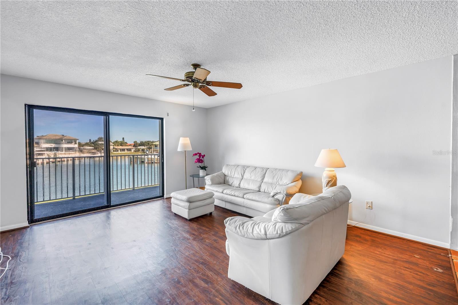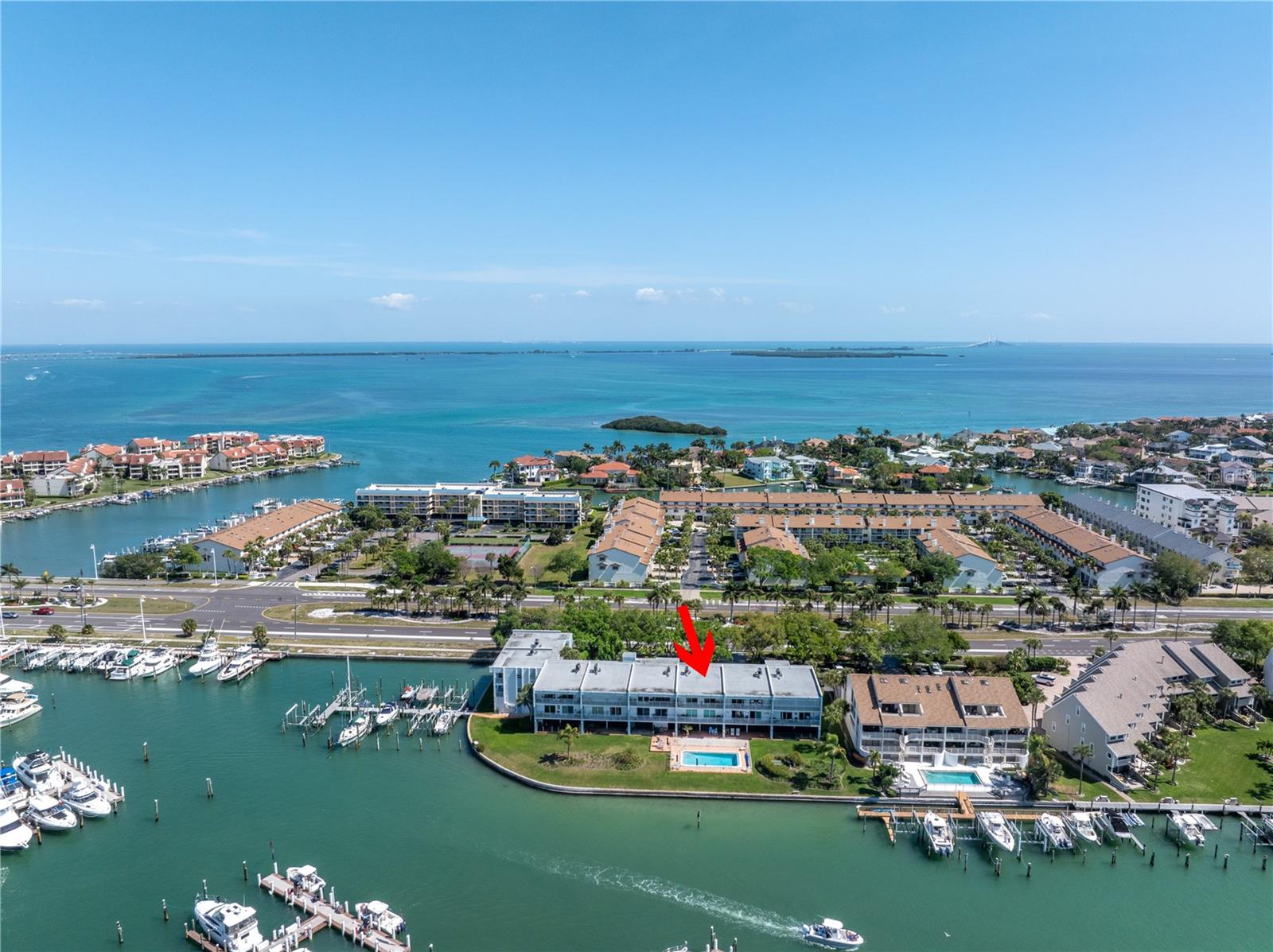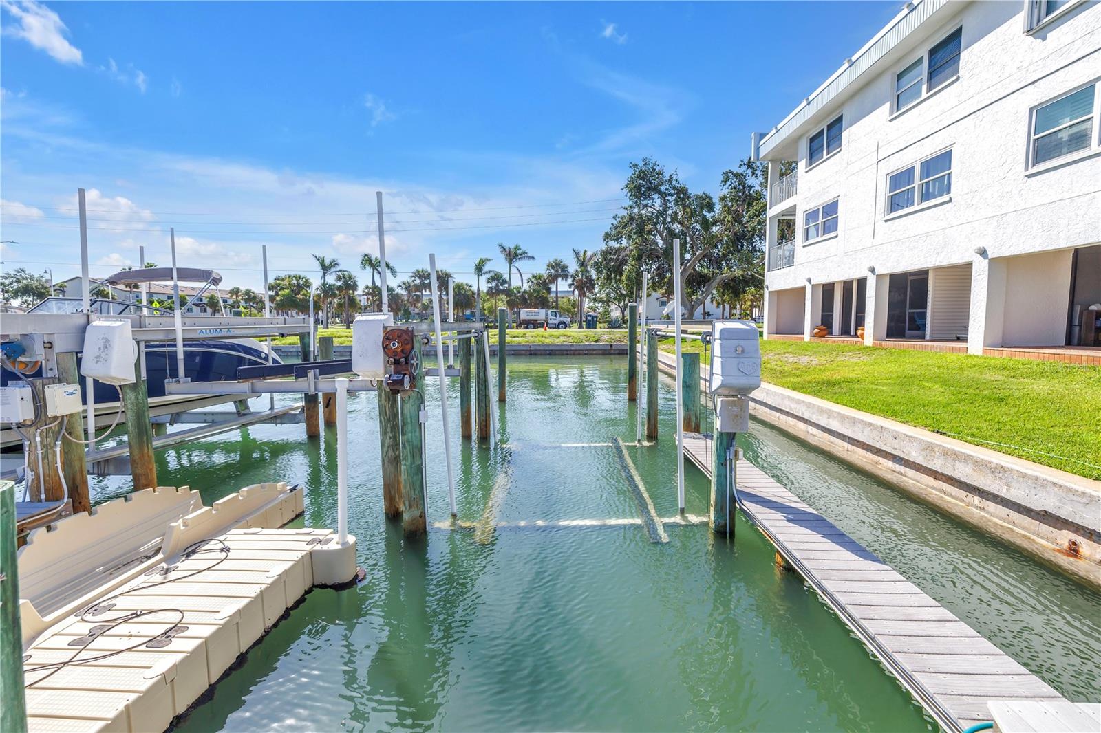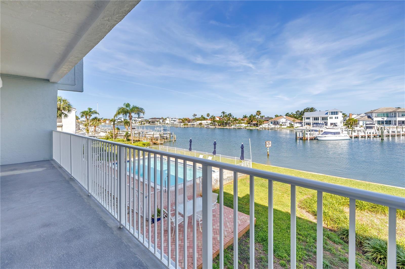 Endless potential and stunning water views await in the Yacht Haven community of Tierra Verde! This spacious 2 bedroom, 2 full bathroom waterfront condo with a boat slip and lift offers a rare opportunity to create your ideal coastal retreat. Step inside and you're greeted by the kitchen, which opens into the dining area accented by classic Saltillo tile flooring and a wood-accent wall that adds character and warmth. Just beyond, the living area features vinyl plank flooring and large sliding glass doors that fills the space with natural light and lead to a private balcony overlooking the Tierra Verde Grand Canal. Perfect for morning tea or enjoying the breathtaking sunsets. The thoughtful split floor plan places the guest bedroom and full guest bathroom toward the front of the unit, offering comfort and privacy for visitors. Tucked away at the back, the primary suite serves as a peaceful retreat with its own balcony access, a walk-in closet, and an updated en-suite bath. A standout bonus is the approx 600 sq ft ground-floor, cabana-style flex space (non-heated), which includes an enclosed area with sliding glass doors leading to a screened lounge space and an open-air deck just steps from the pool. Perfect for hobbies, storage, or simply unwinding by the water. Yacht Haven is a boater’s dream, featuring a heated pool, lush mature landscaping, Port 32 Marina Tierra Verde right across the canal with a fueling station for quick access to the Gulf and just minutes from shopping, dining, and some of the best beaches the Gulf Coast has to offer. Whether you're seeking a weekend escape, a renovation project, or full-time waterfront living, this is your chance to create something truly special. Bring your vision; waterfront living starts here.