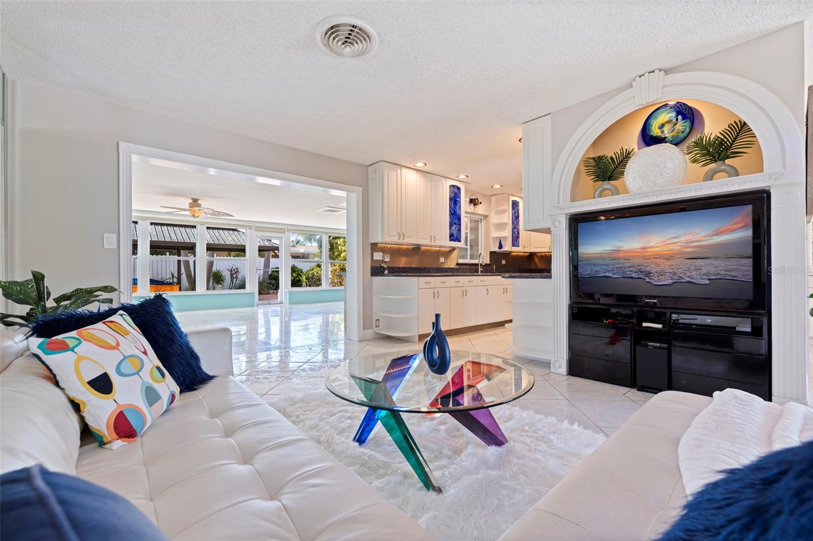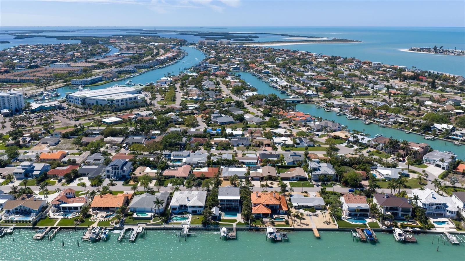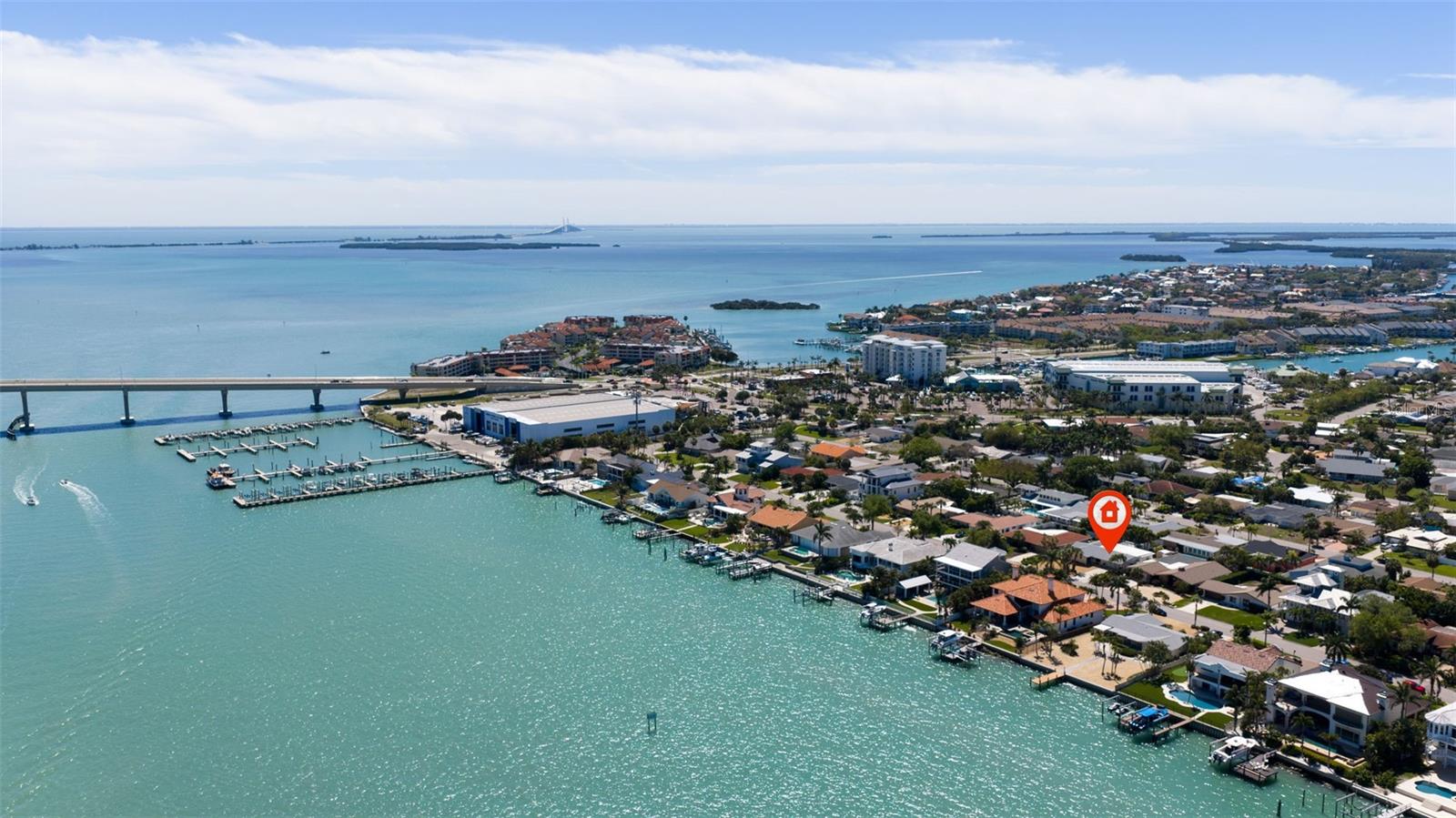 One or more photo(s) has been virtually staged. MID-CENTURY … MODERN … and MAGICAL! From the iconic Sailfish mailbox – a Tierra Verde landmark – to the colorful Chihuly-like handblown glass doorknobs and cabinet pulls throughout this amazing residence, you will be enchanted by the creativity and charm found in this unique and artsy one-level ranch home. With a base elevation of 9-ft, this home did not take on water during the 2024 storm season. This solid block construction home has room for a pool and is located on one of the most desirable streets on the island … directly across from multi-million-dollar waterfront homes on Boca Ciega Bay. Lovingly and meticulously designed for island living, relaxing and entertaining … no detail has been spared! As you enter through sleekly styled turquoise double doors, you’ll be impressed with the custom built-in design features that flow throughout the property: A dining cabinet that spans the entire wall with glass display cabinets and LED lighting, an entertainment unit complemented with embossed crown molding and interior lighting; and a coastal kitchen with navy blue flecked stone counters, quality cabinets and pantry space with pull-out shelves, a stainless steel backsplash, matching stainless appliances and under cabinet lighting. Recent upgrades include a Trane HVAC (2025), a hot water heater (2020) and a brand-new epoxy floor in the garage. A 660 sq-ft addition to the back of the home (2017) with its own mini-split heat pump system provides tons of extra entertaining space and features a wall of windows that bring the outdoor oasis inside. The flooring is gorgeous beige honed and filled Travertine tile … beachy, beautiful and easy to maintain. A wet bar and second stainless refrigerator accompany light Ash cabinets with pull-out drawers and interior lighting, whimsical blown-glass cabinet pulls embedded with fish and coral, and sea-life art tiles to frame out the backsplash! Both full baths (the primary bath is ensuite) mirror the modern feel and celebrate the sea: Glass shower doors with fish, sea turtles and undersea foliage and unique eclectic lighting fixtures. The primary bedroom in the back of the home features a laminate wall system that houses a California-King platform bed, dual nightstands with pull-out shelves, interior LED lighting and storage bins. Two other bedrooms in the front of the home have built-in closet systems and porcelain tile floors. A lush, private shaded backyard (with space for a pool) features a brick lanai with gazebo, two large storage sheds, an outdoor shower, and is bordered with native plantings and flower beds. The yard has landscape stone everywhere … no grass to cut! A 2-car garage connects with a massive workshop space, providing a sanctuary for artisans and craftsmen. Fully airconditioned, the garage and workshop can be utilized year-round. TIERRA VERDE IS A SPECTACULAR ISLAND PARADISE tucked quietly away with easy access to everywhere … Head west within minutes to award-winning Gulf beaches, tiki bars and fun beachside attractions. Only a 10-minute drive to downtown St. Pete with its cultural attractions, sports venues, entertainment and fabulous restaurants. Fort DeSoto, offering an array of sugar sand beaches, fishing, camping, kayaking and miles of nature trails, is right down the Pinellas Bayway! And it’s only 30-40 minutes via I-275 to both international airports: TPA and SRQ. Schedule a showing today for an opportunity to own this unique and creative piece of paradise.