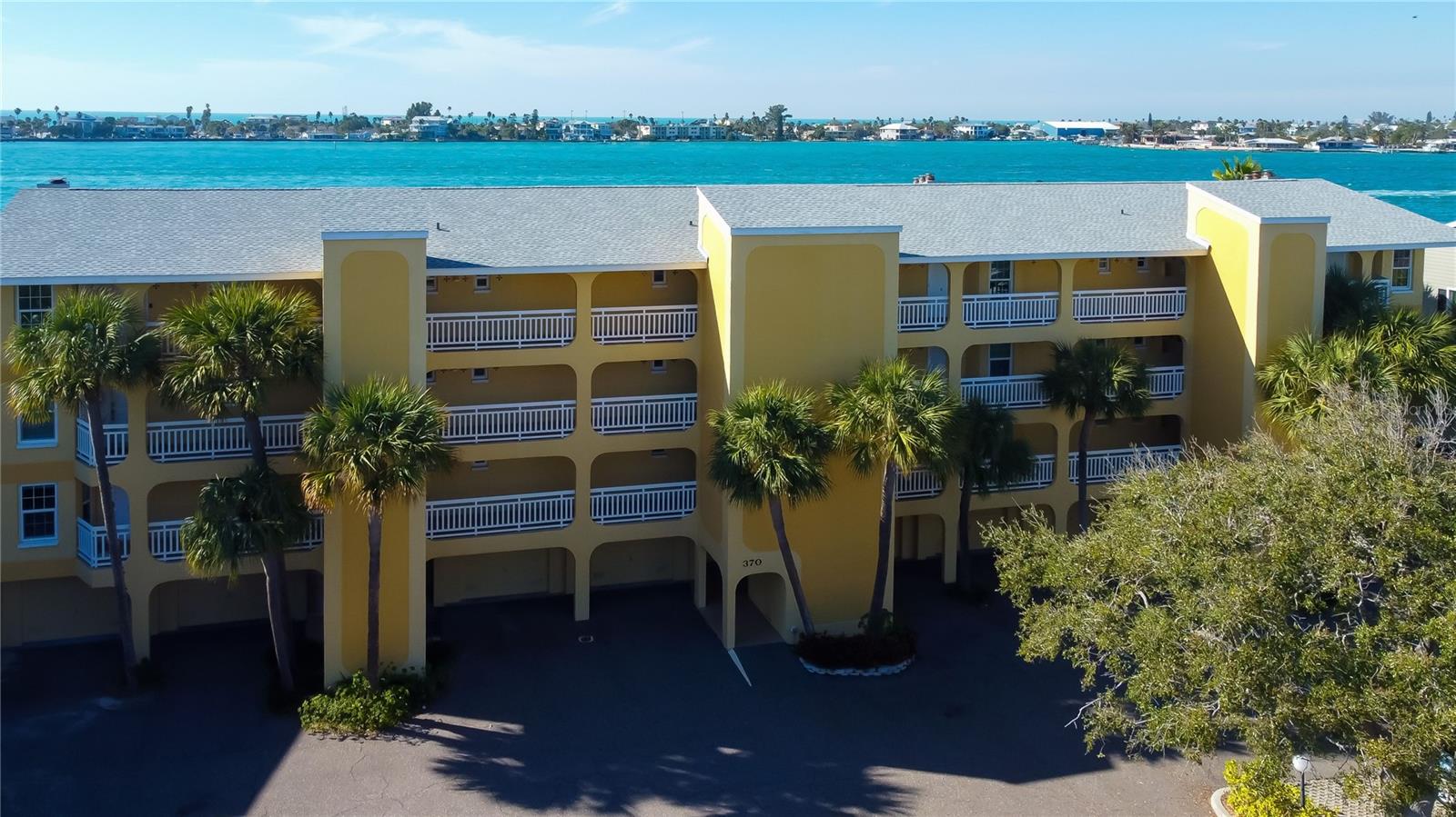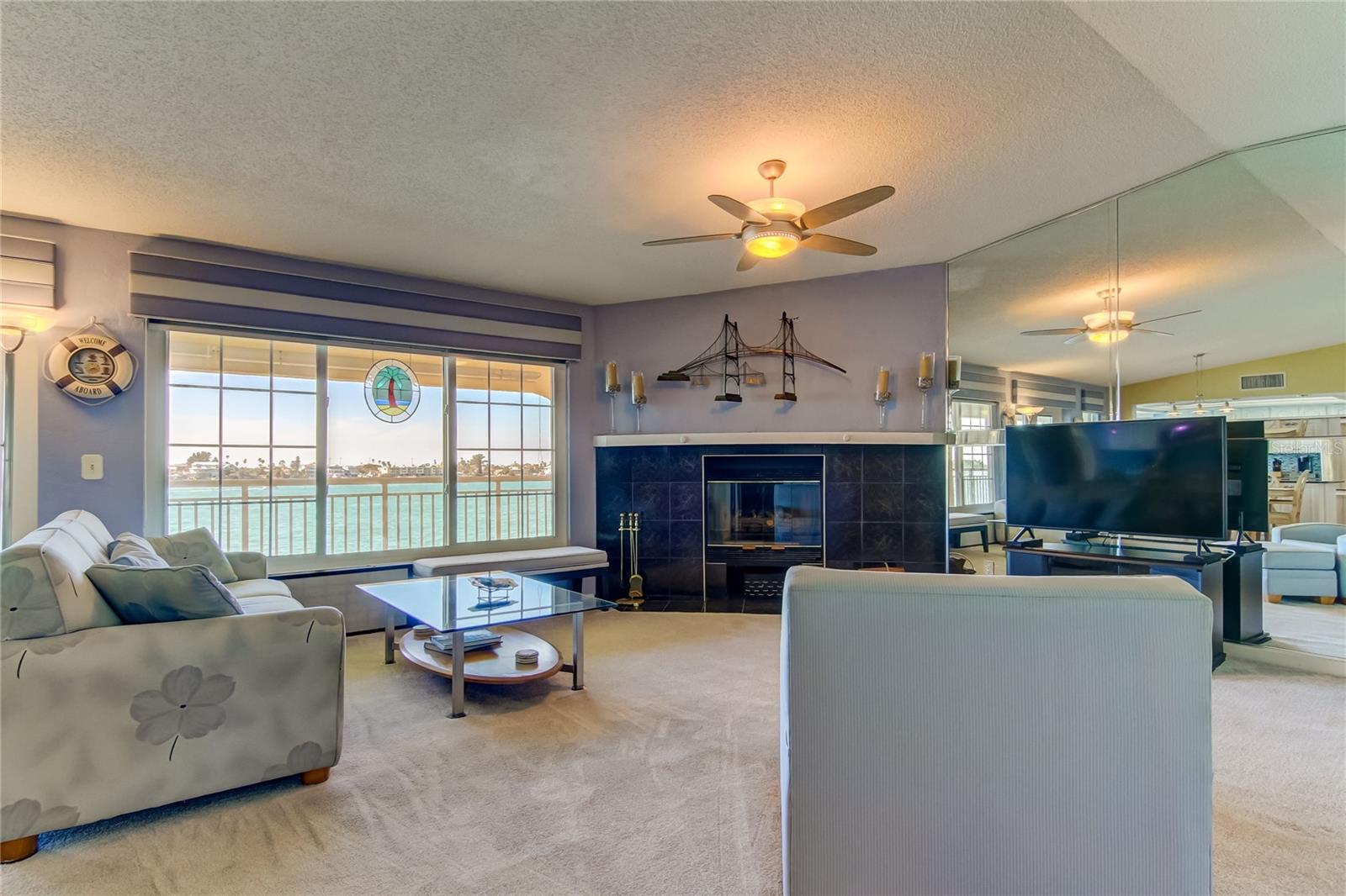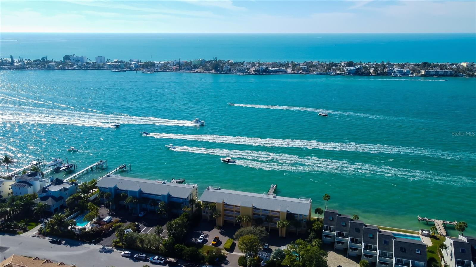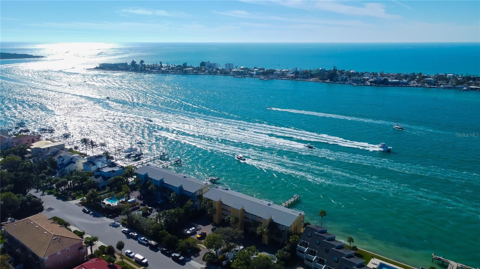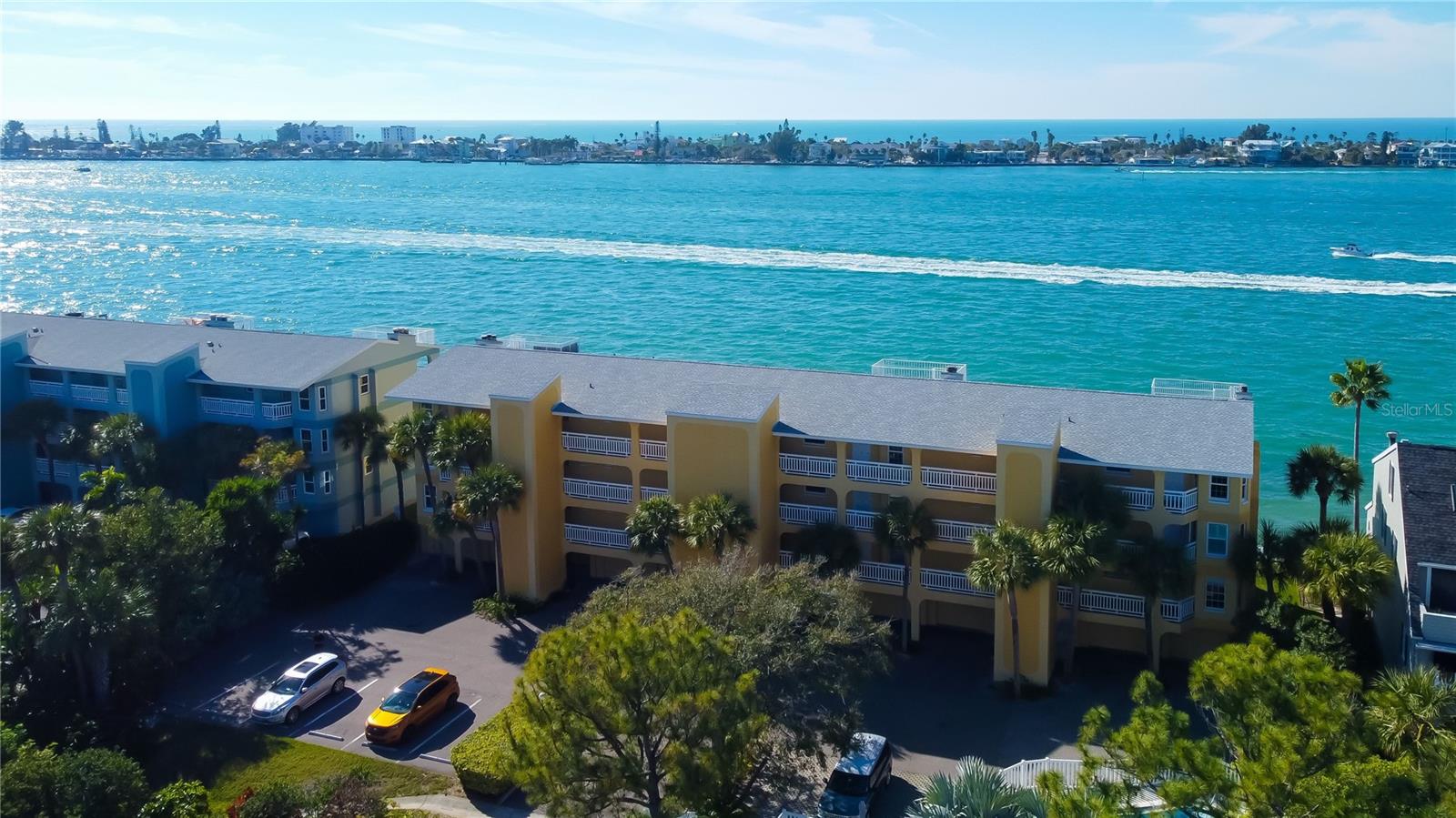Mesmerizing views of the Pass-A-Grille Channel & Don Cesar Resort in Tierra Verde, with no bridges to the Gulf of Mexico. This is Paradise Living with evening sunset views from your westerly facing covered private 50' balcony. Much sought after Blue Water Bay top floor condo with a spiral staircase to your own private Sun Deck. You will rarely find a garage in a condo property, but this is your Lucky Day - all on one level condo AND your own garage! Your living room/dining room/kitchen open concept space has a working wood burning fireplace with double doors to the balcony. Both bedrooms have ensuite baths. The Master bedroom also has doors that open to the balcony. The Sleep Number King split bed is only 3 months old, with many features ($6000). The guest bedroom has a Queen size Murphy Bed for when your friends come to visit. Kitchen and Living Room windows have sun shades. There's a large capacity Kenmore washer/dryer off the kitchen. AC was replaced in 2019 & has an added UV light. There is an On-Demand tankless water heater. Eco Water System recently installed ($3000). Electrical panel replaced in 2019 as well. All new hurricane rated Stanek windows & doors. Community amenities include a building elevator, pool, fishing pier (which is being replaced & will be bigger & better) HOA includes basic cable & internet, water, sewer, trash removal, flood insurance. Roof was replaced in 2023. The Milestone Inspection has been completed & there are no pending assessments. All ages welcome and pet friendly. Walk or ride your bike to local restaurants, the #1 rated Ft DeSoto beaches, the Gulf Beaches or a 15 minute drive to downtown St Petersburg. Easy access to I-275 and Tampa Intl Airport. Isla Del Sol Yacht & Country Club also minutes away offering golf, tennis, pickleball and marina memberships. The Blue Water Bay community consists of 9 condominiums. Being sold furnished. Make an appointment for a private showing today - this opportunity for full-time or part-time residence is rare & once you see it, you will understand why!