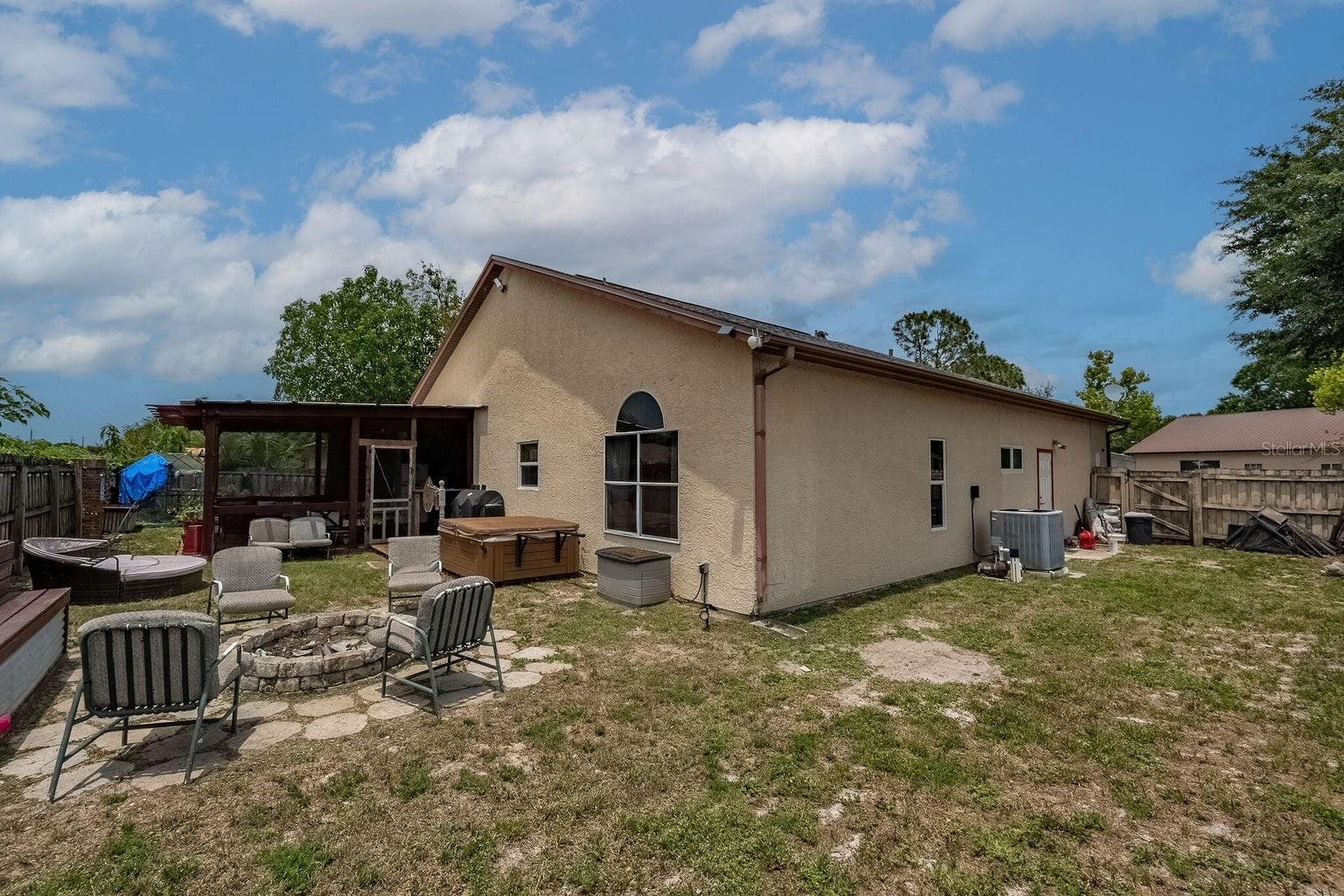 Welcome home! This stunning 3-bedroom, 2-bathroom split floor plan gem boasts 10-foot ceilings and tile floors throughout, complemented by a 2020 roof. Enjoy the peace of mind provided by new (2024) hurricane impact doors and windows. The kitchen is equipped with top-of-the-line appliances, while the bathrooms are beautifully updated. Step outside to an entertainer's paradise: a covered, screened patio features a bar, movie projector & screen, complemented by a Bose speaker system. Relax in the saltwater hot tub or gather around the fire pit. A spacious 2-car garage. Fenced-in yard for privacy. This home blends comfort with unforgettable moments, making it a perfect retreat! Located minutes away from local amenities including shopping centers & parks. Close proximity to major highways makes commuting a breeze, whether heading to nearby Kennedy Space Center, Orlando, or exploring the beautiful beaches on our Space Coast.