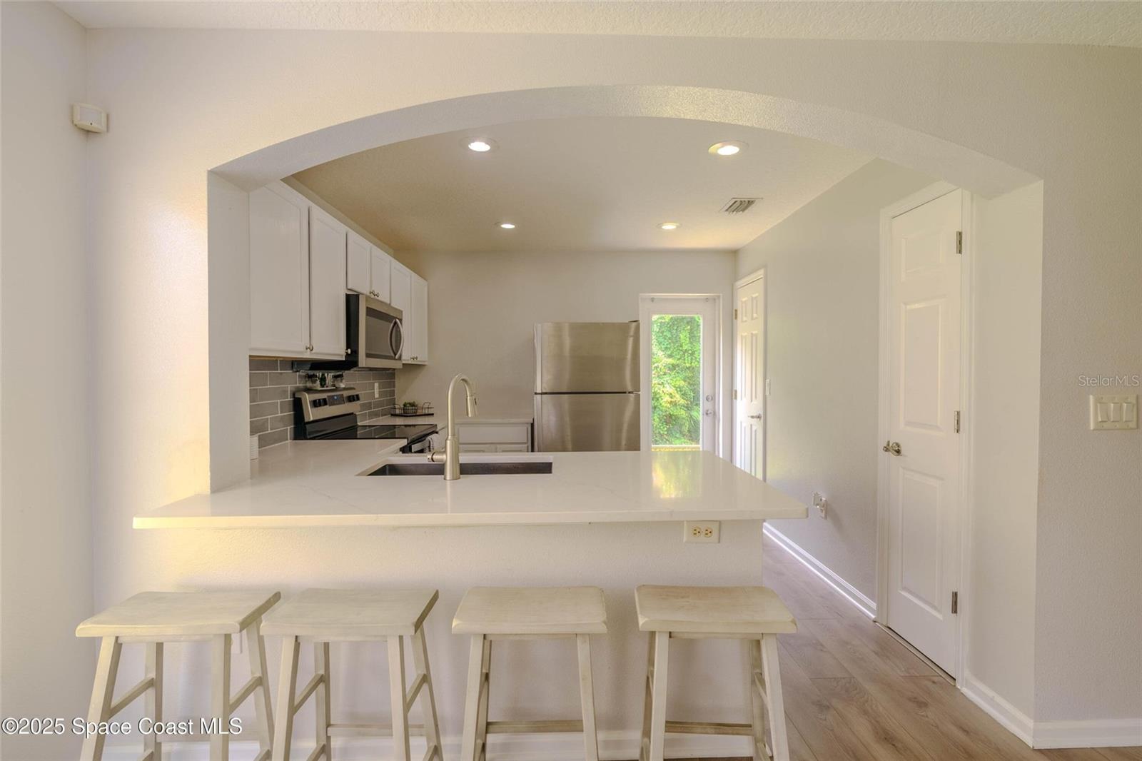 Lovely Two-Story Townhome featuring a living/dining room combo floorplan and is a 3bdrm, 2bath. Nice vinyl plank flooring and tile thru-out. The downstairs has 2bdrms & a full bath, Step-Saver kitchen with architectural archway, breakfast bar, quartz counter tops & a pantry. Upstairs features a huge primary bedroom with double closets and a full bath that encompasses the entire 2nd level. Tray ceilings in the bedrooms are an additional architectural touch. Full glass door leads to quaint backyard that is perfect for your little pets. Inside laundry room - washer & dryer can stay but not warranted. Located in area of quick access to SR405 or Hwy 50. Just minutes to KSC, Orlando and other main areas of travel.