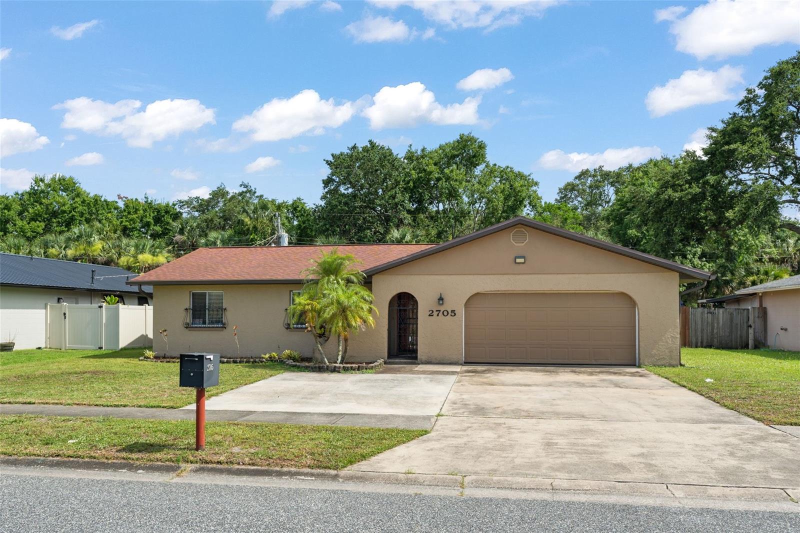 **This property qualifies for a closing cost credit up to $5,600 through the Seller’s preferred lender.** Nestled in the heart of Titusville, this charming 4-bedroom, 2-bathroom single-family home is full of warmth, functionality, and the kind of thoughtful touches that make a house feel like home. With a 2-car garage and an extra-wide driveway, there’s plenty of room for guests, hobbies, and everyday ease. Step inside and be greeted by the light-filled living room, where tile flooring and a front-facing window create a welcoming atmosphere. Just off the living room, the primary suite offers a quiet retreat with parquet flooring, an elegant arched passthrough, a walk-in closet, and a private en suite bath—complete with direct access to the backyard, perfect for morning coffee or quiet evenings under the stars. The thoughtful split-bedroom layout ensures privacy, with additional bedrooms and a full bathroom tucked just off the dining area. Down the foyer, you’ll find a convenient coat closet and access to the spacious garage. The heart of the home lies in the open kitchen and dining area. Bright and functional, the kitchen features white cabinetry, stainless steel appliances, and a breakfast bar—ideal for casual meals or entertaining. The dining area, complete with a charming chandelier, offers ample space for sit-down meals, and the current owners have even created a cozy bar space for additional seating. From the dining room, sliding glass doors lead to a screened-in patio that’s perfect for relaxing or entertaining year-round. Beyond that, a fully fenced backyard awaits—a blank canvas ready for your personal touch. There’s even a 12' x 26' composite deck beside the outdoor building, providing extra space for outdoor living or storage. The outdoor building measures 12' x 16', offering ample room for tools, hobbies, or whatever suits your needs. These measurements help give a better sense of scale than the pictures alone. Additionally, there is a chain-link fence behind the privacy fence, adding an extra layer of enclosure. Whether you’re looking for room to grow, space to gather, or simply a place to call your own, 2705 Wilmette Ave is ready to welcome you home—furniture and all.