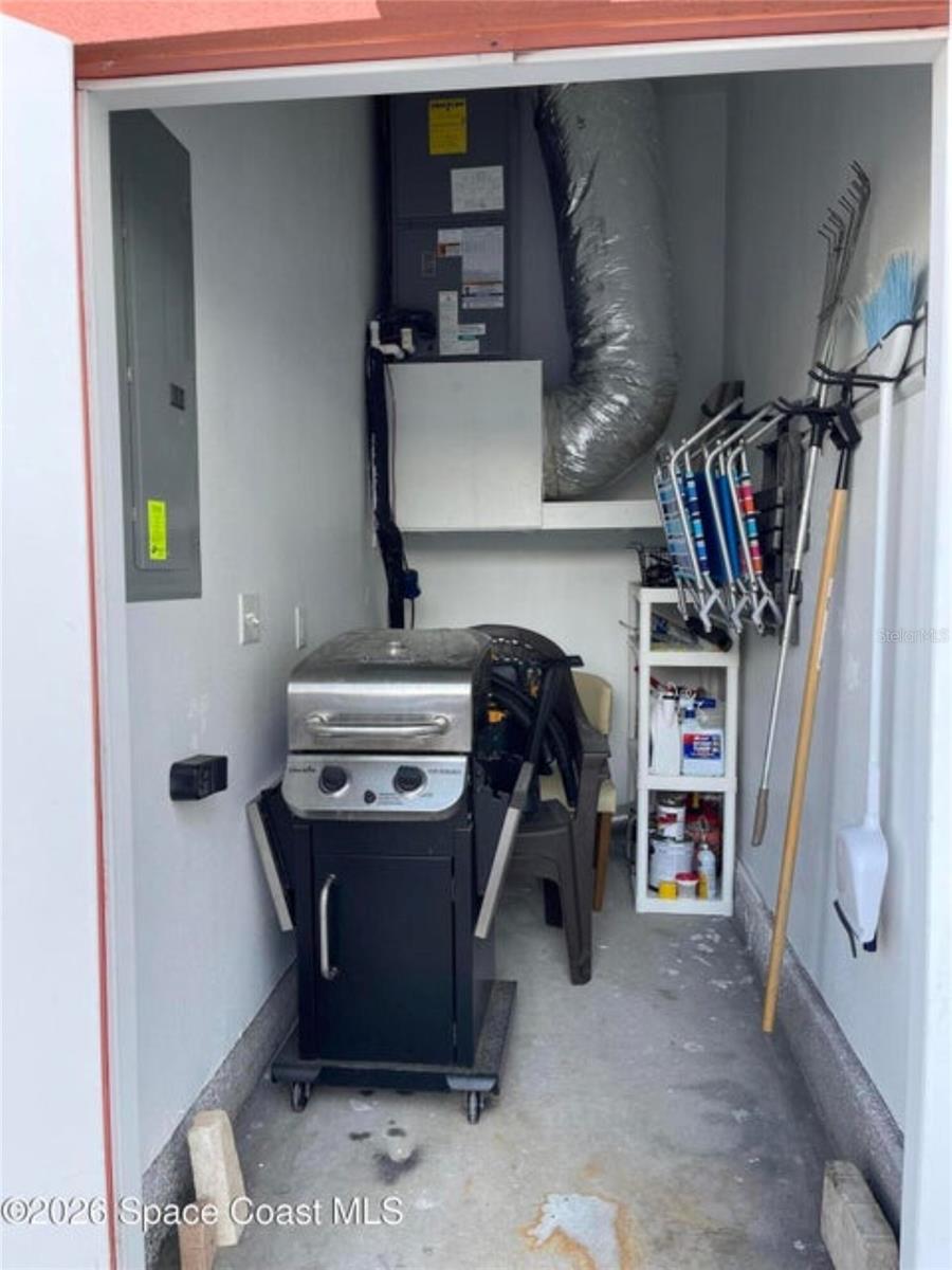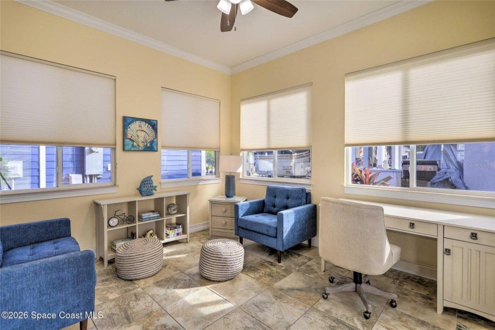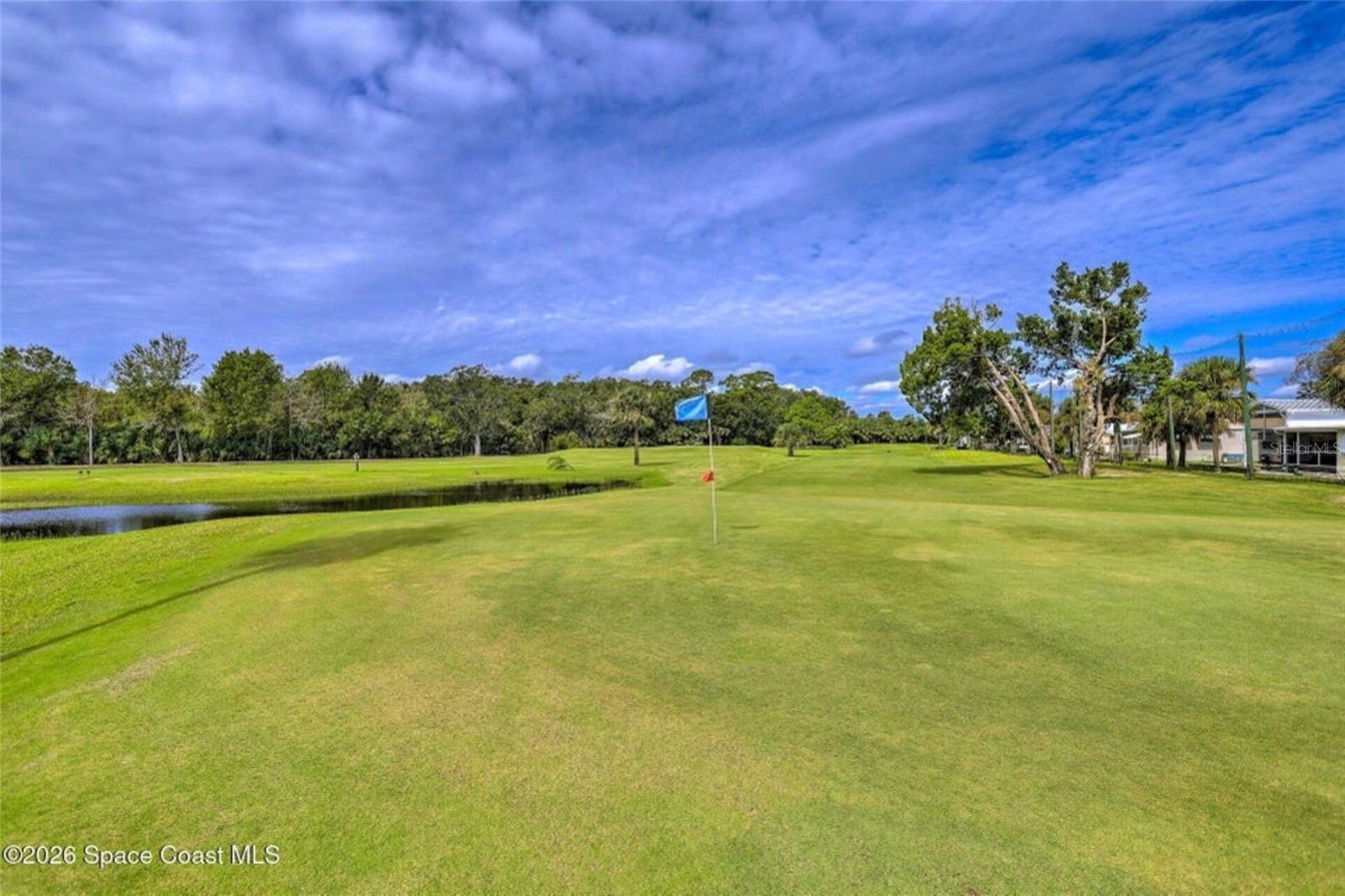 The shell house! The stucco has sea shells incorporated into it. RV Resort living at this active 55+ community for year round or seasonal use. This lot will accommodate any size or style RV with additional hookups for water, sewer, electricity and cable. . This cute, roomy cottage has a master bedroom and an additional bonus room that could be used for sleeping. It is being offered furnished turn-key. You could rent the property short or long term while you aren't using it. In fact, there is a rental manager in place, which could continue. There is a gated entry and and an executive golf course on the property. Amenities include a clubhouse, heated pool, tennis, pickleball, shuffleboard, bocce and tennis. The community is close to airports, theme parks, beaches, shopping and restaurants. Watch the rocket launches from your own yard. The inexpensive association dues cover deluxe cable, your own internet modem/router, sewer, water, trash removal, lawn care and access to common area.