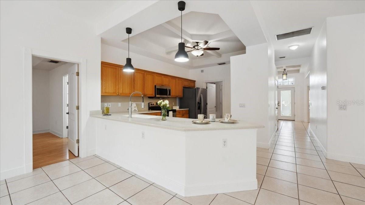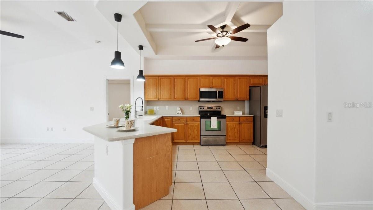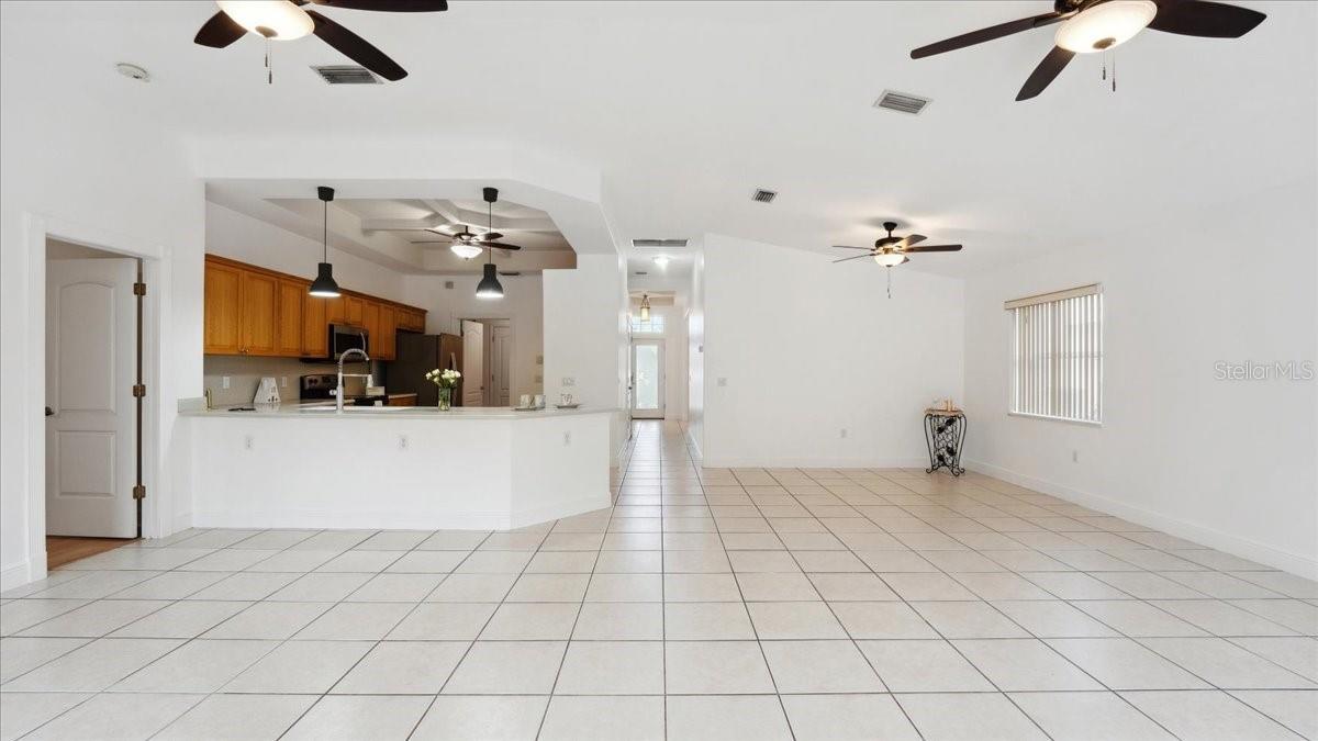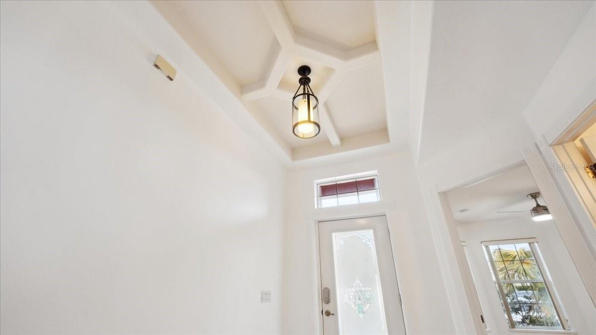 Damar built 3 bedroom 2 bathroom home tucked away in a cute community. Step through a stunning entrance featuring a transom window and etched glass, then look up at the coffered ceiling. Great room with vaulted ceilings is open to large kitchen. Kitchen boast a bar area for extra seating, stainless steel appliances and glass, etched, french door pantry. Gorgeous coffered ceilings in the kitchen adds depth and elegance. French doors off of the family room . Primary has jacuzzi tub, separate shower and walk in closet. NEW ROOF 2023 AND NEW AC (TRANE) 2022. OVERSIZED BOAT GARAGE (23X27) OR SMALL RV with custom built in storage loft. Inside laundry room. The back patio area is very quaint, you can sit around the cozy firepit .Paved driveway adds personality!! County water is very nice!!