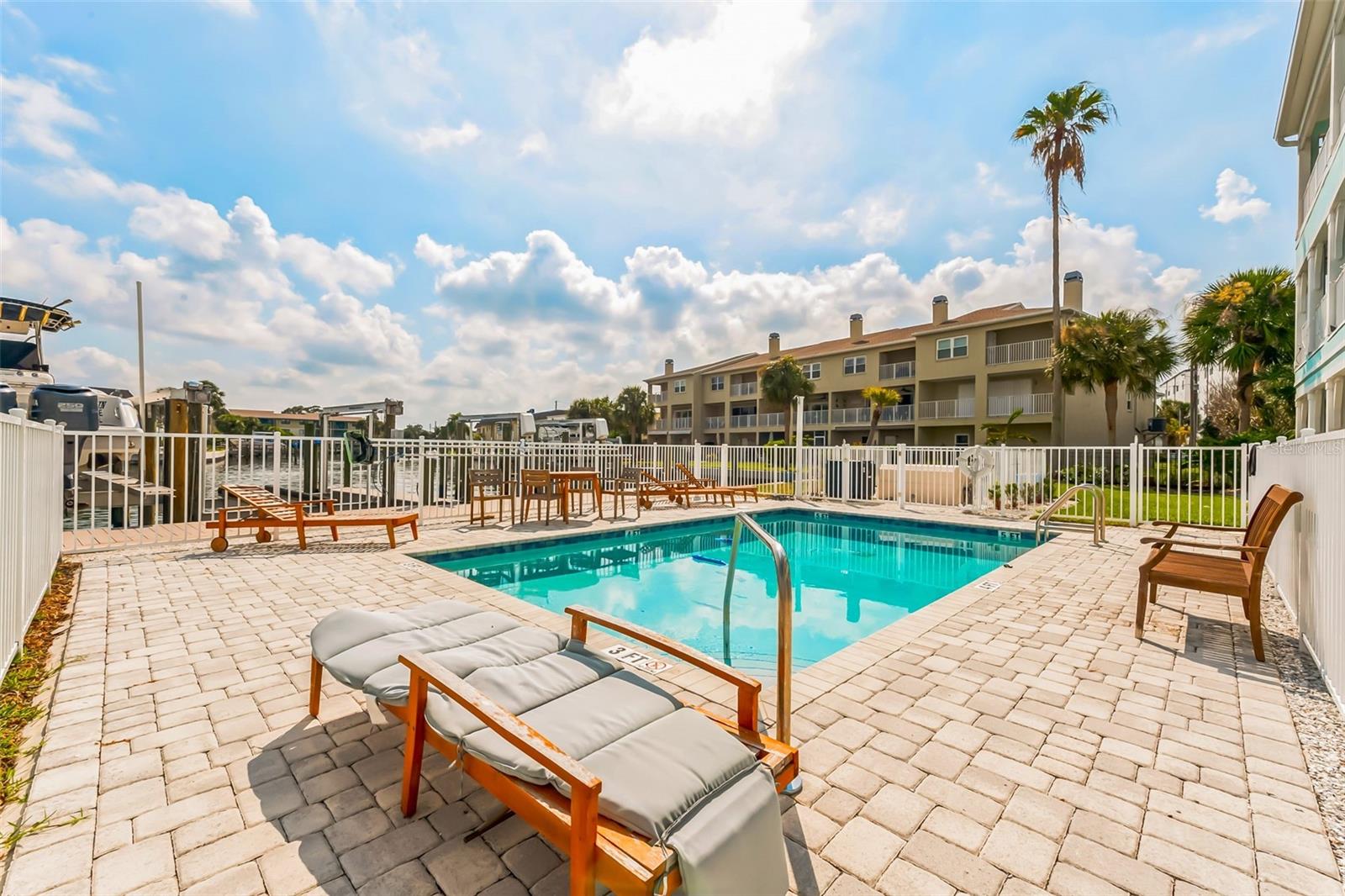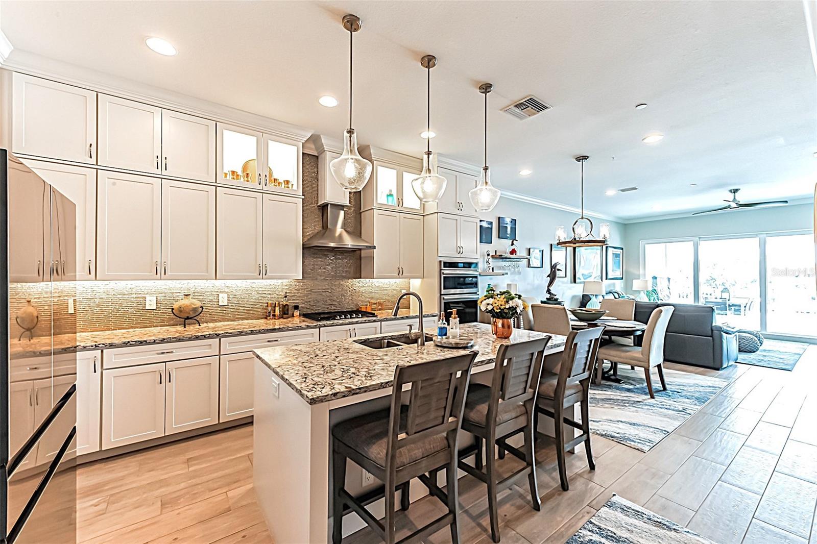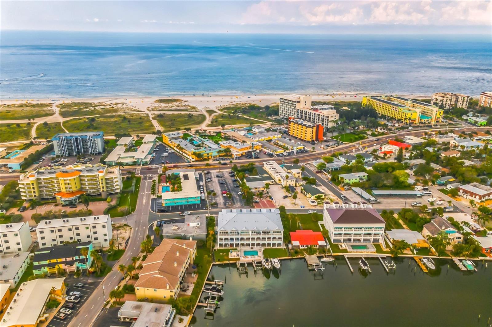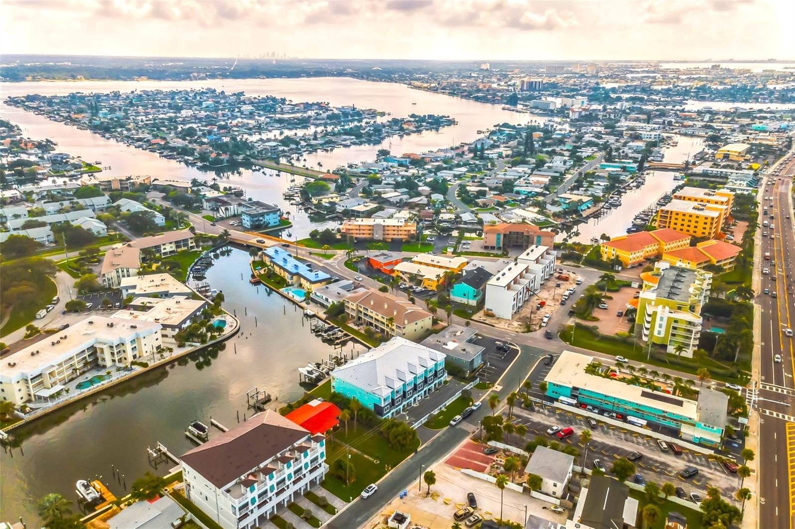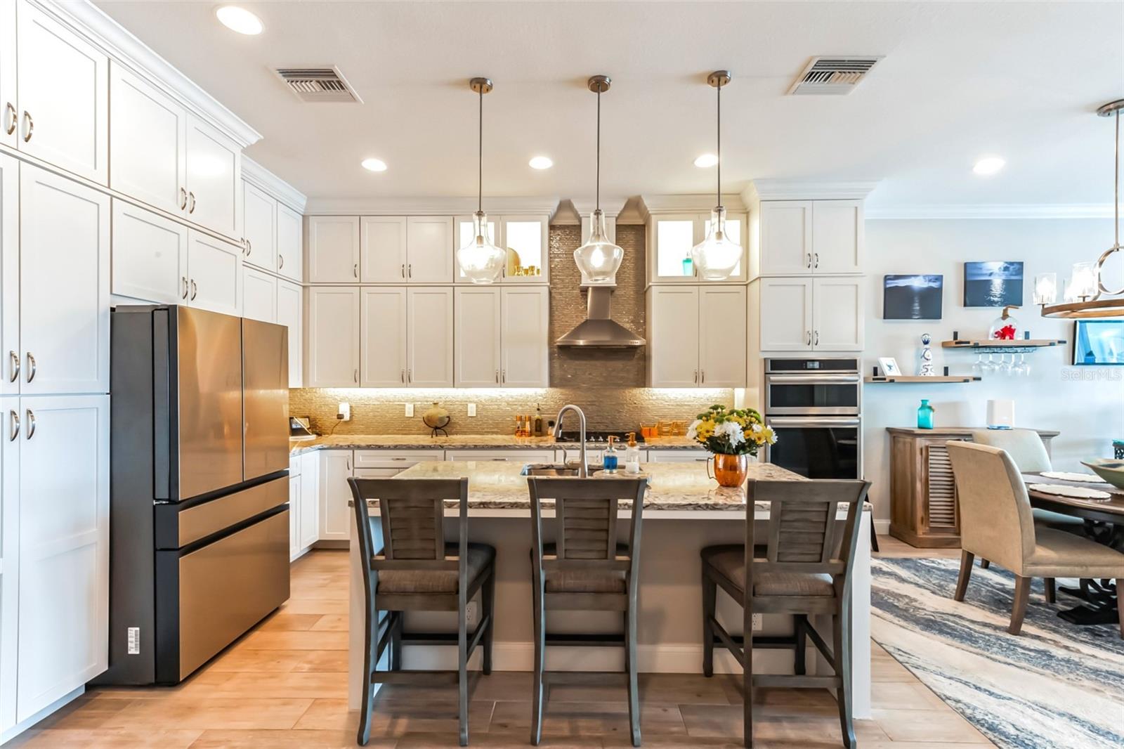 Welcome to your Key West style townhome with views of the intercoastal waterways and the Gulf from every window. Your private elevator leads to rooms where naural light abounds, accentuated by a neutral color palette with vibrant pops of color. The second floor boasts a gourmet kitchen outfitted with floor-to-ceiling cabinets, custom pullout shelves, under-cabinet lighting, lovely, upgraded granite, a beautiful glass-tiled backsplash, and an oversized island with a large walk-in pantry. High-end appliances, including a gas cooktop and built-in double ovens, make this kitchen a chef's dream. Continuing with an open concept, the dining area flows effortlessly to the living room out to the massive balcony overlooking the pool and intracoastal waters. Custom made electric blinds and hurricane-rated sliding doors keep your lanai comfortable. Upgraded porcelain tile floors, designed to mimic wood, seamlessly extend to both the rear and front balconies. The second floor offers a versatile bedroom or office space connected to a full bathroom. On the third floor, the master suite features 10-foot sliding doors with custom electric blinds, offering seamless water views and access to a private, oversized balcony. The luxurious master bath includes designer tile flooring, quartz countertops with dual sinks, two walk-in closets with upgraded organization systems, and a large walkable attic for additional storage. Indulge in the spa-like double shower, complete with dual showerheads, a built-in seat, and a stunning river rock floor. A third bedroom, located on the front side of this floor, offers Gulf views, a private balcony, and an ensuite bath. Conveniently located just outside the master suite is the laundry room, equipped with custom cabinetry and a laundry sink. The ground floor offers an enormous garage with built in cabinets and workshop space. The lower-level carport, garage, and patio are beautifully finished with pavers, and a back garage door provides easy access to the dock and heated pool. The sugary beaches of Treasure Island, fun restaurants, entertainment and stores are just blocks away. The 100’ composite dock has water and electricity. Take advantage of the captain’s walk where you can store your boat on the 16,000lb boat lift with adjustable stop level. John's Pass is just minutes away where you have access to some of the best fishing in the world! Additional features include a Ring Doorbell, professional wiring with repeaters for strong internet coverage, a water softener, and a whole-house filtration system. This home truly captures the essence of Florida living at its finest.