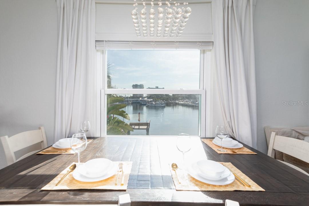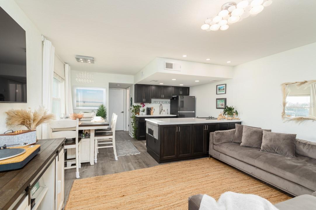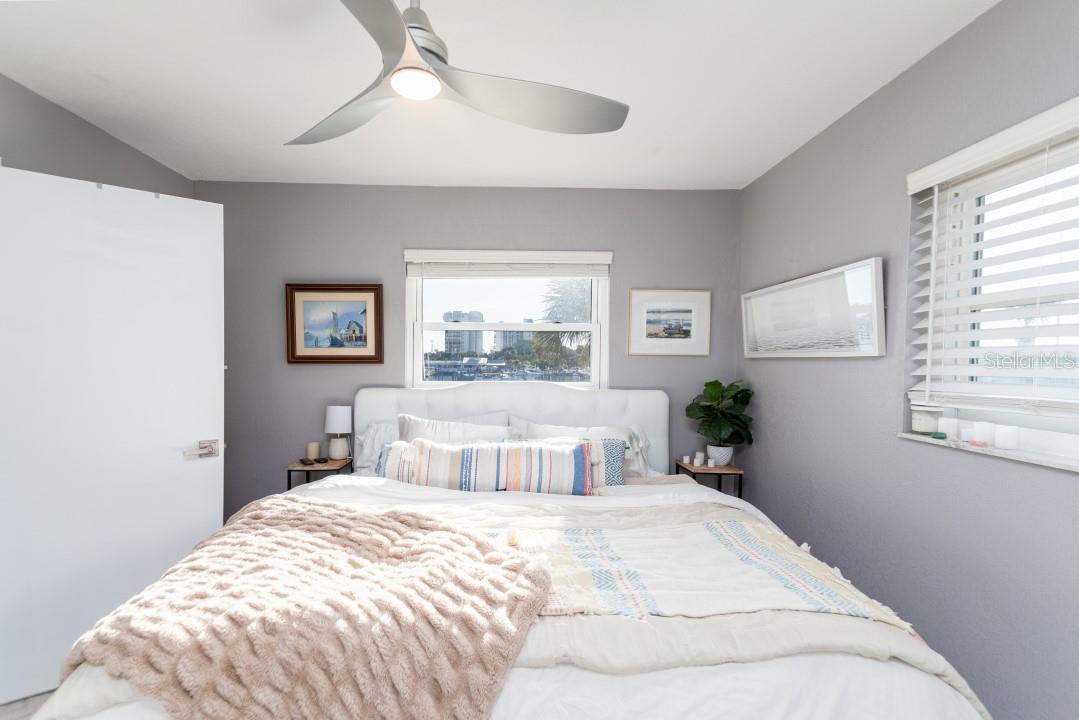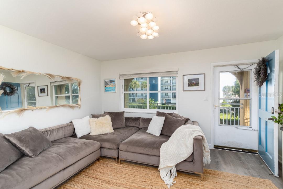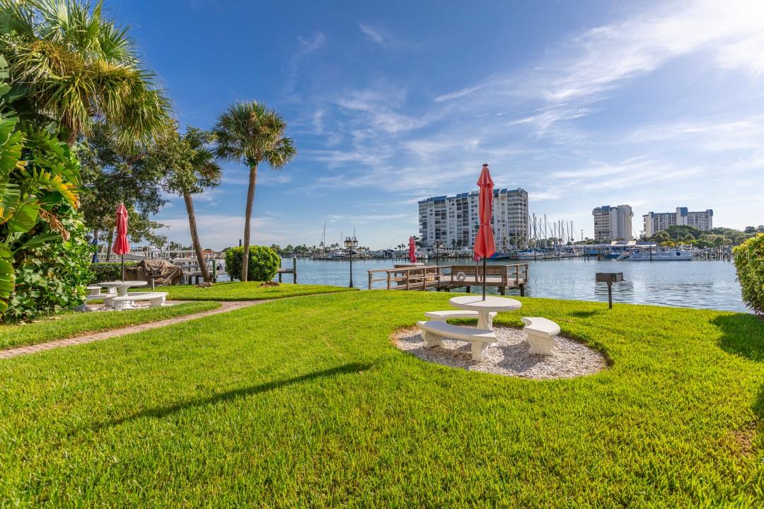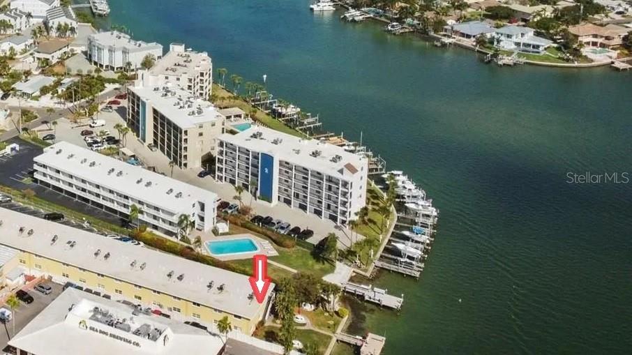 NEVER FLOODED! HIGH AND DRY!!! *Fully updated *waterfront* end unit condo on Treasure Island!* Water views from every window. Located just steps away from gorgeous Sunset Beach, this open floor plan (1 bedroom 1 full bathroom) condo has a large spacious living, dining, and kitchen area with beautiful water views of the Intercoastal Waterway. End unit overlooking the water from the second floor- high and dry! No flood or wind damage. Plus it's the penthouse - best condo in the building. Monthly income: $3,000-$4,000/month! Brand new custom kitchen featuring stainless steel Samsung refrigerator and GE convection oven, Corian countertops, Pensacola soft close cabinetry, massive 8’x4’ island/bar with tons of cabinet storage, custom Glacier undermount sink, a 5 stage reverse osmosis water filtration system looped into the refrigerator’s ice maker, and oversized pantry with new shelving. The large bedroom easily fits a king-sized bed and multiple dressers, has a gigantic closet with plenty of storage space and customizable shelves, and of course the beautiful **WATER VIEW** that is incredible every morning. The newly renovated bathroom with a coastal modern vanity, double massaging shower heads and glass enclosure and great water pressure. Literally every surface has been updated from floor to ceiling: brand new hurricane impact windows with UV coating (installed 2020), new air conditioner and handler (2024), new kitchen, updated bathroom, fresh paint, Lifeproof Sterling Oak vinyl plank flooring, new whole home tankless water heater (2019), custom LED light fixtures, Nest smart digital thermostat, and keyless smart door locks. No assessments, no structural assessments- low HOA fee ($630) includes EVERYTHING including cable, wifi, insurance, water, sewer, trash, Terminix pest control, monitored video surveillance, parking, grounds maintenance, and more. The condo community amenities include a dock just steps outside your door, great for fishing or entertaining, plus a gas and charcoal grill, firepit, and laundry facilities on both floors. Furnishings do not convey but are negotiable. This stunning property has everything- location, turnkey and totally updated. And it's waterfront at a great price which means this opportunity won’t last.