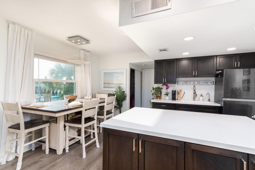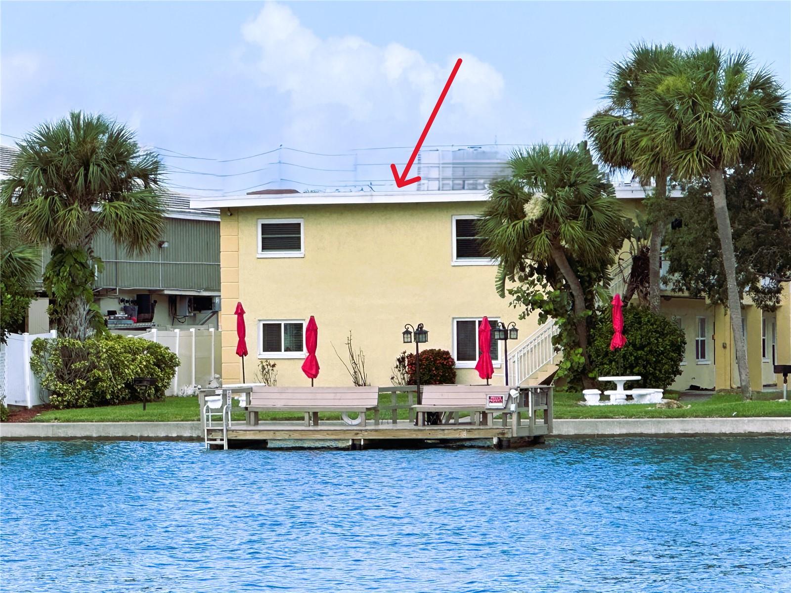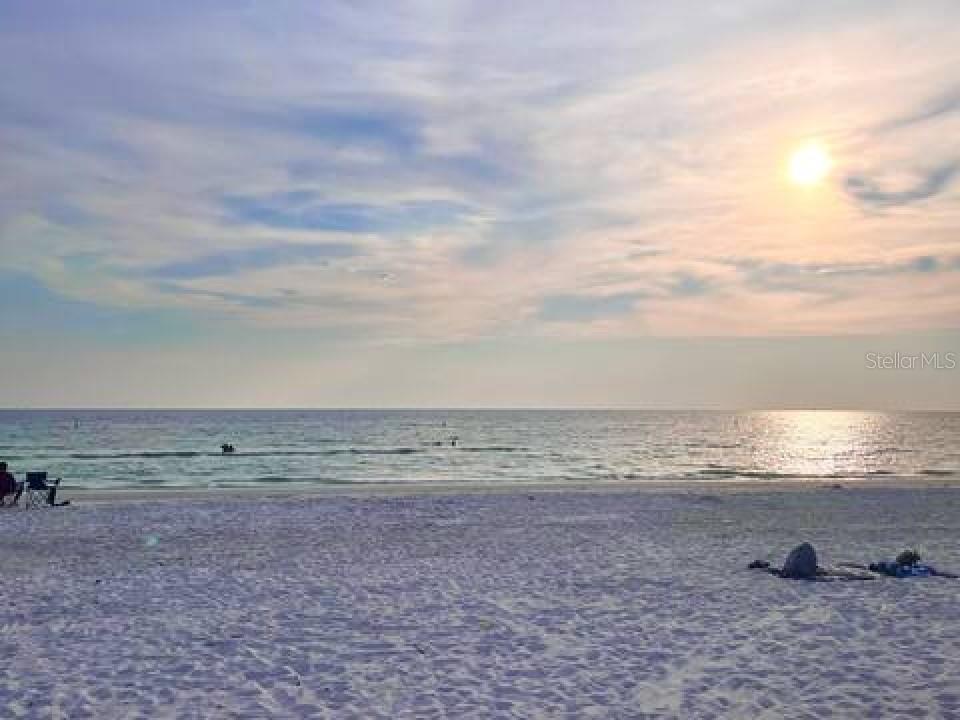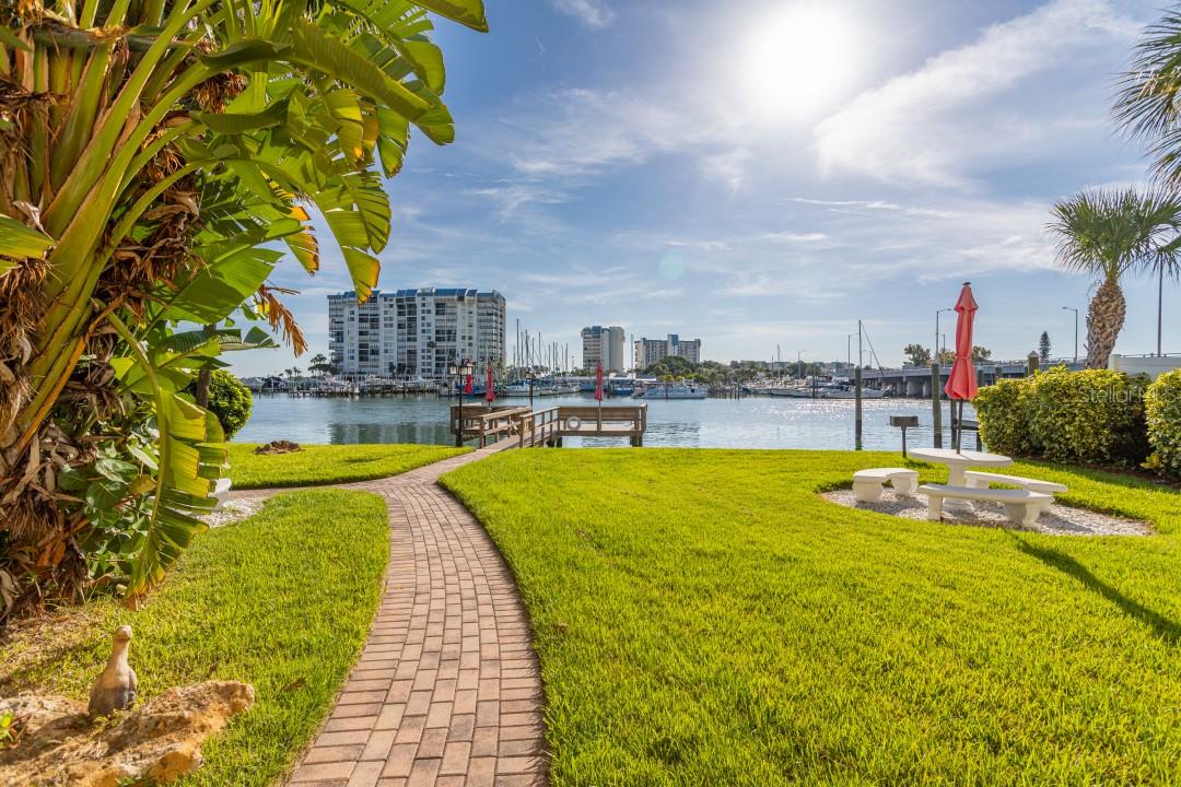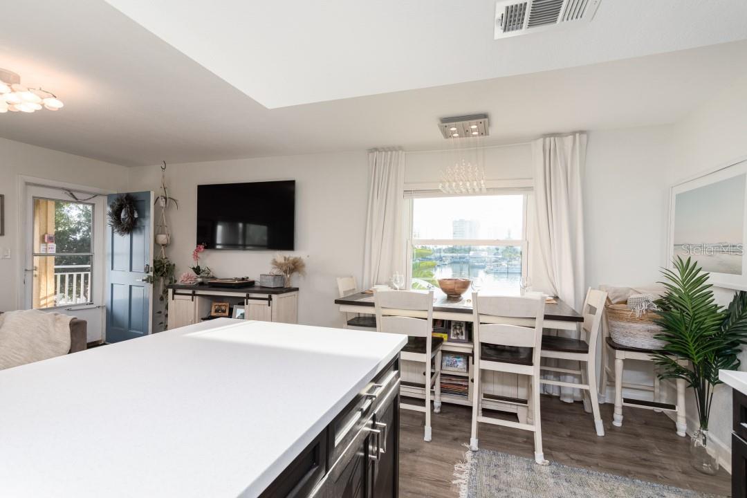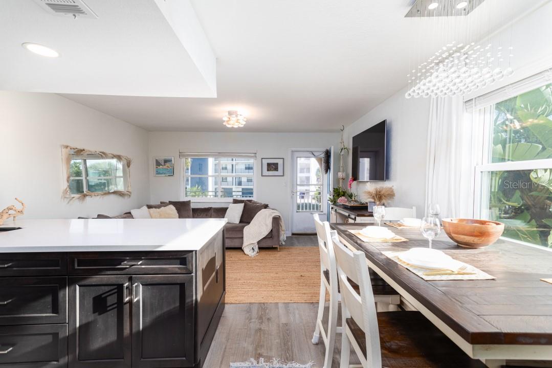 NEVER FLOODED! HIGH AND DRY!!! *Fully updated *waterfront* end unit condo on Treasure Island!* Water views from every window. Located just steps away from gorgeous Sunset Beach, this open floor plan (1 bedroom 1 full bathroom) condo has a large spacious living, dining, and kitchen area with beautiful water views of the Intercoastal Waterway. End unit overlooking the water from the second floor- high and dry! No flood or wind damage. Plus it's the penthouse - best condo in the building. Monthly income: $3,000-$4,000/month! Brand new custom kitchen featuring stainless steel Samsung refrigerator and GE convection oven, Corian countertops, Pensacola soft close cabinetry, massive 8’x4’ island/bar with tons of cabinet storage, custom Glacier undermount sink, a 5 stage reverse osmosis water filtration system looped into the refrigerator’s ice maker, and oversized pantry with new shelving. The large bedroom easily fits a king-sized bed and multiple dressers, has a gigantic closet with plenty of storage space and customizable shelves, and of course the beautiful **WATER VIEW** that is incredible every morning. The newly renovated bathroom with a coastal modern vanity, double massaging shower heads and glass enclosure and great water pressure. Literally every surface has been updated from floor to ceiling: brand new hurricane impact windows with UV coating (installed 2020), new air conditioner and handler (2024), new kitchen, updated bathroom, fresh paint, Lifeproof Sterling Oak vinyl plank flooring, new whole home tankless water heater (2019), custom LED light fixtures, Nest smart digital thermostat, and keyless smart door locks. No assessments, no structural assessments- low HOA fee ($630) includes EVERYTHING including cable, wifi, insurance, water, sewer, trash, Terminix pest control, monitored video surveillance, parking, grounds maintenance, and more. The condo community amenities include a dock just steps outside your door, great for fishing or entertaining, plus a gas and charcoal grill, firepit, and laundry facilities on both floors. Furnishings do not convey but are negotiable. This stunning property has everything- location, turnkey and totally updated. And it's waterfront at a great price which means this opportunity won’t last.