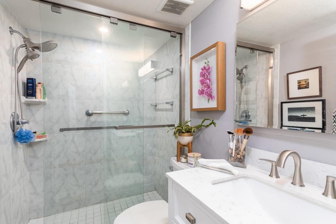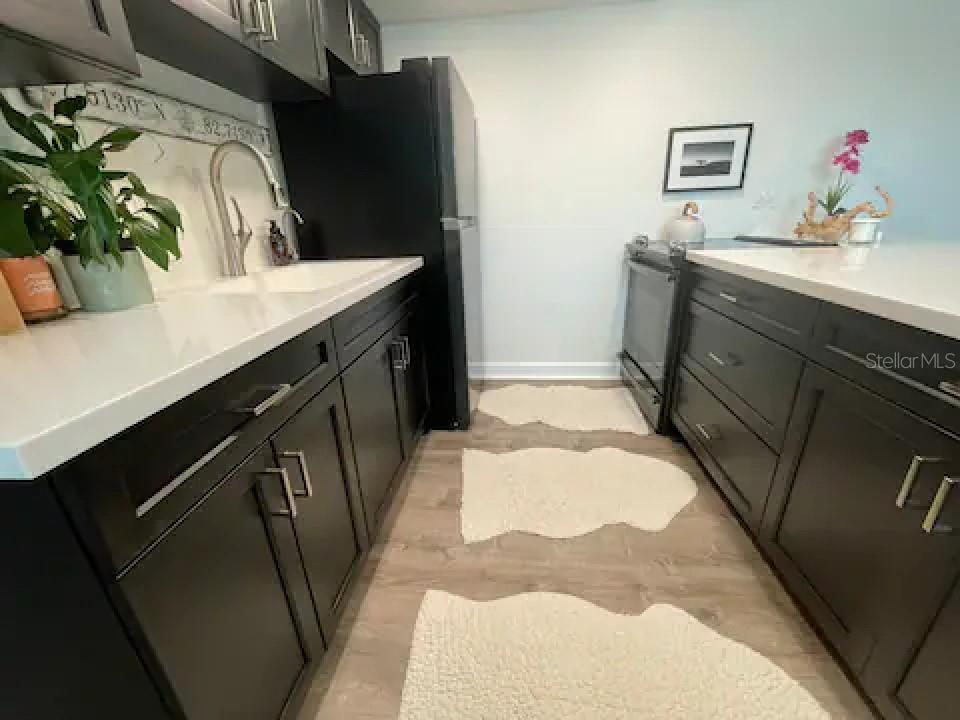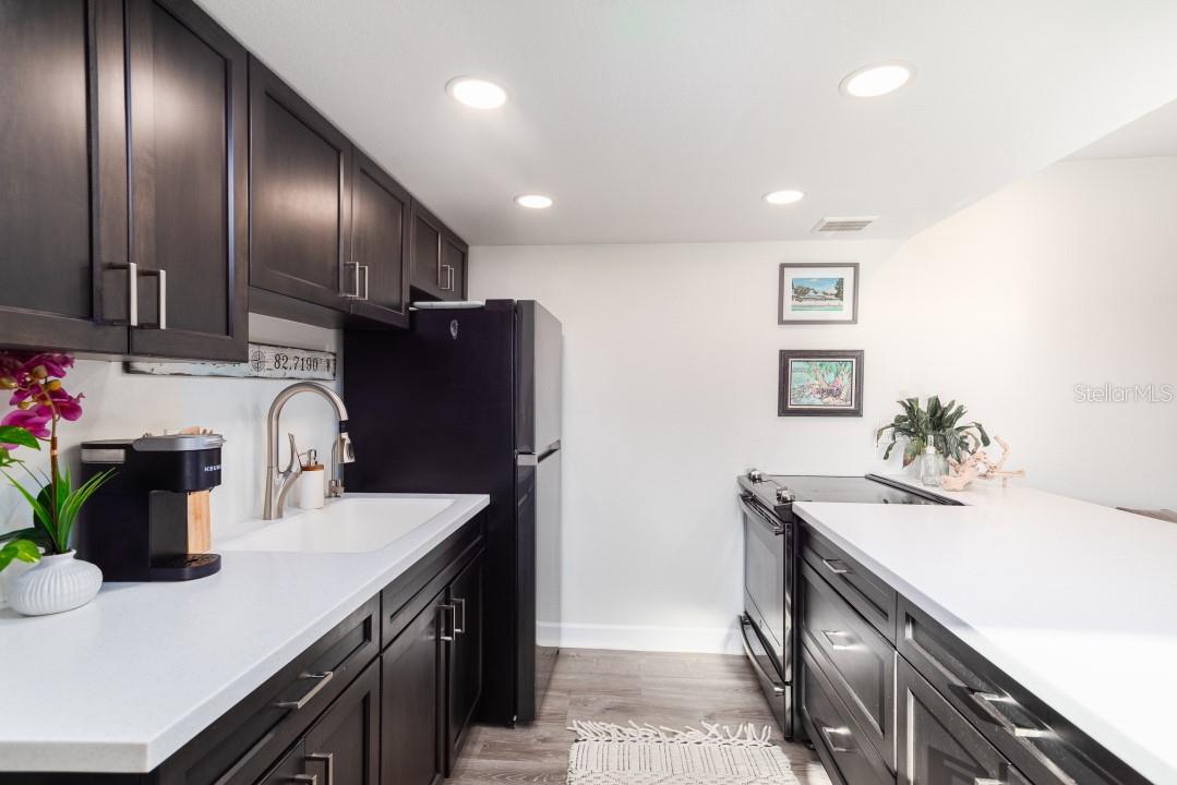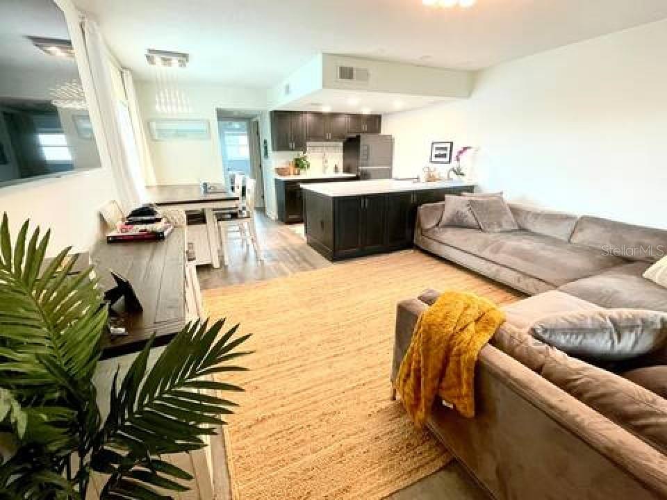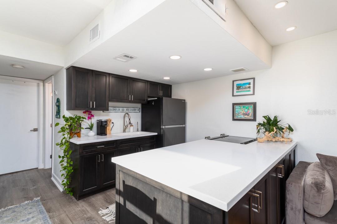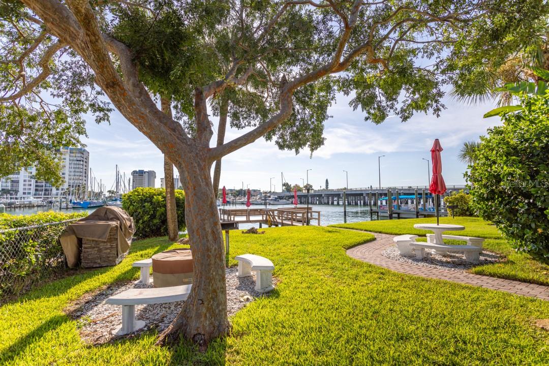 NEVER FLOODED! HIGH AND DRY!!! *Fully updated *waterfront* end unit condo on Treasure Island!* Water views from every window. Located just steps away from gorgeous Sunset Beach, this open floor plan (1 bedroom 1 full bathroom) condo has a large spacious living, dining, and kitchen area with beautiful water views of the Intercoastal Waterway. End unit overlooking the water from the second floor- high and dry! No flood or wind damage. Plus it's the penthouse - best condo in the building. Monthly income: $3,000-$4,000/month! Brand new custom kitchen featuring stainless steel Samsung refrigerator and GE convection oven, Corian countertops, Pensacola soft close cabinetry, massive 8’x4’ island/bar with tons of cabinet storage, custom Glacier undermount sink, a 5 stage reverse osmosis water filtration system looped into the refrigerator’s ice maker, and oversized pantry with new shelving. The large bedroom easily fits a king-sized bed and multiple dressers, has a gigantic closet with plenty of storage space and customizable shelves, and of course the beautiful **WATER VIEW** that is incredible every morning. The newly renovated bathroom with a coastal modern vanity, double massaging shower heads and glass enclosure and great water pressure. Literally every surface has been updated from floor to ceiling: brand new hurricane impact windows with UV coating (installed 2020), new air conditioner and handler (2024), new kitchen, updated bathroom, fresh paint, Lifeproof Sterling Oak vinyl plank flooring, new whole home tankless water heater (2019), custom LED light fixtures, Nest smart digital thermostat, and keyless smart door locks. No assessments, no structural assessments- low HOA fee ($630) includes EVERYTHING including cable, wifi, insurance, water, sewer, trash, Terminix pest control, monitored video surveillance, parking, grounds maintenance, and more. The condo community amenities include a dock just steps outside your door, great for fishing or entertaining, plus a gas and charcoal grill, firepit, and laundry facilities on both floors. Furnishings do not convey but are negotiable. This stunning property has everything- location, turnkey and totally updated. And it's waterfront at a great price which means this opportunity won’t last.