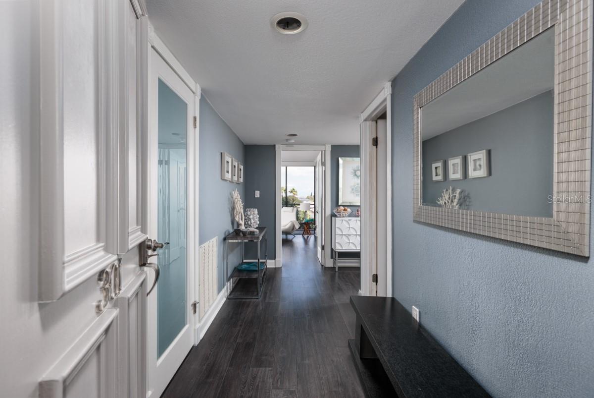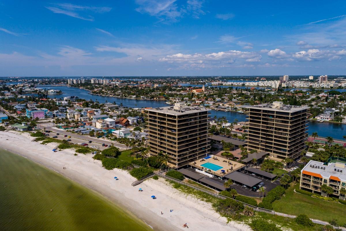 Step into a fully furnished, turnkey beachfront retreat at Mansions by the Sea in beautiful Treasure Island, Florida. Unit 301 is a rare, highly coveted corner unit offering two expansive walls of sliders, showcasing breathtaking views of both the Gulf of Mexico and the Intracoastal Waterway. The sliders also open to overlook the sparkling pool and pristine beach, with remote-controlled window shades providing effortless functionality. The unit features over 77 feet of continuous wraparound balconies, allowing you to immerse yourself daily in the sights and sounds of beachfront living. Inside, you’ll be captivated by the beautifully updated interior of this two-bedroom, two-bath home, which boasts 1,200 square feet of spacious, comfortable living. The open-concept living room, dining room and kitchen flow seamlessly, creating a welcoming space filled with spectacular views. The kitchen is a luxurious delight, equipped with elegant white cabinetry, a large island with seating for four, and top-of-the-line stainless steel appliances. A convenient bar with a wine cooler enhances the space's sophistication. The generous primary bedroom features balcony access and stunning water views, with an en-suite bath offering a tranquil retreat, complete with a relaxing jetted tub—perfect for unwinding after a day in the sun. Additionally, the in-unit laundry room is both practical and convenient. Mansions by the Sea boasts impressive amenities, including direct beach access, a gorgeous pool, fitness center, game room, clubhouse, tennis courts, pickleball courts, and more. On-site management adds to the community's appeal. Furthermore, with 30-day rental allowances, this property offers the flexibility of being used as both a personal getaway and an investment opportunity. Schedule your private showing today, and welcome home!