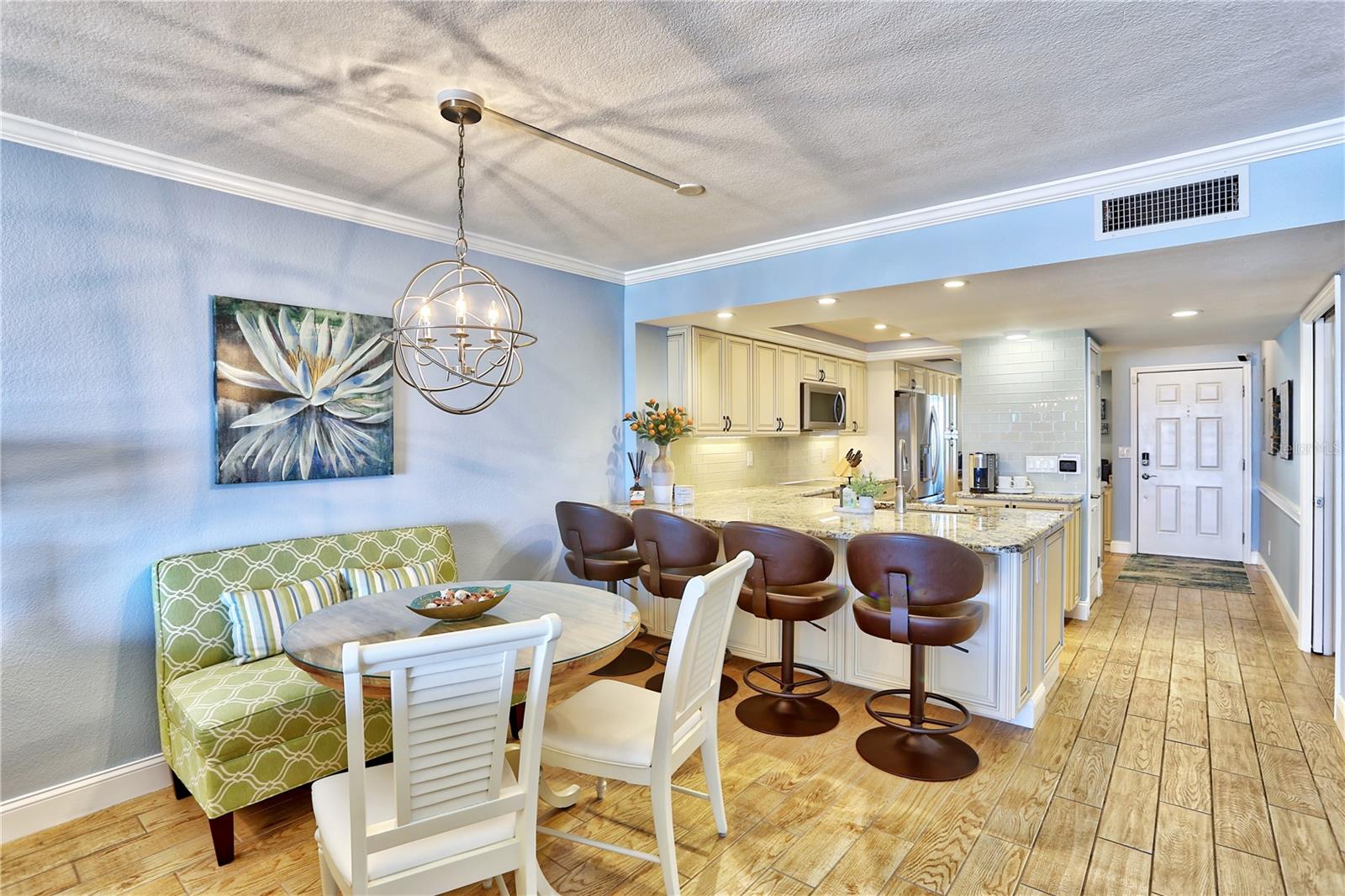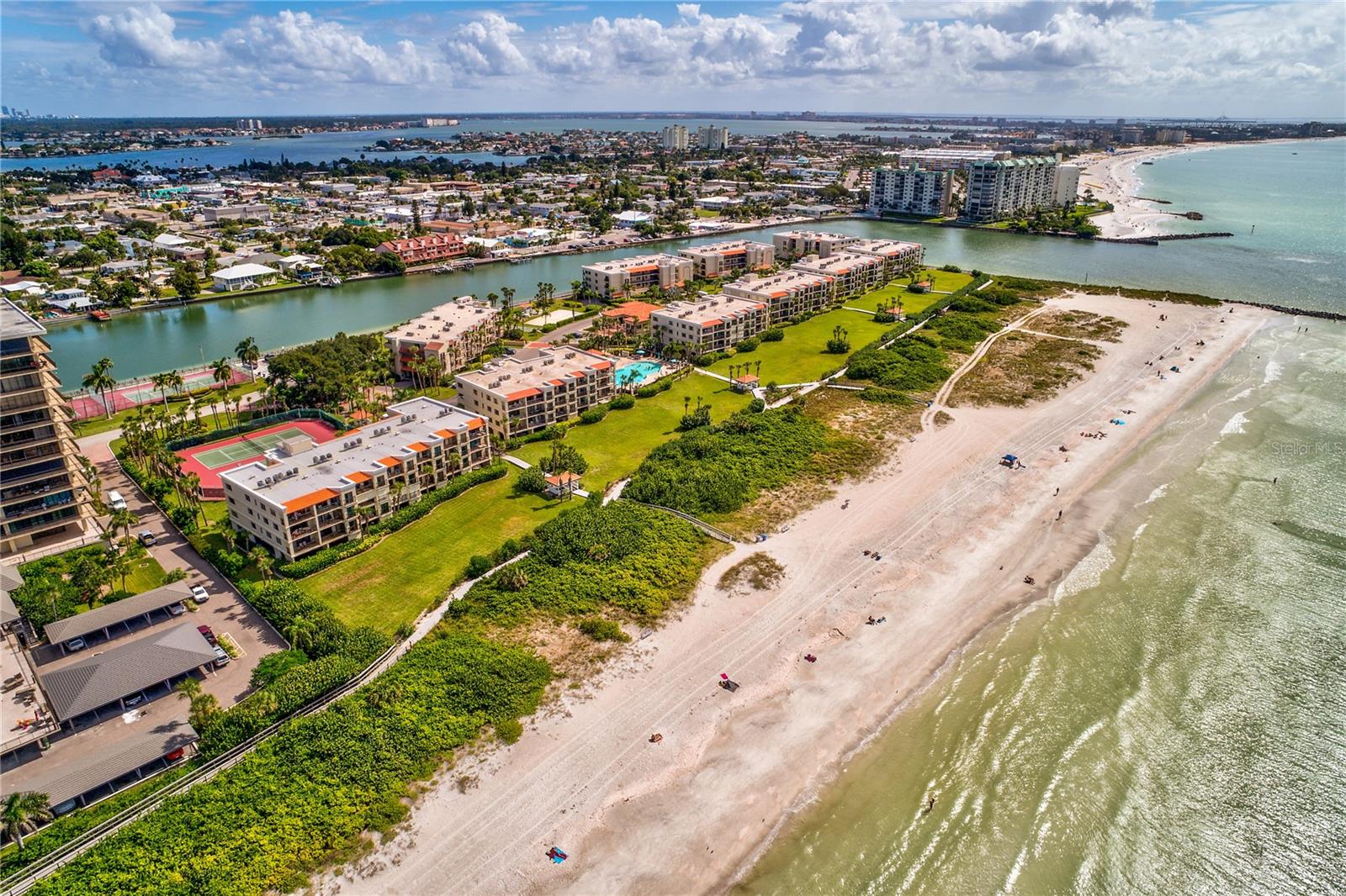 Rare opportunity to own a highly sought-after residence in Land's End at Sunset Beach—Building 9, Unit 402, a top-floor, direct beachfront condo completely rebuilt in 2015 with premium finishes and a reimagined layout designed for comfort, style, and functionality. This owner-occupied, never-rented unit has been meticulously maintained and upgraded, featuring Category 5 hurricane-rated windows, a full security system with audio, video, and water intrusion monitoring, and TWO under-building parking spaces—a rare find in the area. Enjoy stunning beach views thanks to the redesigned floor plan to create Panoramic Gulf views and abundant natural light throughout. The kitchen is a showstopper, equipped with new LG appliances, a full-slab peninsula island with storage, separate bar and coffee bar areas, and an open layout perfect for entertaining. Additional upgrades include a full-size washer & dryer, full office set up, plenty of storage, new A/C, water heater, 2 ensuites, and much more. Just steps from the beach and conveniently close to the community pool, this unit blends luxury, functionality, and location. Land’s End is a unique guard-gated community, surrounded by water on three sides, and offers 14+ acres of neatly maintained grounds. Amenities include a large Gulf-front heated swimming pool, two Jacuzzis, tennis courts, shuffleboard, a sand volleyball court, clubhouse, BBQ grilling cabanas, picnic areas, and an adults-only hot tub area. Whether you're looking for a full-time beachfront home, a refined second residence, or a short-term rental investment, this condo delivers the ultimate coastal lifestyle. Schedule your private showing today and experience why Unit 402 at Land's End is truly one of a kind.