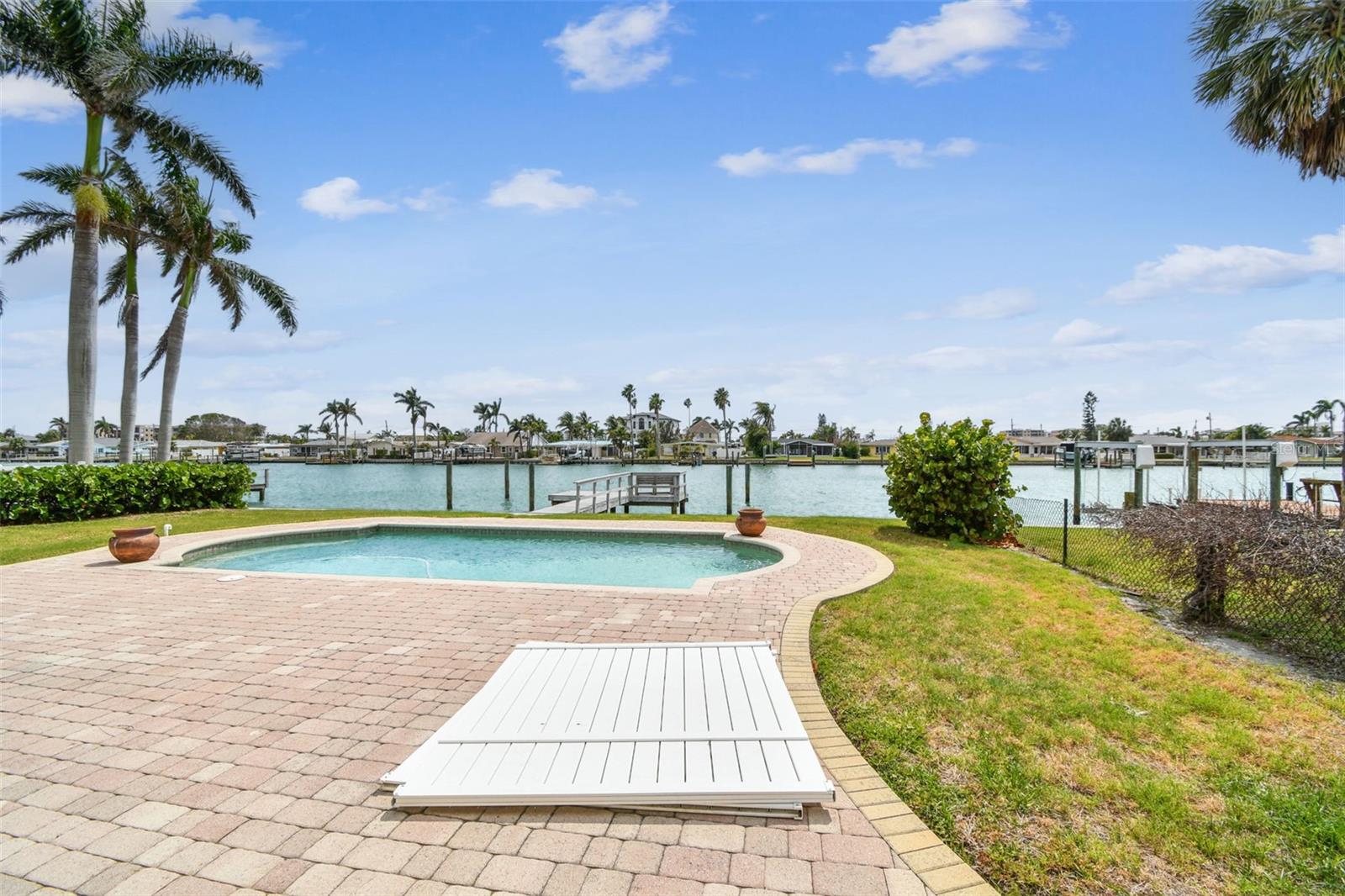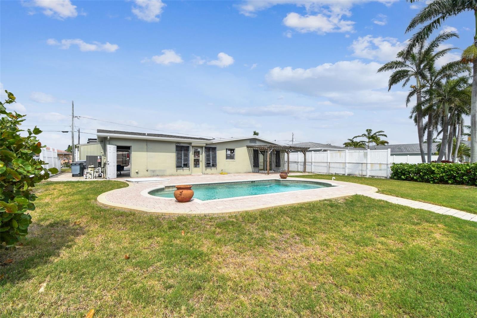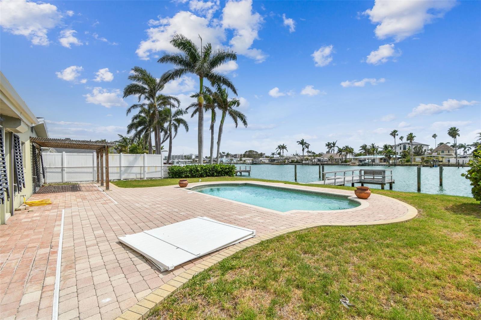 Discover the ultimate in Florida coastal living with this waterfront gem in the heart of Treasure Island. This is the perfect blank canvas for any creative buyer. Perfectly positioned along the serene Boca Ciega Bay, this 3-bedroom, 2-bath home offers direct boating access to both Tampa Bay and the Gulf of Mexico—right from your own private dock. Step outside to a backyard oasis where the sparkling chlorine pool, installed with a new pump in 2024, invites you to relax and soak in the breathtaking water views. Whether you're entertaining or enjoying a quiet sunrise, the expansive outdoor space and two-year-old seawall provide peace of mind and the perfect setting.Inside, the home has been fully remediated and is ready for your personal finishing touches. The layout is perfect for living on the water, great lighting and open living spaces. Recent upgrades include a brand-new air conditioning system (installed April 2025), giving you a strong head start toward creating your ideal coastal retreat. Additional highlights include a garage, a beautifully pavered circular driveway, and a rare combination of privacy, water access, and location. If you're looking for the perfect place to enjoy Florida waterfront living—whether for weekend escapes or full-time bliss—this Treasure Island property is a must-see.