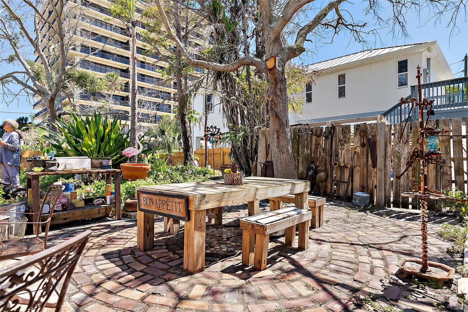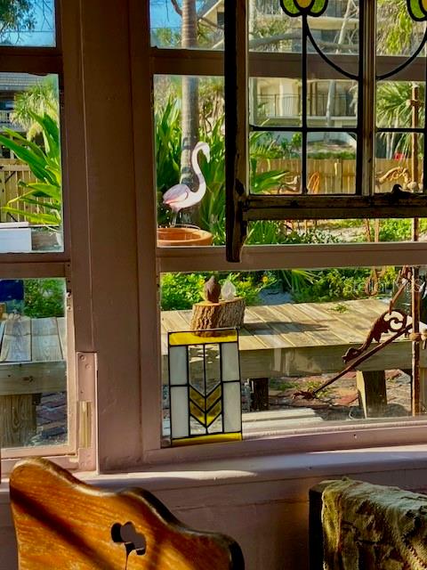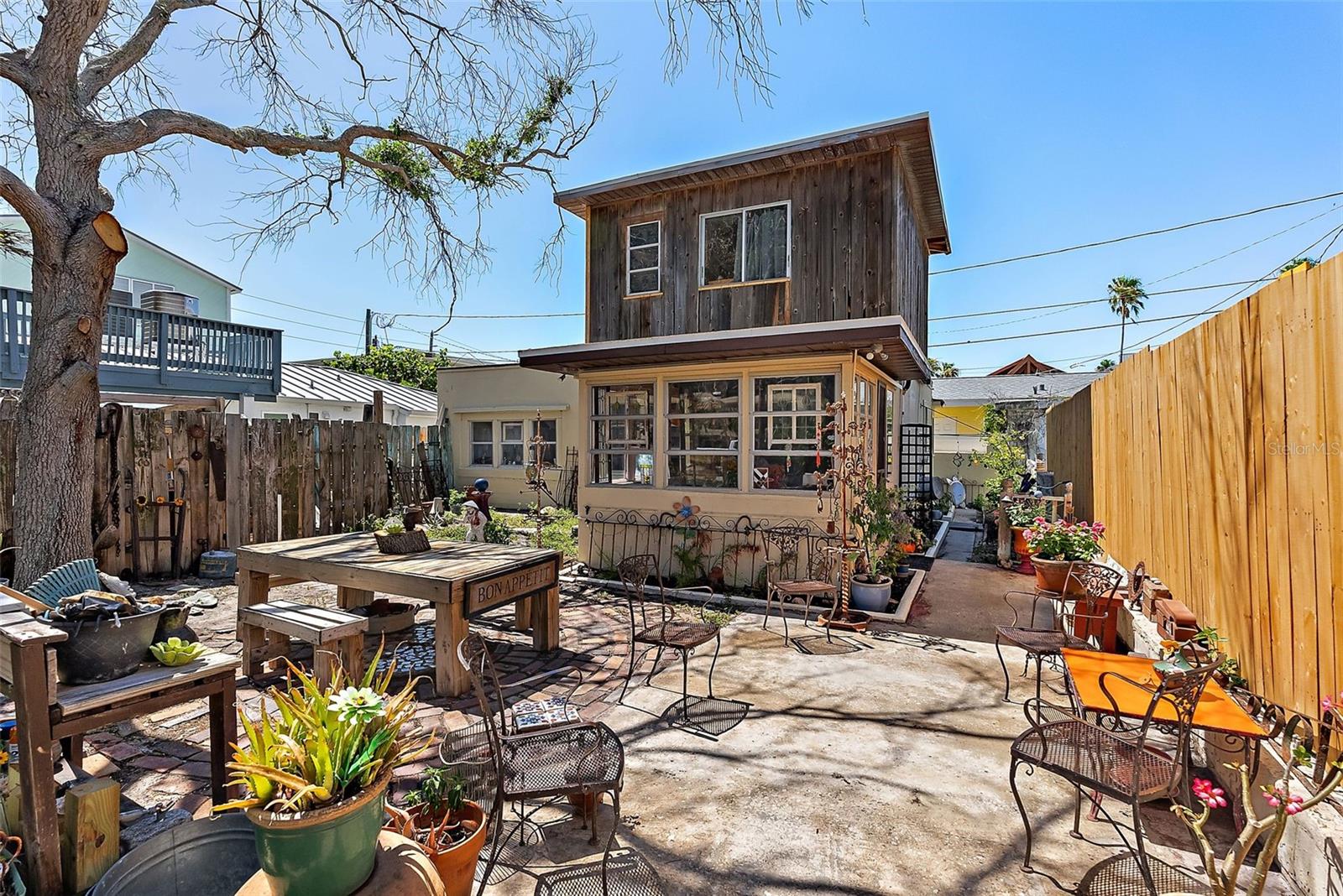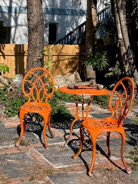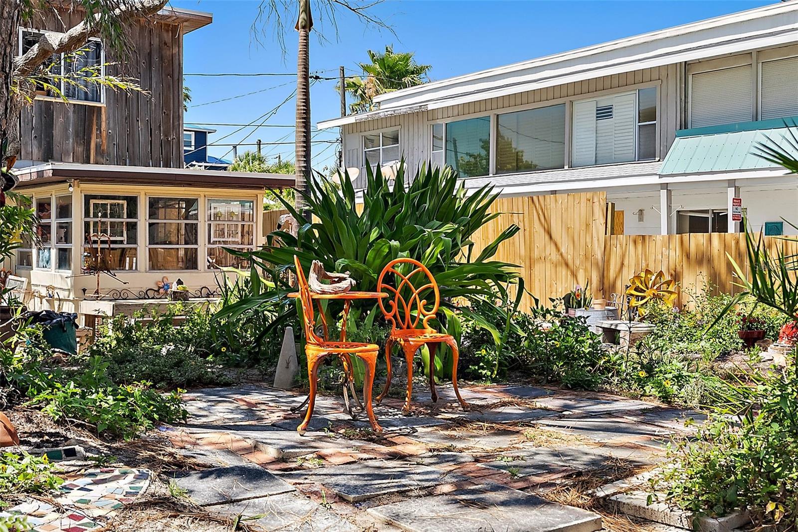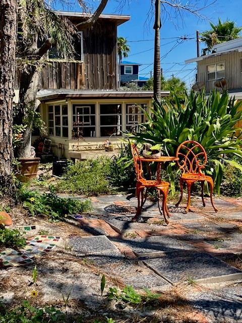 This charming 2 Bedroom 2 Bath home on historic Sunset Beach in Treasure Island sits just two houses from the beach and offers picturesque Gulf views right from the front yard. Perfectly positioned on the coveted south end of Sunset Beach, this property captures the essence of Florida coastal living with a nostalgic original Sunset Beach inspired ambiance. Hand-laid brickwork creates a welcoming courtyard, surrounded by lush, uncontrived native landscaping that gives the feeling of a private oasis. Inside, natural light fills this cottage, highlighting unique features such as concrete floors, wood ceilings, and an old Florida feel. The primary level features a natural light filled dining area, a kitchen, living room, bathroom with shower, and a comfortable Florida room/Guest bedroom; each space evoking the charm and character of times gone by. Also a long pantry off the kitchen and a separate laundry room with washer and dryer complete the bottom level. Upstairs, the Master bedroom has its own bathroom and provides a private, comfortable retreat, completing the home's warm welcoming and peaceful presence. Watch spectacular nightly sunsets from your yard or stroll a few steps to the water's edge ever mindful of logger-head sea turtles nest, to watch dolphins frolicking at dusk. If you share your life with a special K-9, a 3 minute walk in the opposite direction will have you at Sunsets Dog Beach. While this home did experience water intrusion during Hurricane Helene, it weathered the storm remarkably well due to early beach building expertise and to the bottom level being solid block construction with poured concrete walls - including interior walls. Procuring the distinction of "Not Substantially Damaged" by the City of Treasure Island. Buyers are welcome and encouraged to contact the City of TI regarding the FEMA 50% rule pertaining to remodels or new construction. Recent updates include new electrical wiring with 200 AMP service, a new hot water heater, and a new KLIMAIRE reverse cycle mini split unit. Whether preserving this home's historic charm or building new, this spacious 40X100 lot is one of the few and most desirable locations on Sunset Beach.