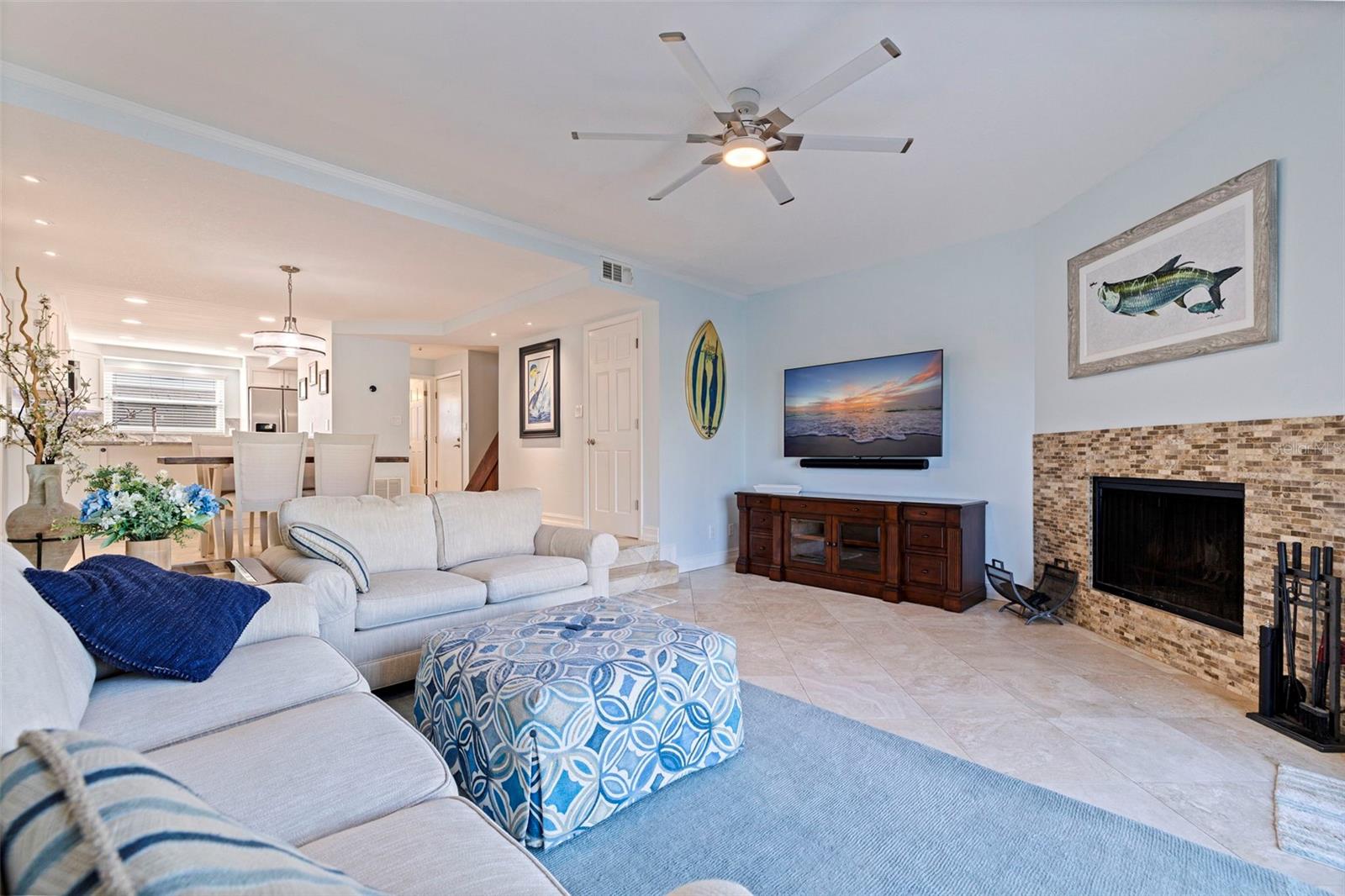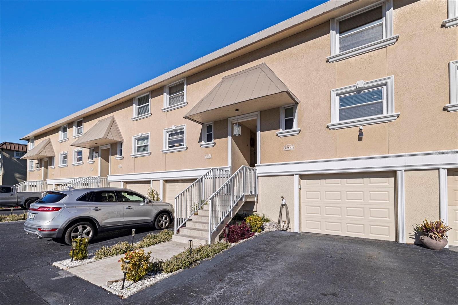 Completely updated turn-key 3-story waterfront townhome-style condominium in the heart of Treasure Island, ideal for boating and coastal living. This 2-bedroom, 2.5-bath residence includes an oversized utility room that could be converted into a third bedroom or home office. West-facing orientation provides stunning sunset, beach, and Intracoastal Waterway views. The property includes a private deep-water boat slip that can accommodate a boat up to approximately 36 feet, with a newer 13,000-lb boat lift. Quick open-water access allows you to reach John’s Pass and the Gulf of Mexico within minutes. Two large balconies, each approximately 17 feet by 5 feet, overlook the Intracoastal Waterway—perfect for enjoying coastal breezes and waterfront sunsets. The residence has been completely updated and is truly move-in ready, featuring an updated kitchen with bush-hammered granite countertops and slab-style backsplash creating a coastal, weathered look, stainless steel appliances, travertine marble flooring throughout the second floor, beautifully remodeled bathrooms, an updated fireplace, newer insulated windows and sliding glass doors throughout, and fresh interior paint. The building is elevated and constructed of all concrete block, providing quiet, safe, and peaceful living with lower flood risk. Additional features include a new AC system (2024), EV charging outlet in the garage, remote-controlled window shades, new garage door with screw-drive automatic opener, new hot water heater, water softener, and whole-house water filtration system. Parking includes an oversized one-car garage plus two designated parking spaces, along with a large ground-floor air-conditioned bonus/storage room of approximately 320 square feet. Association fee includes dock maintenance, building and exterior maintenance, roof, flood insurance, exterior building insurance, water, trash. Located just minutes by bike to the beach or downtown Treasure Island, with dining, entertainment, shopping, and a grocery store nearby—offering true island living with convenience and waterfront access.