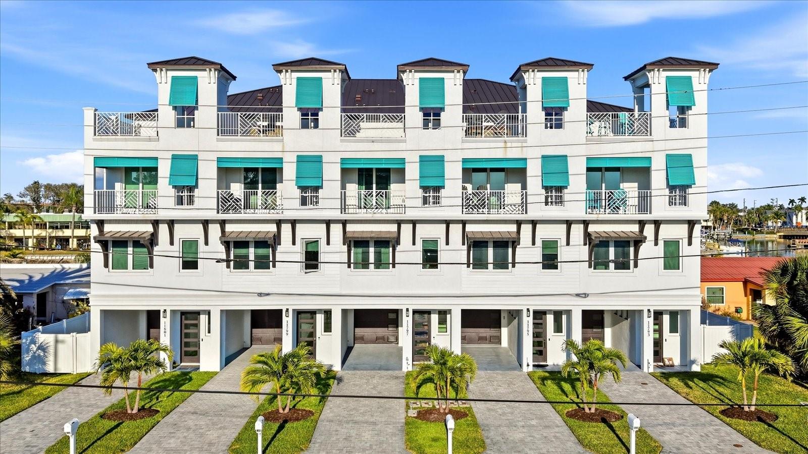 Welcome to a life of coastal elegance, where the spirit of the British West Indies meets the sun-drenched shores of Treasure Island. This exceptional three-bedroom, three-bath townhome represents the pinnacle of CAT 5 block construction, offering both timeless resilience and effortless luxury. Designed for those who seek a seamless blend of daily comfort and refined sophistication, every detail has been curated to fulfill your vision of the perfect waterfront retreat. Step inside to discover three levels of breathtaking, panoramic views, easily accessed by your private elevator and best enjoyed from a succession of expansive balconies or your own rooftop terrace. The stunning, open living space is ideal for entertaining, flowing gracefully from spacious, airy interiors to the outdoors. Your home’s finishes have been selected from a designer-grade collection, ensuring a cohesive ambiance of luxury coastal style throughout your personal oasis. This residence is crafted for the boating and waterfront lifestyle, complete with a deep, open-water boat slip on the resident dock, providing easy access to the Gulf. Outside, relish in sunset views over the Gulf from your west-facing balcony, or watch the activity along the channel from your east-facing spaces. Above it all, your private rooftop terrace awaits, with stunning sunset views over the sparkling blue gulf, and room for relaxing hot tub under the open sky. You are literally one short block walk to the sugar sands of Treasure Island! Additional refined features include an open chef’s kitchen with high-end appliances, a wine refrigerator, a water softener, and a tankless water heater. The residence also offers generous walk-in closets and an oversized two-car garage. Nestled within a sought-after beach community, your new lifestyle includes access to a resort-style pool and cabana, all while being minutes from soft sandy beaches, renowned dining, and vibrant arts and culture. This is more than a home—it’s a permanent luxury getaway, where clean architectural lines and tropical touches create a timeless, resort-style sanctuary. For floor plans or to schedule a private tour of this model-home-perfect residence, reach out today. Your relaxed, waterfront lifestyle awaits.