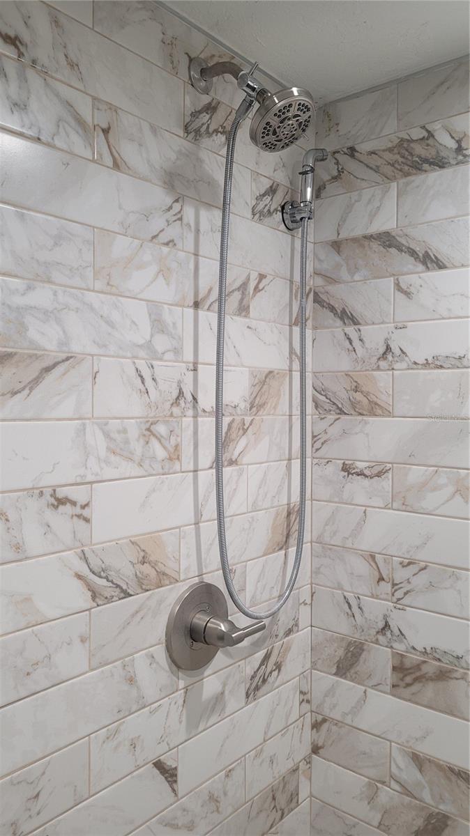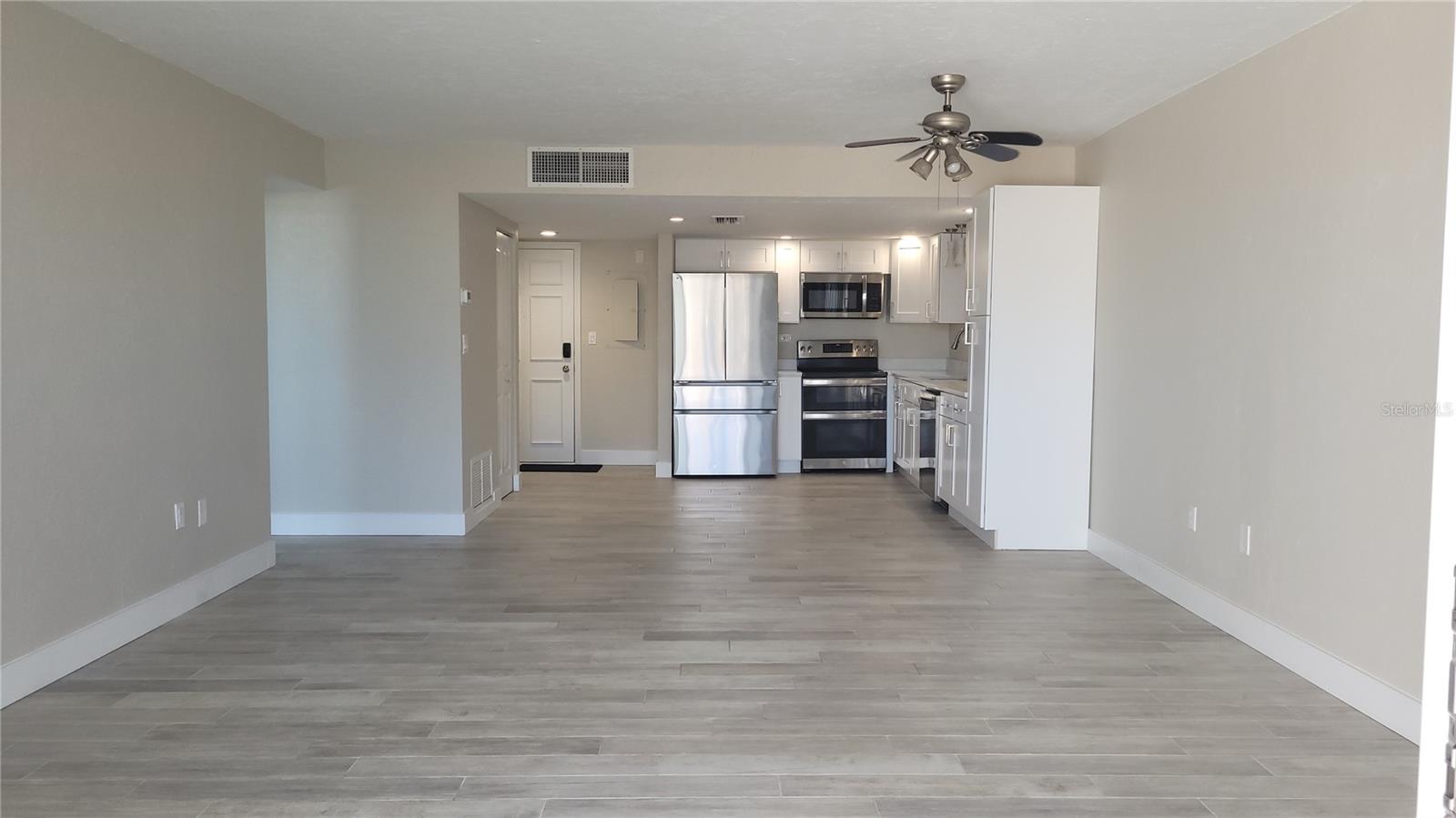 One or more photo(s) has been virtually staged. Treasure Island Tennis and Yacht condo completely renovated corner 1 bedroom 1.5 bath with bonus walk out patio area. This condo has an open floor plan, a beach vibe with coastal tones. Gorgeous ceramic tile through out, open kitchen area with ample counter and cabinet space. Stylish shaker wood cabinetry, neutral granite counter tops, LG stainless appliances. Upgraded range, double oven with air fry features and more. Floor to ceiling sliding glass doors lead to your private walk out patio area with bonus area for storage or even a garden if you have a green thumb. Create your own space, great for entertaining. Large bedroom with lots of natural light, dressing area plus a large wall to wall closet, new double vanity area plus a walk in linen/storage linen closet. Separate shower and water closet area makes it ideal for 2 persons. Beautifully tiled large walk in shower with glass door enclosure. Washer and dryer are located just off of the dressing area.