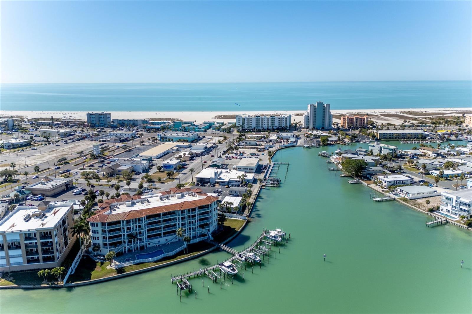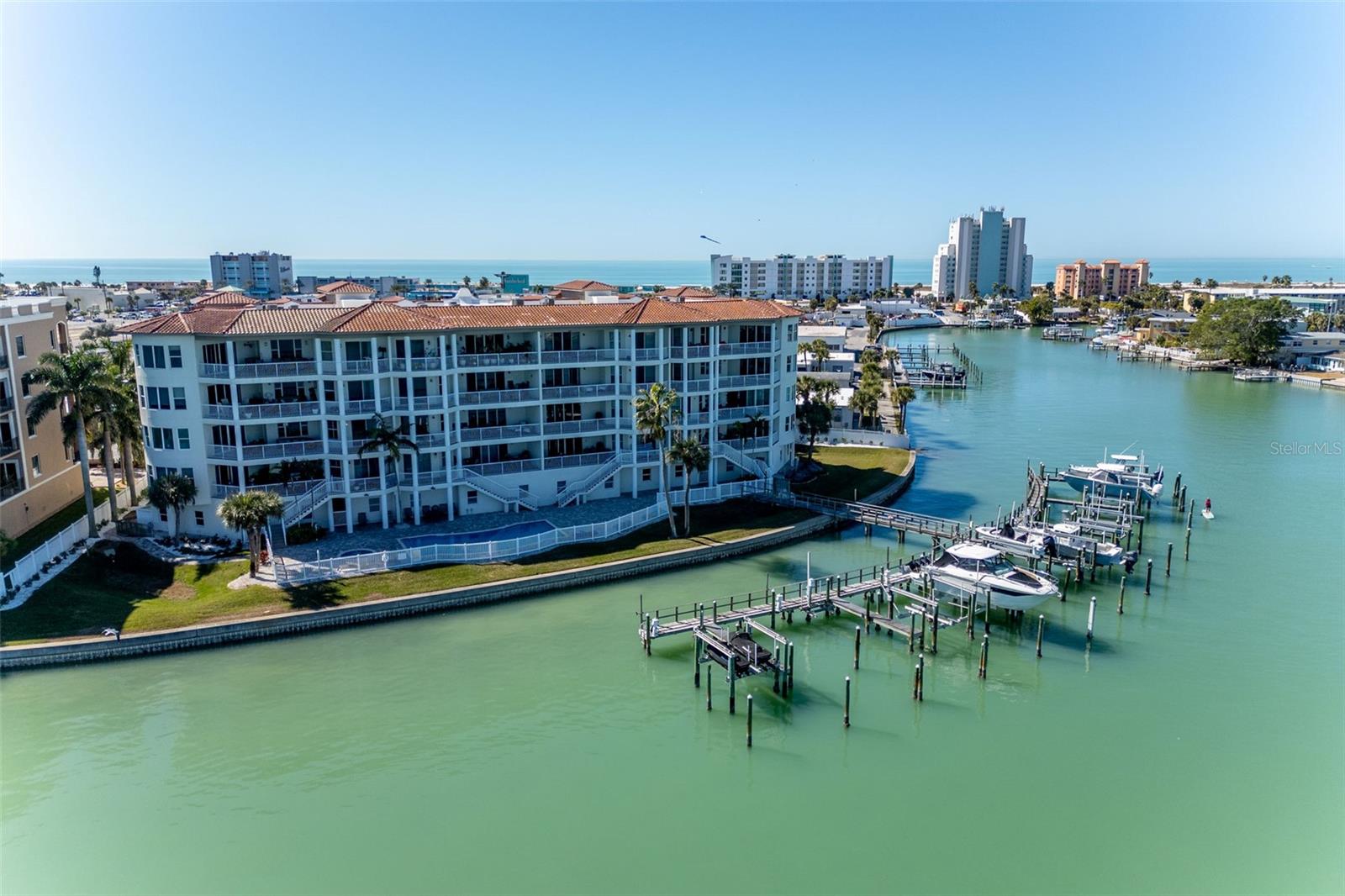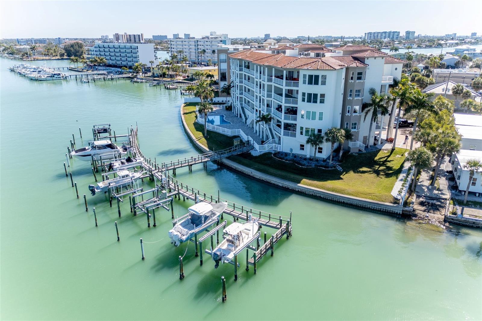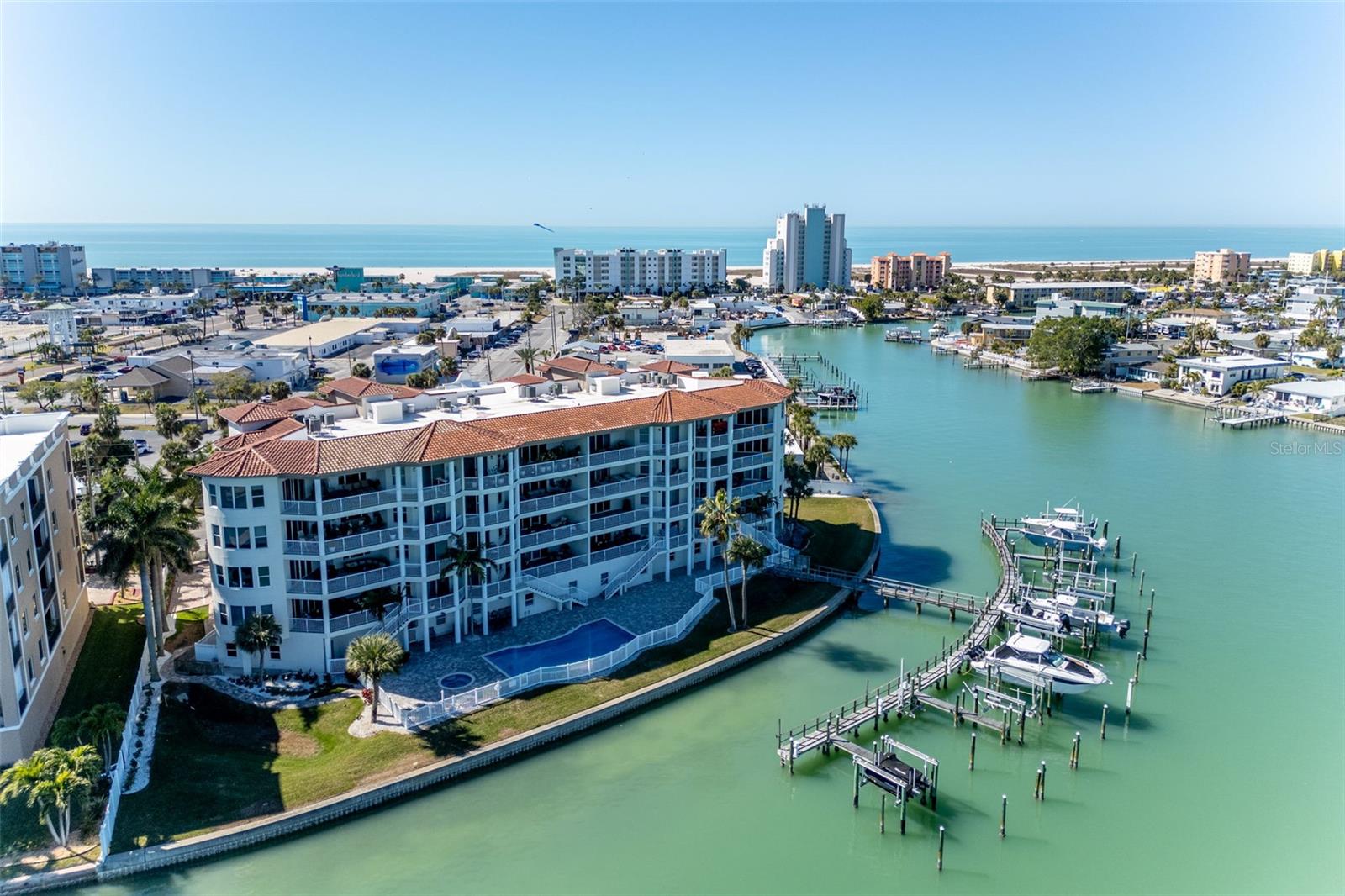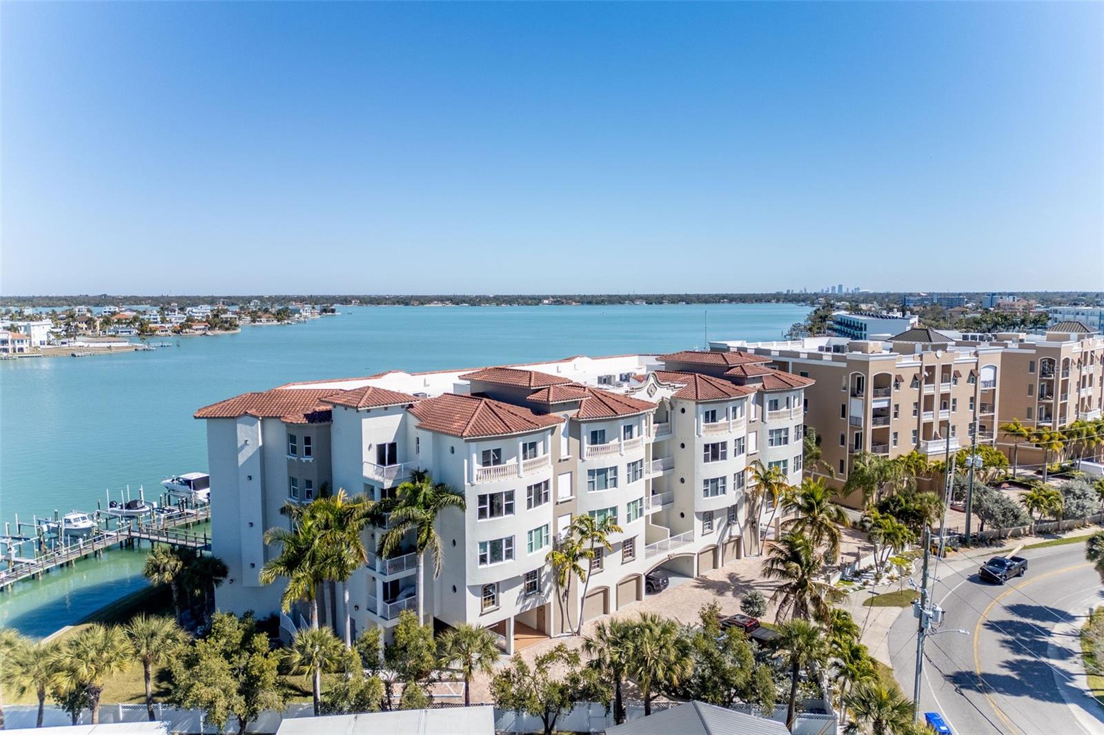 Experience the ultimate in Florida island living at La Bella Vita, an exclusive gated waterfront community of only 16 residences, ideally located on the bay and just one block from desirable Treasure Island Beach. This newer, secured building features a private lobby entrance and high-speed semi-private elevator. Complete Coastal Package-this rare expansive end condo residence offers over 3,100 square feet with 4 bedrooms, 3.5 baths, a private 2-car garage-equipped with 48 AMP EV charging station, and deep water boat slip with easy Gulf access. The artful, open, light-filled floor plan showcases 10’ ceilings, tray ceilings, crown molding, designer lighting. You will enjoy the expansive kitchen with granite countertops, wood cabinetry with pull-out shelving, glass tile backsplashes, and stainless steel appliances. The luxurious primary suite features direct balcony access, stunning water views, an oversized walk-in closet, and a spa-inspired bath with garden Jacuzzi tub, oversized tiled shower with dual heads and seating. A second bedroom also enjoys access to a private balcony. Enjoy sweeping bay views from the private oversized balconies, and every room, enhanced by the highly desirable end-unit location. Resort-style amenities include a heated waterfront pool and spa, paver sun deck, dock, and a deeded boat slip — perfect for boating enthusiasts to explore our vibrant coastal community. Ideally situated between St. Pete Beach and Madeira Beach, and just minutes by boat to the Gulf. Convenient to Clearwater Beach, Downtown St. Petersburg, and Tampa International Airport. Enjoy breathtaking sunrises, nightly skies, dolphins in the bay, and easy strolls to shops, restaurants, and entertainment in charming Treasure Island. This is a rare opportunity to own luxury waterfront living in one of Florida’s most desirable island settings.