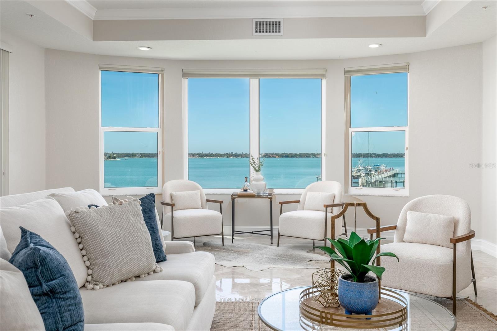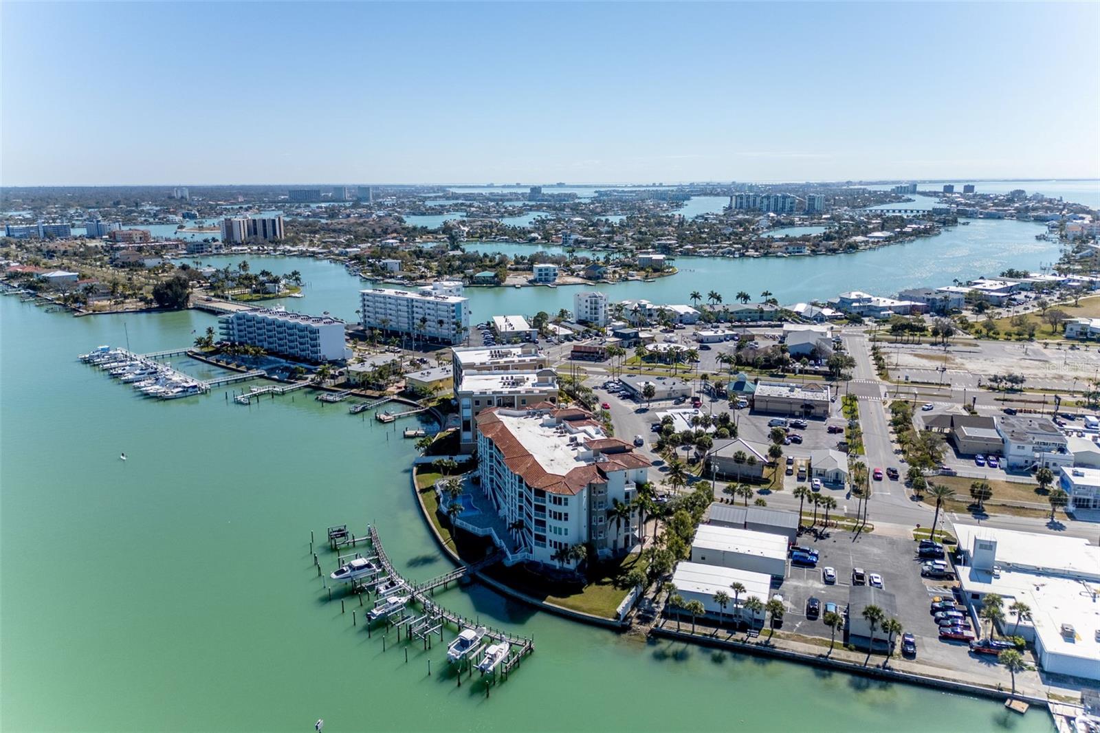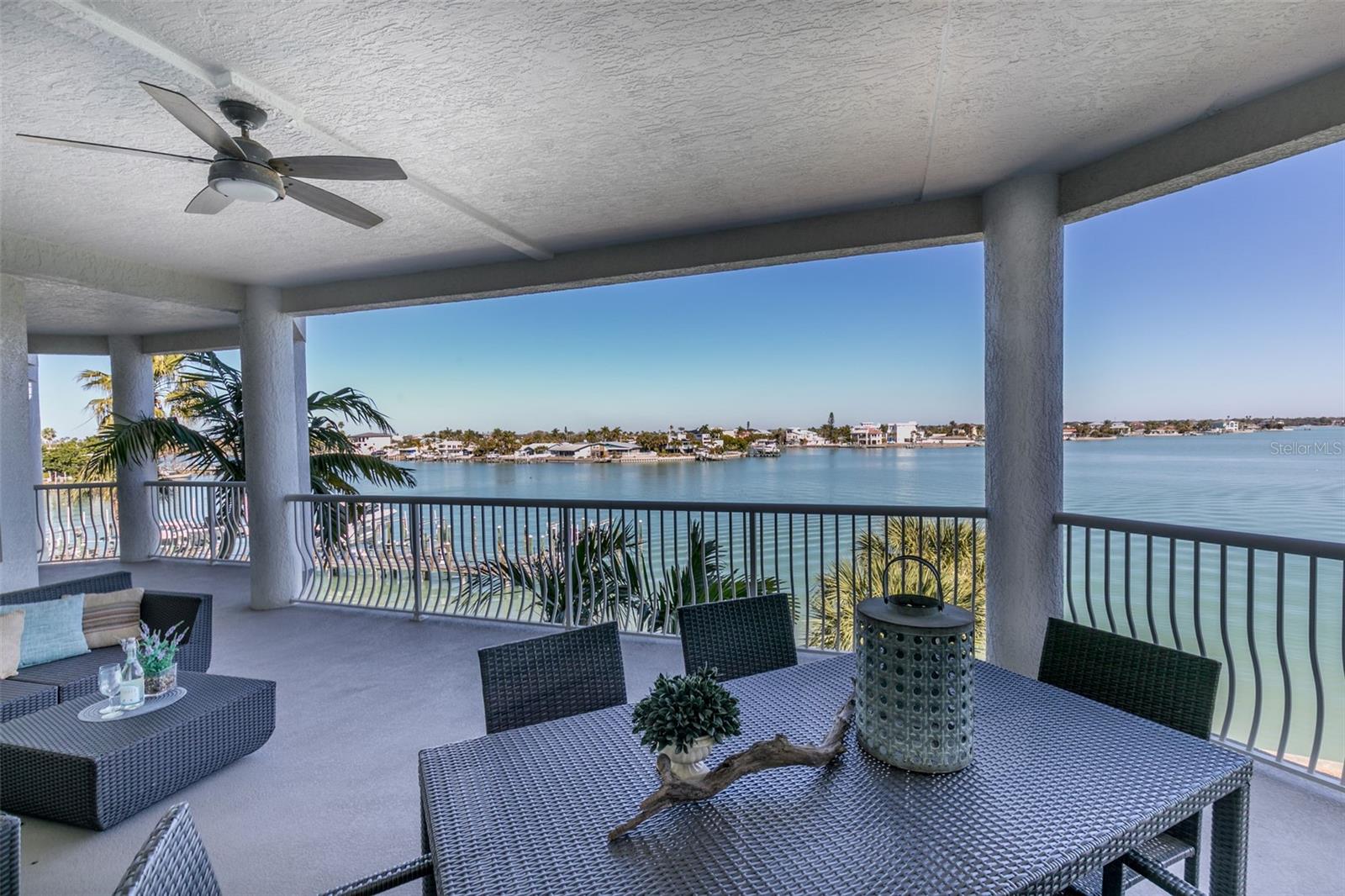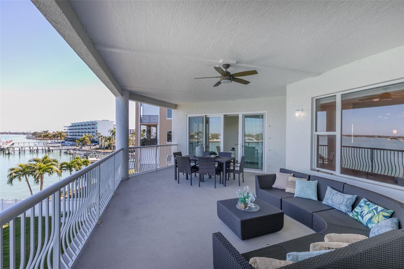 Experience the ultimate in Florida island living at La Bella Vita, an exclusive gated waterfront community of only 16 residences, ideally located on the bay and just one block from desirable Treasure Island Beach. This newer, secured building features a private lobby entrance and high-speed semi-private elevator. Complete Coastal Package-this rare expansive end condo residence offers over 3,100 square feet with 4 bedrooms, 3.5 baths, a private 2-car garage-equipped with 48 AMP EV charging station, and deep water boat slip with easy Gulf access. The artful, open, light-filled floor plan showcases 10’ ceilings, tray ceilings, crown molding, designer lighting. You will enjoy the expansive kitchen with granite countertops, wood cabinetry with pull-out shelving, glass tile backsplashes, and stainless steel appliances. The luxurious primary suite features direct balcony access, stunning water views, an oversized walk-in closet, and a spa-inspired bath with garden Jacuzzi tub, oversized tiled shower with dual heads and seating. A second bedroom also enjoys access to a private balcony. Enjoy sweeping bay views from the private oversized balconies, and every room, enhanced by the highly desirable end-unit location. Resort-style amenities include a heated waterfront pool and spa, paver sun deck, dock, and a deeded boat slip — perfect for boating enthusiasts to explore our vibrant coastal community. Ideally situated between St. Pete Beach and Madeira Beach, and just minutes by boat to the Gulf. Convenient to Clearwater Beach, Downtown St. Petersburg, and Tampa International Airport. Enjoy breathtaking sunrises, nightly skies, dolphins in the bay, and easy strolls to shops, restaurants, and entertainment in charming Treasure Island. This is a rare opportunity to own luxury waterfront living in one of Florida’s most desirable island settings.