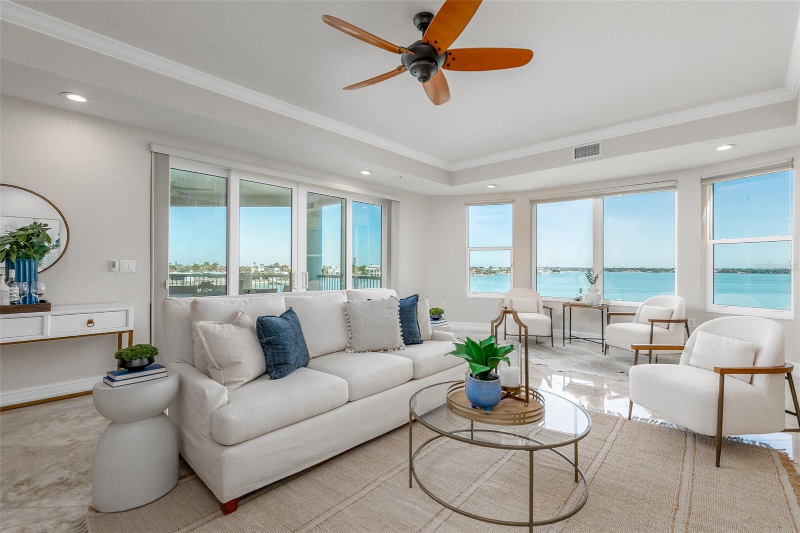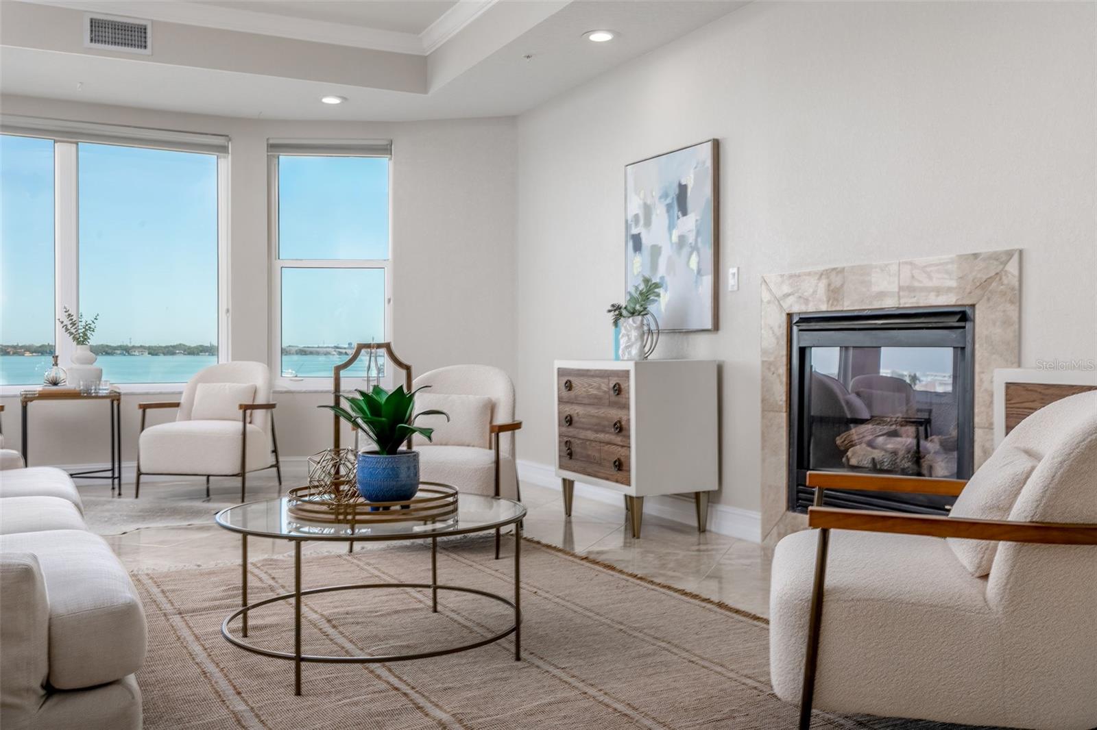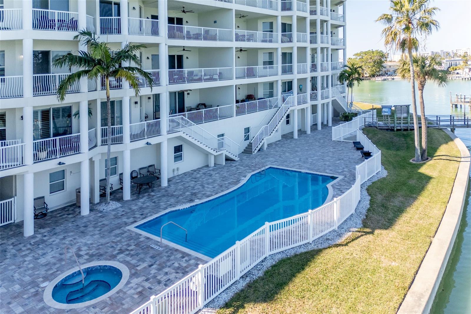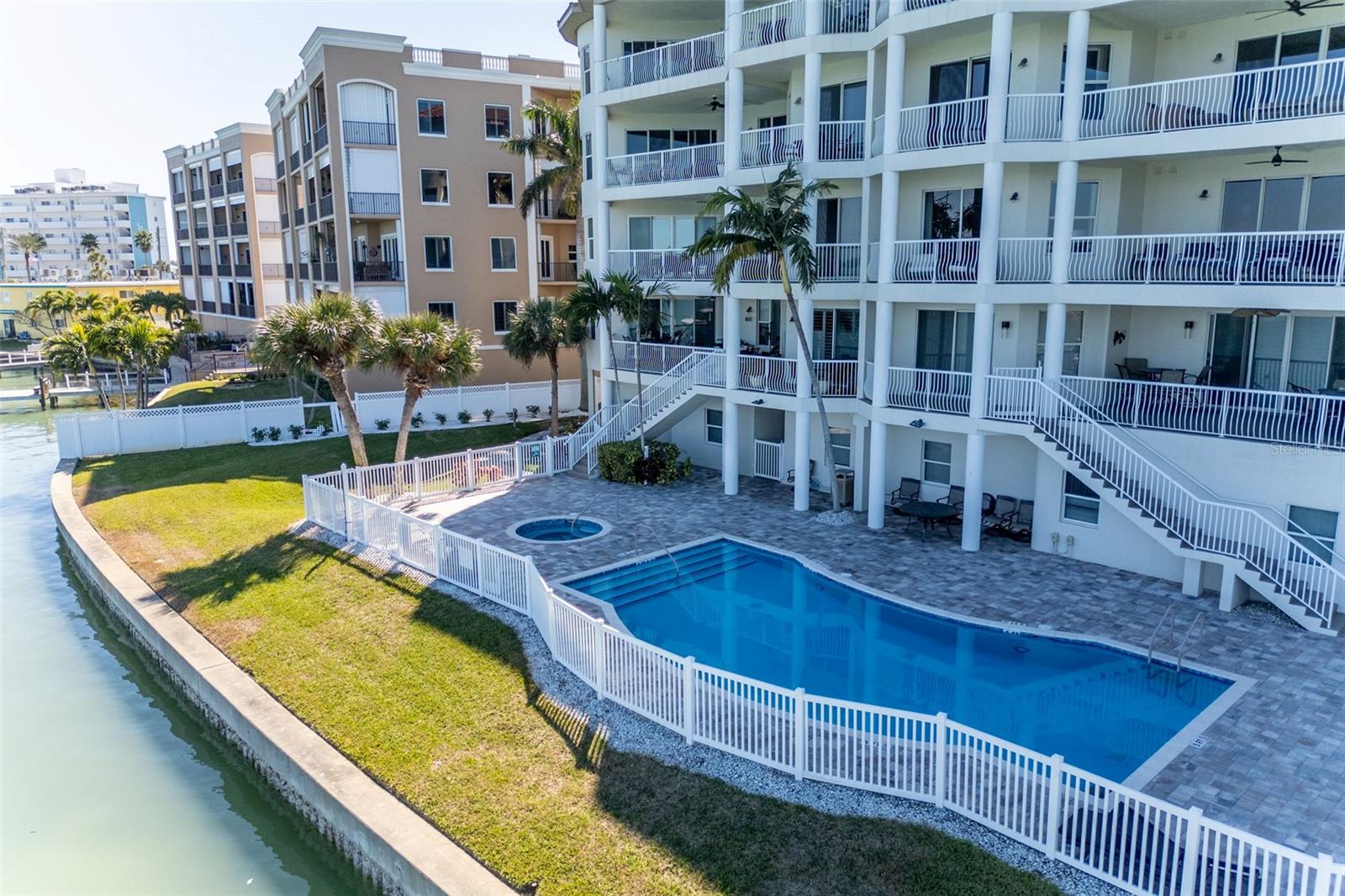 Experience the ultimate in Florida island living at La Bella Vita, an exclusive gated waterfront community of only 16 residences, ideally located on the bay and just one block from desirable Treasure Island Beach. This newer, secured building features a private lobby entrance and high-speed semi-private elevator. Complete Coastal Package-this rare expansive end condo residence offers over 3,100 square feet with 4 bedrooms, 3.5 baths, a private 2-car garage-equipped with 48 AMP EV charging station, and deep water boat slip with easy Gulf access. The artful, open, light-filled floor plan showcases 10’ ceilings, tray ceilings, crown molding, designer lighting. You will enjoy the expansive kitchen with granite countertops, wood cabinetry with pull-out shelving, glass tile backsplashes, and stainless steel appliances. The luxurious primary suite features direct balcony access, stunning water views, an oversized walk-in closet, and a spa-inspired bath with garden Jacuzzi tub, oversized tiled shower with dual heads and seating. A second bedroom also enjoys access to a private balcony. Enjoy sweeping bay views from the private oversized balconies, and every room, enhanced by the highly desirable end-unit location. Resort-style amenities include a heated waterfront pool and spa, paver sun deck, dock, and a deeded boat slip — perfect for boating enthusiasts to explore our vibrant coastal community. Ideally situated between St. Pete Beach and Madeira Beach, and just minutes by boat to the Gulf. Convenient to Clearwater Beach, Downtown St. Petersburg, and Tampa International Airport. Enjoy breathtaking sunrises, nightly skies, dolphins in the bay, and easy strolls to shops, restaurants, and entertainment in charming Treasure Island. This is a rare opportunity to own luxury waterfront living in one of Florida’s most desirable island settings.