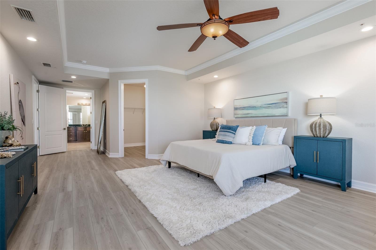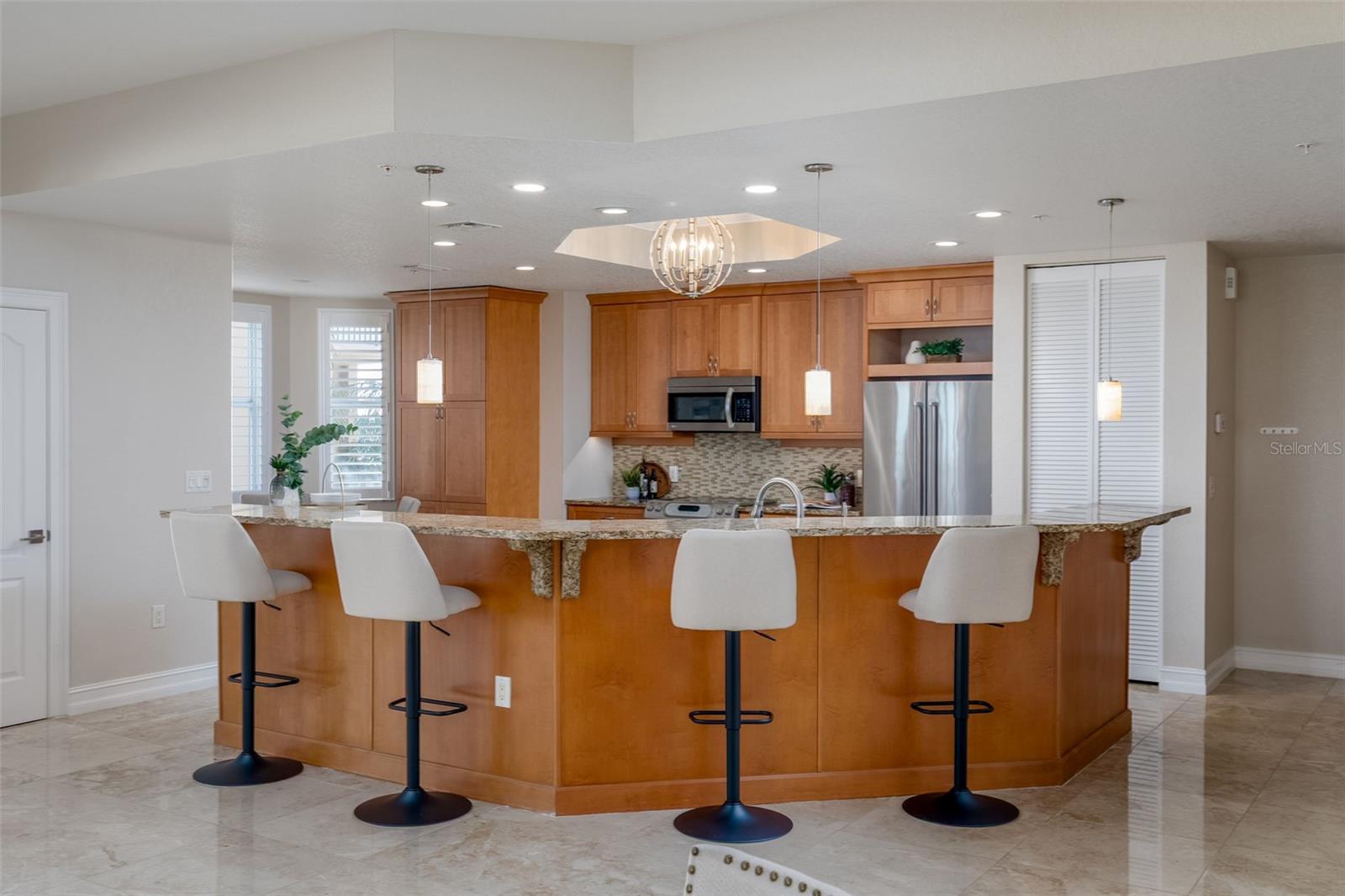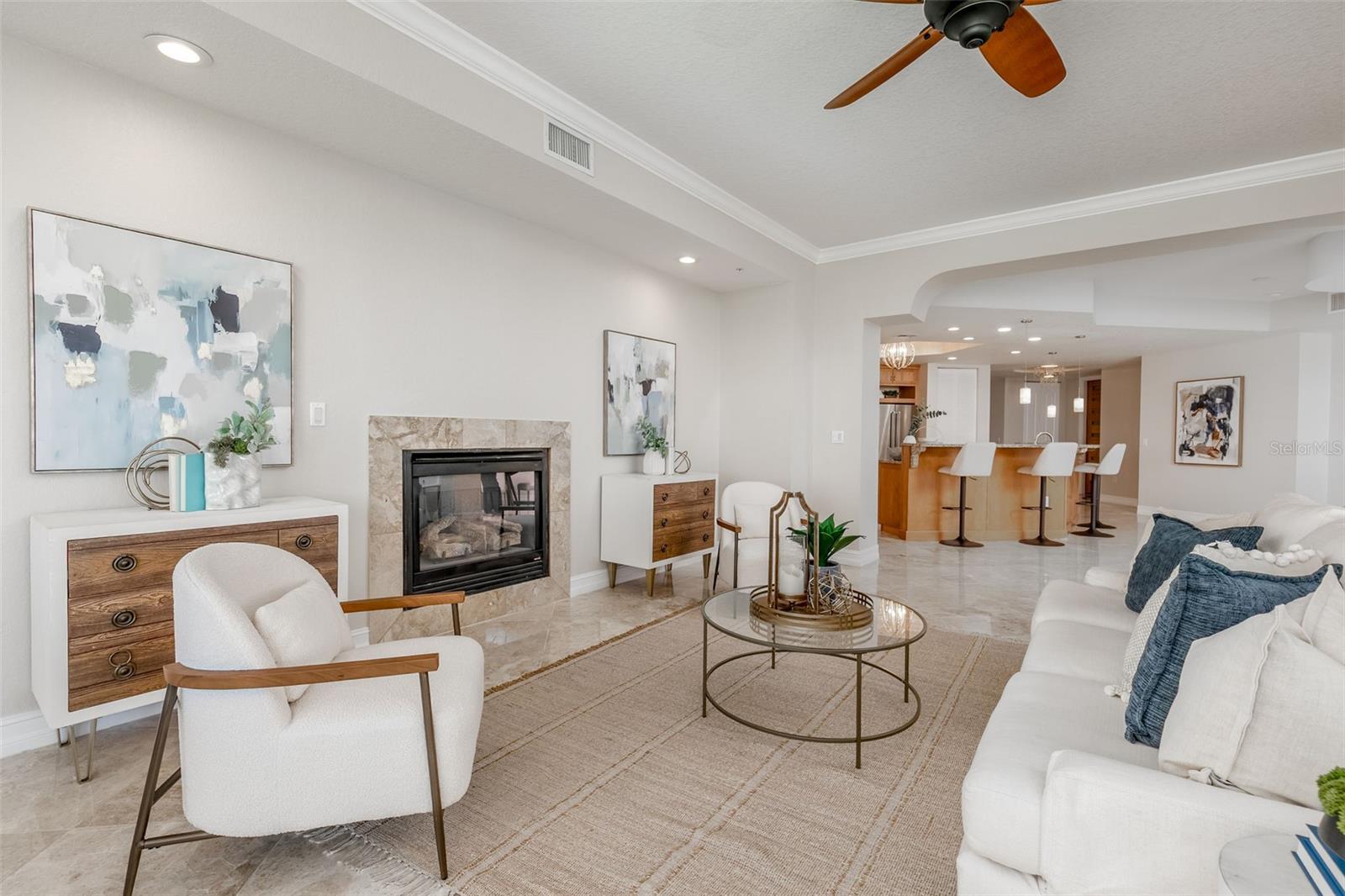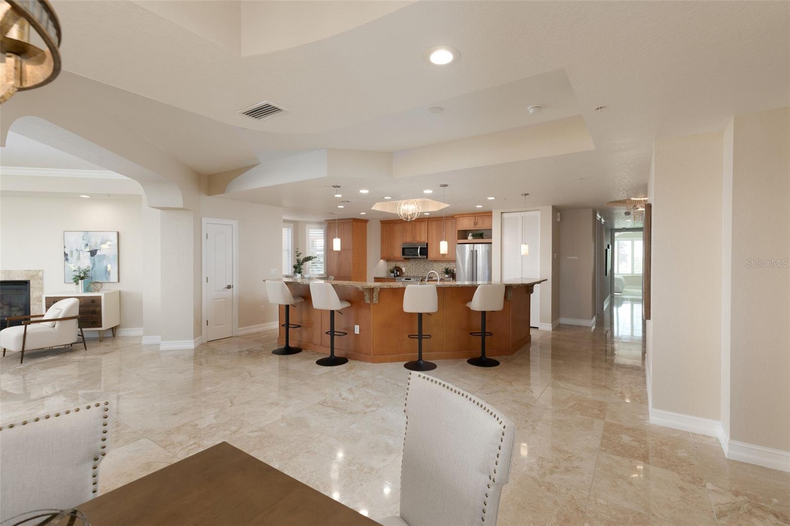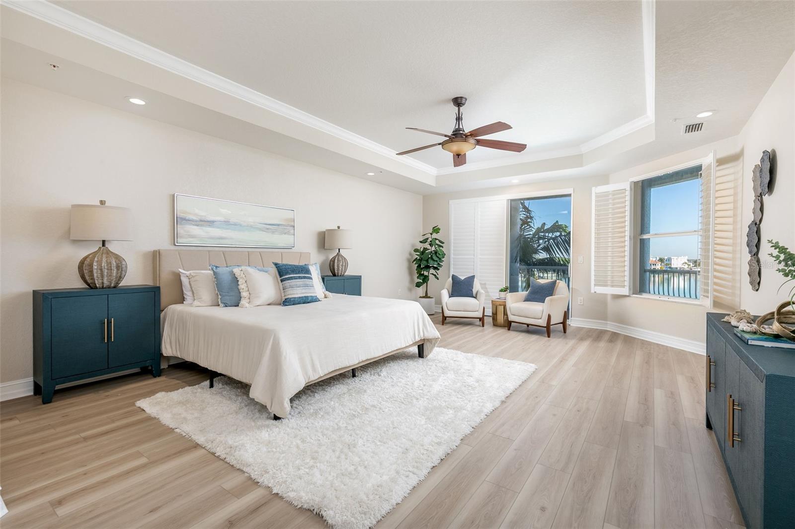Experience the ultimate in Florida island living at La Bella Vita, an exclusive gated waterfront community of only 16 residences, ideally located on the bay and just one block from desirable Treasure Island Beach. This newer, secured building features a private lobby entrance and high-speed semi-private elevator. Complete Coastal Package-this rare expansive end condo residence offers over 3,100 square feet with 4 bedrooms, 3.5 baths, a private 2-car garage-equipped with 48 AMP EV charging station, and deep water boat slip with easy Gulf access. The artful, open, light-filled floor plan showcases 10’ ceilings, tray ceilings, crown molding, designer lighting. You will enjoy the expansive kitchen with granite countertops, wood cabinetry with pull-out shelving, glass tile backsplashes, and stainless steel appliances. The luxurious primary suite features direct balcony access, stunning water views, an oversized walk-in closet, and a spa-inspired bath with garden Jacuzzi tub, oversized tiled shower with dual heads and seating. A second bedroom also enjoys access to a private balcony. Enjoy sweeping bay views from the private oversized balconies, and every room, enhanced by the highly desirable end-unit location. Resort-style amenities include a heated waterfront pool and spa, paver sun deck, dock, and a deeded boat slip — perfect for boating enthusiasts to explore our vibrant coastal community. Ideally situated between St. Pete Beach and Madeira Beach, and just minutes by boat to the Gulf. Convenient to Clearwater Beach, Downtown St. Petersburg, and Tampa International Airport. Enjoy breathtaking sunrises, nightly skies, dolphins in the bay, and easy strolls to shops, restaurants, and entertainment in charming Treasure Island. This is a rare opportunity to own luxury waterfront living in one of Florida’s most desirable island settings.