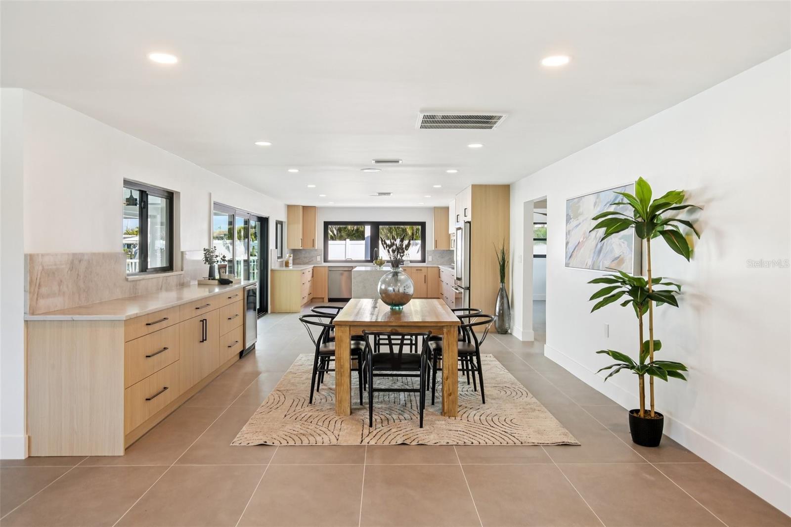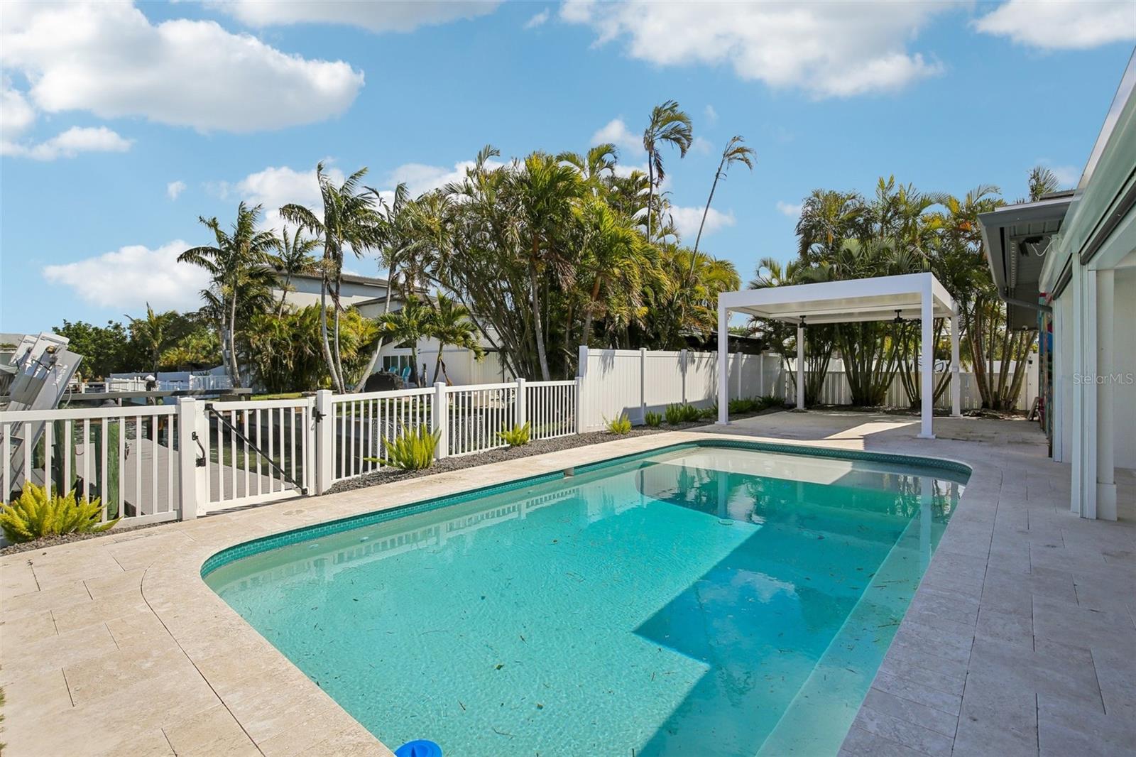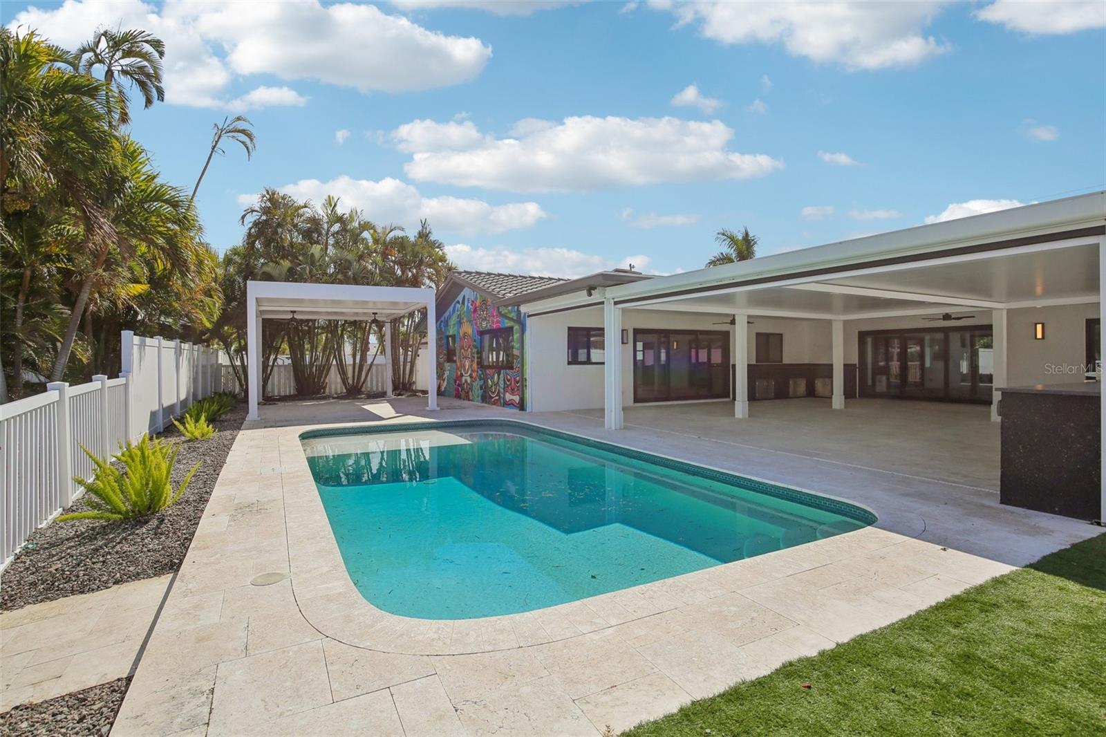 Welcome to 12125 5th St E, a masterpiece of waterfront engineering and design tucked away in the coveted Isle of Capri neighborhood of Treasure Island. This meticulously renovated 4-bedroom, 3-bathroom home seamlessly blends high-end luxury with the relaxed Florida boating lifestyle, situated just minutes from John's Pass and the open waters of the Gulf of Mexico. Step inside to discover a stunning open concept defined by 12x24 tile flooring and a smart split floor plan that ensures privacy for the primary suite. The heart of the home is the completely renovated gourmet kitchen, featuring custom cabinetry, Cafe smart appliances, and breathtaking Taj Mahal Quartzite counters imported specifically from Brazil. Whether you are cooking for two or twenty, the flow is effortless, aided by Klipsch surround sound audio that runs throughout the home. The interior living space expands instantly via wall-to-wall sliding glass doors that open to an oversized back patio, creating the ultimate indoor-outdoor experience. Here, you will find a one-of-a-kind mural hand-painted by the renowned Vitali Brothers, serving as the backdrop to your entertaining haven. The incredible outdoor kitchen is equipped with top-tier TrueFlame components—including a 4-burner grill, warmer, and flat top—while split seating areas offer ample room to enjoy the water views. Boating enthusiasts will appreciate the brand-new Trex composite dock and the 12,000-lb boat lift. Peace of mind is standard here, with a newer seawall cap and bulkhead, a Trane HVAC (2022), a new water heater, and windows/sliding glass doors all replaced in 2022. The bathrooms are equally impressive, featuring Vanfoxle shower systems and Moen fixtures. Located moments from fine dining, shopping, and white sandy beaches, this turn-key residence offers the best of Treasure Island living.