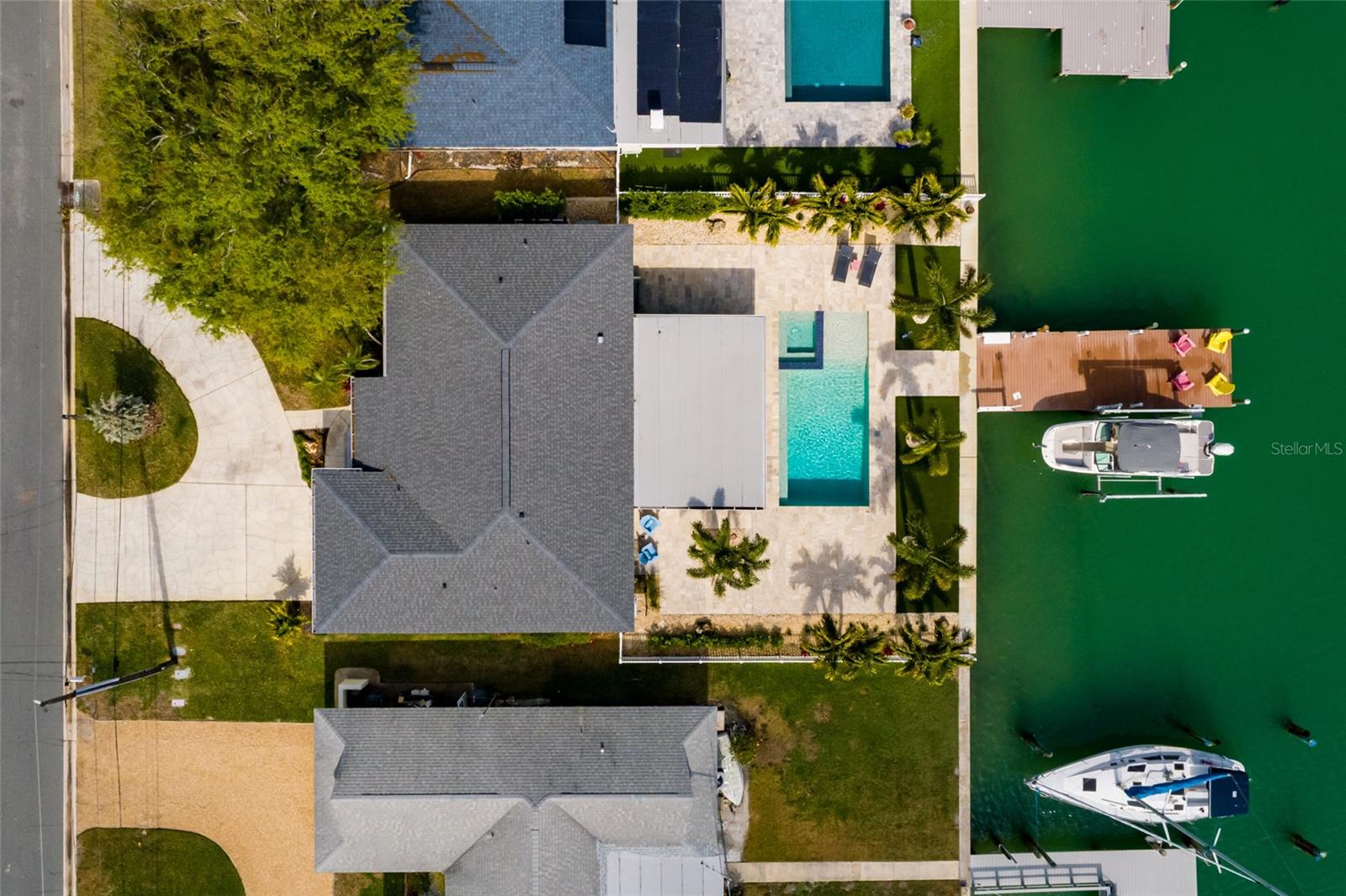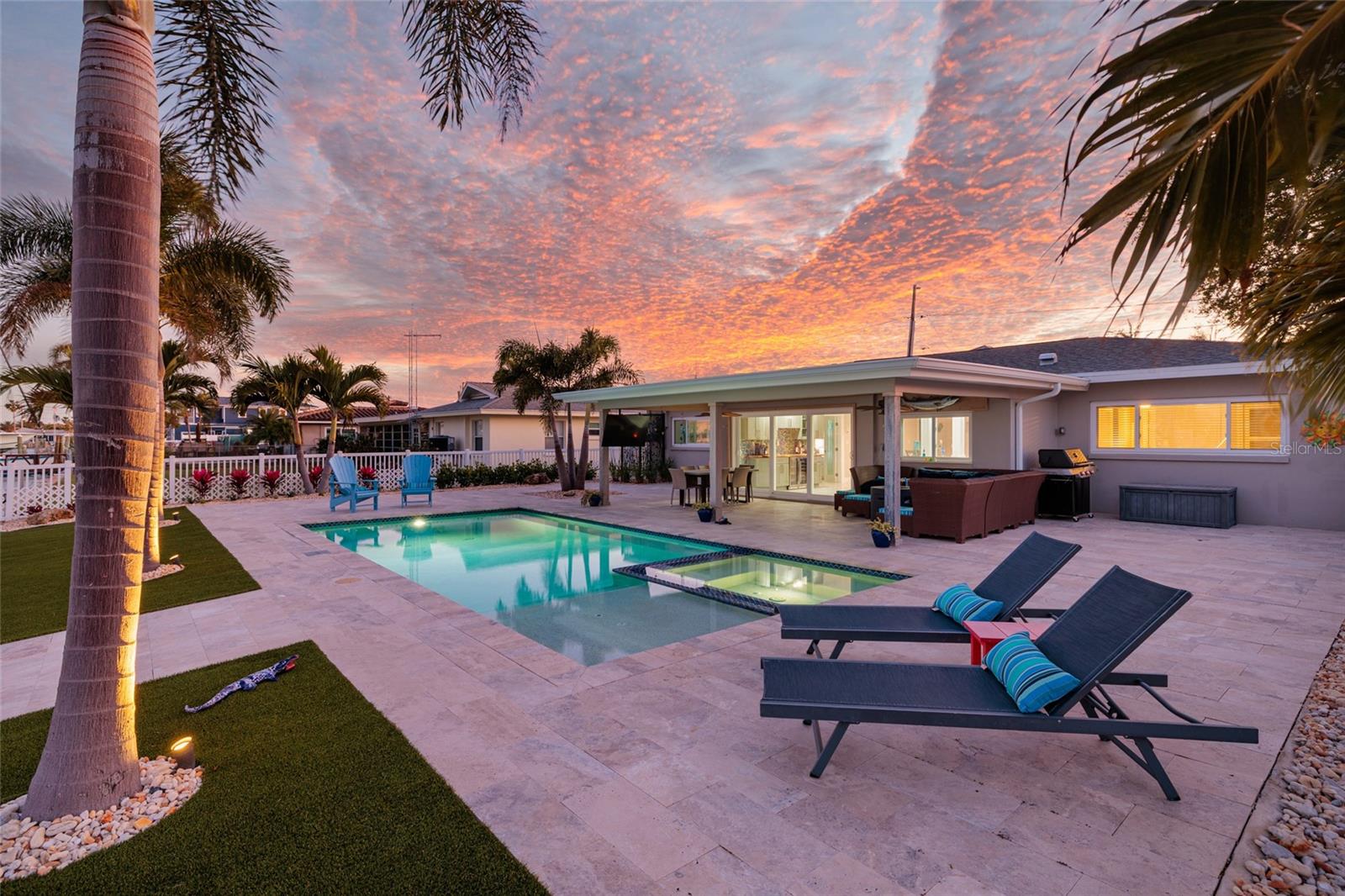 Nestled on Treasure Island’s premier Isle of Capri waterfront, this coastal sanctuary offers 3 bedrooms and 3 full baths in a meticulously updated residence with an open-plan layout and water views. Boating enthusiasts will appreciate 70 feet of deep-water frontage, a 48-foot extended dock with a 13,000 lb boat lift, dock-side electric and water, dock lights, all secured by a 2022 seawall with a large cap providing lasting durability. Interior highlights include marble floors throughout for timeless coastal elegance, storm-rated windows and doors, and fully rewired electrical systems plus a 2025 HVAC and water heater. Major upgrades span the kitchen and baths with stylish vanities and cabinets and GE Profile appliances. The oversized kitchen features a center island and a separate bar with a custom live-edge top complemented by quartz countertops, all with water views. The primary suite is redesigned with a custom etched-glass entry, a walk-in closet with custom cabinetry, pocket door and a stylish step-in shower. The centerpiece of the home is the outdoor living space featuring the new 30' x 15' gunite saltwater pool with heated/chilled controls, and an integrated hot tub surrounded by travertine tile. The pool area feels like you are on vacation with a soaking deck, mature tropical landscaping, and premium artificial turf, delivering resort-style ambience and effortless maintenance. If you live here you will not want to leave. The garage space was redesigned to bring the laundry facilities inside while adding a stunning new third bathroom. Currently, garage is ideal for one car and your golf cart! Paradise living can be yours.