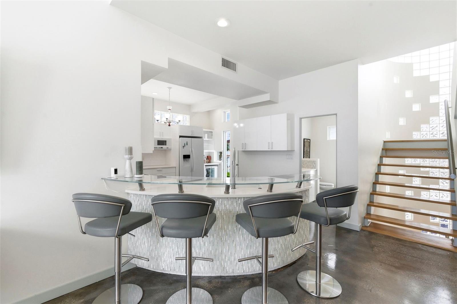 Sunset Beach’s iconic “Glass Block Home,” masterfully envisioned by acclaimed architect Daniel Thayer Dawson, is now available—presenting a rare opportunity to own one of Florida’s West Coast’s most architecturally distinctive residences. Perfectly positioned along the pristine shores of the Gulf of Mexico, this striking three-story contemporary beachfront retreat showcases dramatic 20-foot floor-to-ceiling windows, blending sleek modern design with effortless coastal sophistication. Inside, the home offers a seamless balance of form and function. The soaring glass walls in the living room flood the interior with natural light while framing breathtaking panoramic views of turquoise waters and unforgettable Gulf sunsets. An open-concept layout enhances the sense of space and flow, creating an inviting atmosphere ideal for both everyday living and elegant entertaining. The chef’s kitchen is thoughtfully designed with a state-of-the-art induction cooktop, custom cabinetry, and counter seating for four—perfect for casual dining or gathering with guests. The adjacent living area, defined by its 20-foot ceilings and refined designer finishes, provides a stunning yet comfortable setting for hosting or relaxing. The primary suite serves as a tranquil sanctuary, offering sweeping water views and direct access to a private porch—an ideal place to unwind while watching the sunset or moonlight dance across the Gulf. The spa-inspired ensuite bath features a walk-in shower and a calming, modern aesthetic. A dramatic floating glass walkway leads to the third floor, where a guest bedroom enjoys its own spectacular beach views. An additional bedroom is also located on this level. Each guest suite is designed for comfort and privacy, complete with its own ensuite bath and private porch overlooking the water. Outdoors, the home transforms into a private beachfront oasis. Multiple expansive decks with custom glass railings provide uninterrupted views, creating the perfect setting for sunbathing, entertaining, or dining under the stars. With direct beach access, every day feels like a getaway. Enhancing both convenience and luxury, a striking glass elevator connects all three levels of the home. The ground floor features a freshly updated two-car garage with a new commercial-grade epoxy finish, and ample storage room as well. A rear garage exit opens to a covered lanai with direct beach access, along with a spiral staircase leading to the main living areas. Just a short one-minute walk along the sand brings you to the famous beachfront destination of Caddy’s and the lively and equally famous Ka’Tiki Bar & Gril. Both offer daily live music in a vibrant coastal setting. Whether you’re seeking peaceful beachfront relaxation or a more social atmosphere, this exceptional location offers the best of both worlds. Experience the unmatched design and coastal lifestyle of Sunset Beach’s Glass Block Home—schedule your private showing today.