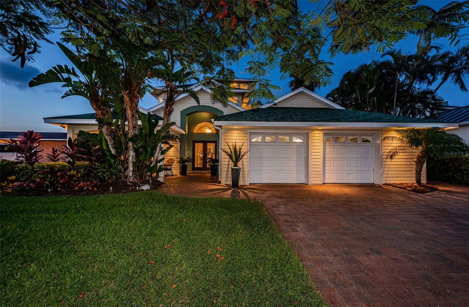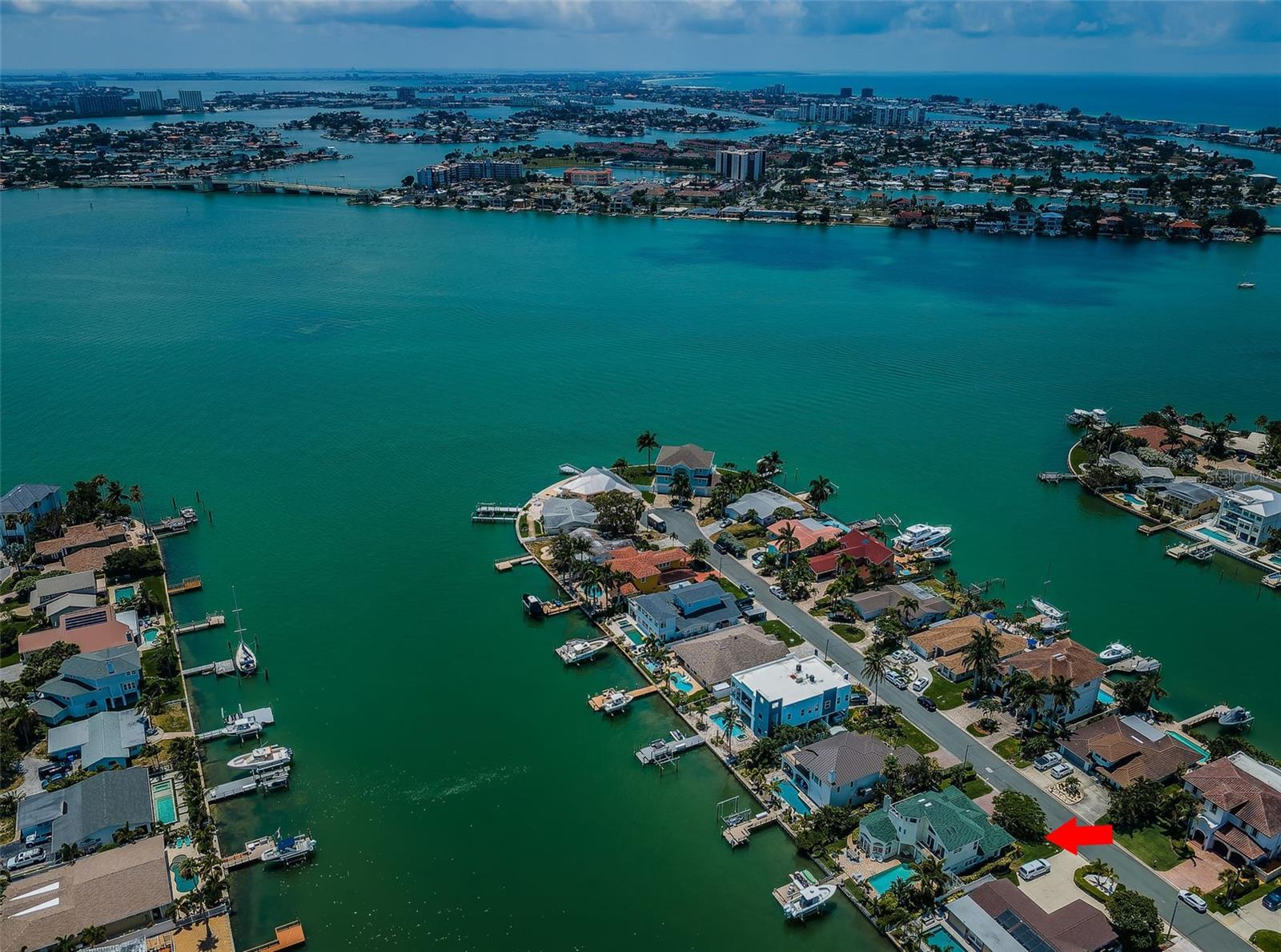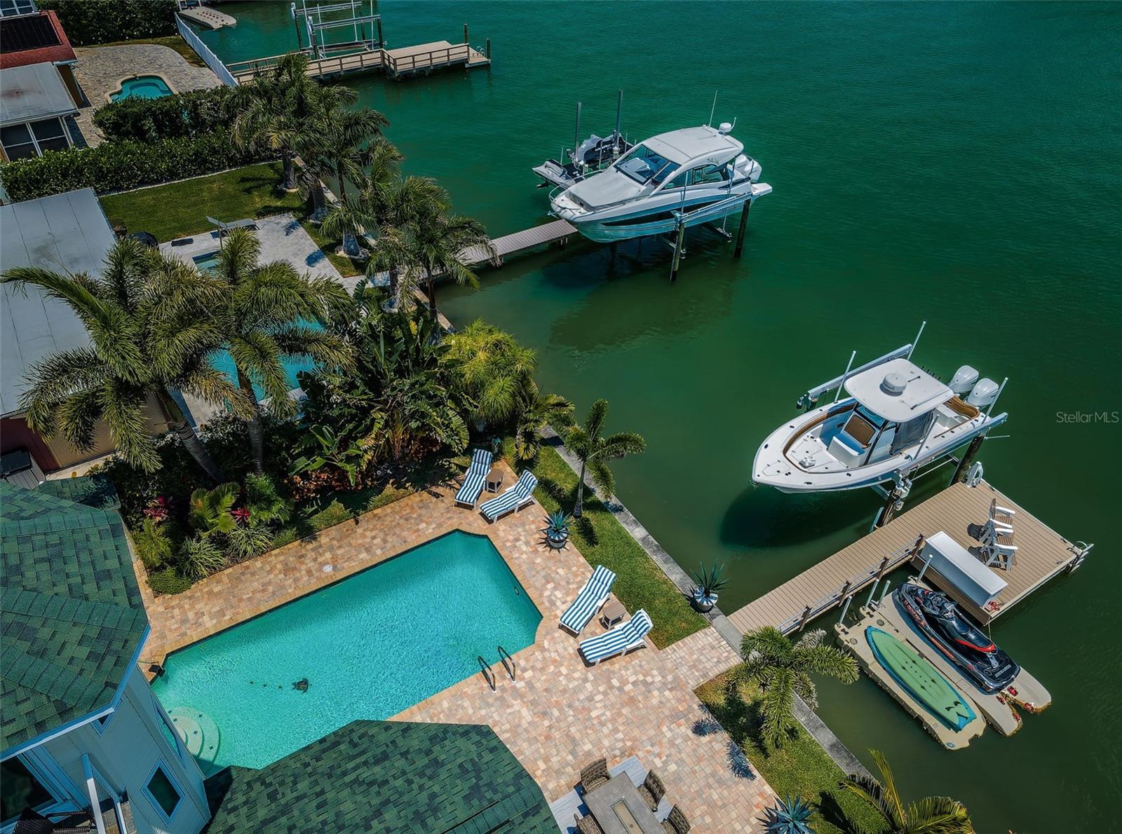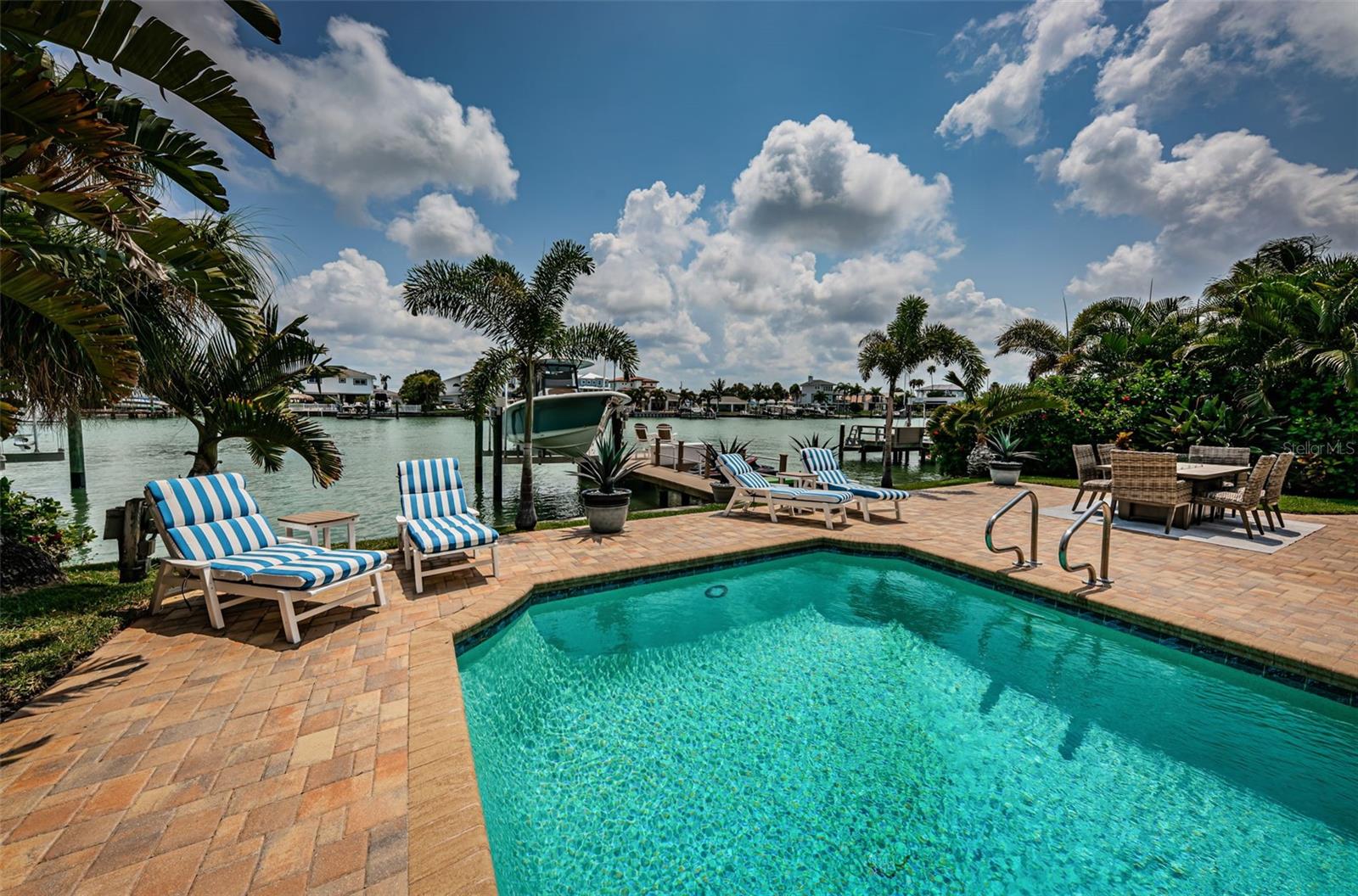 BEAUTIFULLY LANDSCAPED WITH A WONDERFUL SOUTHERN COASTAL APPEAL, THIS GORGEOUS WATERFRONT RESIDENCE OFFERS FABULOUS WATERVIEWS AND RAPID BOATING ACCESS TO THE GULF OF MEXICO! A lovely covered entry with spacious seating area introduces an elegant 13ft-high foyer and a luxuriant home with rich driftwood-style flooring, beautiful woodworking, radiant lighting and superb finishes. The terrific waterfront great room boasts 14ft-high ceilings, a fireplace and entertainment wall, and easy access to the large back yard pool deck. The posh designer kitchen features inspiring quartz surfaces, coastal-white wood cabinetry, high-quality stainless-steel appliances, a large island bar with prep center, and a sizable pantry closet system. The huge open dining area includes a custom, built-in luxury buffet and multi-chiller beverage center. The first level guest suite with splendid full bath, overlooks the waterfront and opens to the pool deck. Separate, full guest bath is beautifully tiled, with graceful fixtures and glasswork. Upstairs, rests the stunning waterfront owner’s suite, with 19ft-high vaulted ceilings, walk-in closet system, dedicated sitting area, and private balcony overlooking the pool deck and waterfront. The posh owner’s bath enjoys a lavish open-concept walk-in rainshower with shower wand, exquisite quartz surfaces, dual vanities and views of your waterfront. You’ll love the terrific upper-level lofted entertainment room with built-in beverage and entertainment center; room delivers dazzling panoramic views of the intracoastal waterway by day, and illuminated Treasure Island by night. Step out to the open deck and take in amazing waterviews in all four directions! Out back, discover a private, lushly-landscaped tropical oasis. A large paver deck (with pavered walkways that extend completely around the home) provides generous space for outdoor dining, with an extended lounging area around the impressive, oversized swimming pool. Your newer composite dock includes a seating area, step down platform for kayaks, and a 13,000 lb boat lift – from here, you’ll be in the Gulf of Mexico in just 10 minutes! This remarkable waterfront home has been meticulously maintained and is the definition of “move in ready.” An uncommon opportunity in an exceptional boating community close to the beach, shopping, dining and entertainment! Buyer to confirm all measurements.
