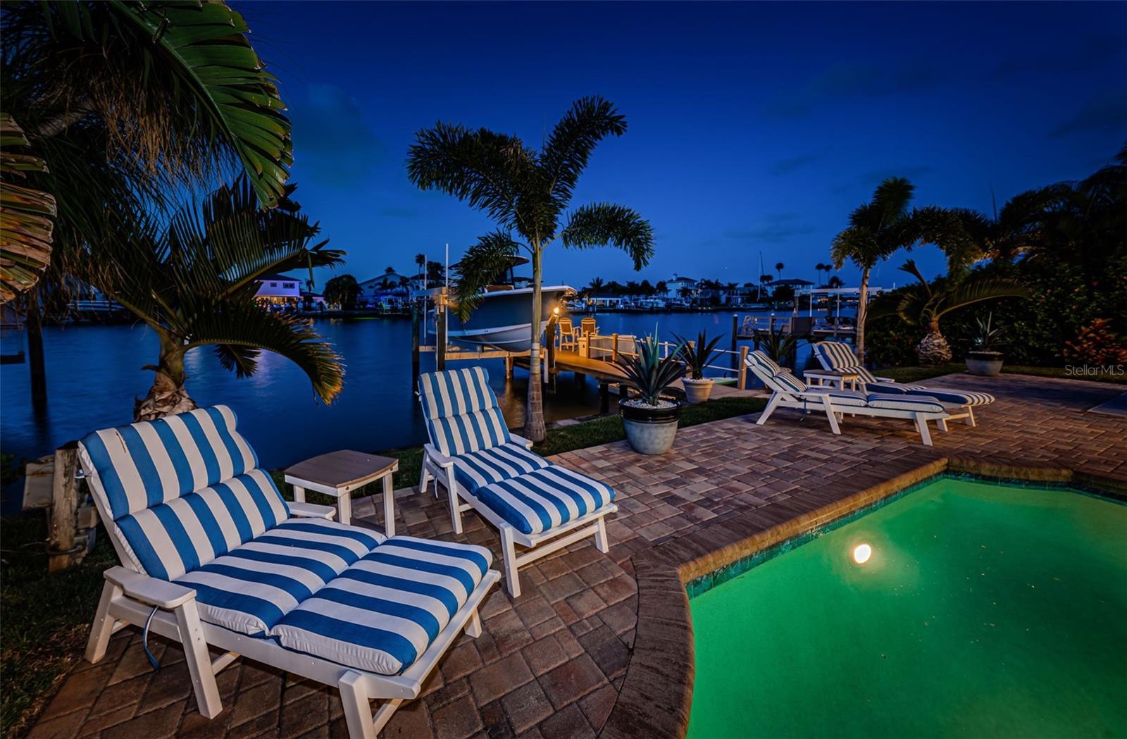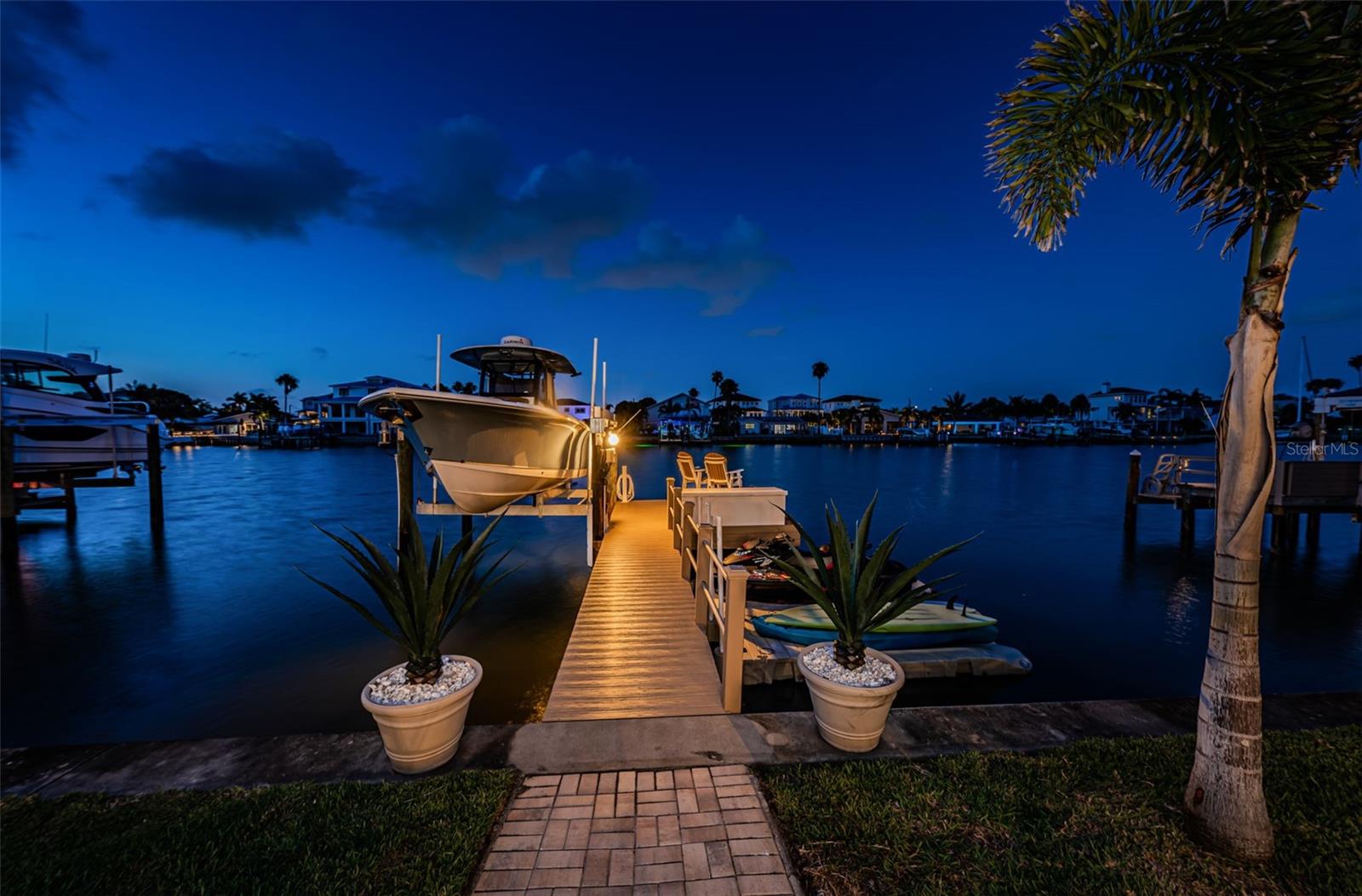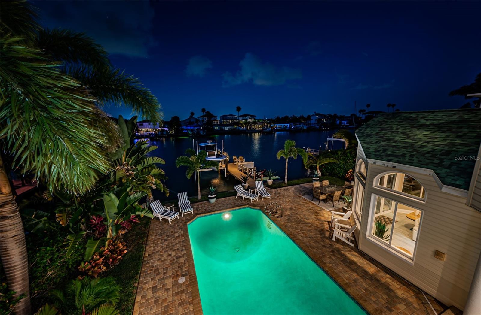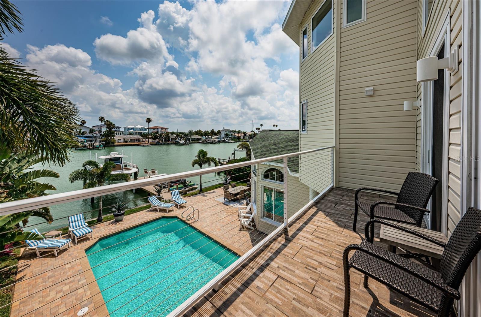 BEAUTIFULLY LANDSCAPED WITH A WONDERFUL SOUTHERN COASTAL APPEAL, THIS GORGEOUS WATERFRONT RESIDENCE OFFERS FABULOUS WATERVIEWS AND RAPID BOATING ACCESS TO THE GULF OF MEXICO! A lovely covered entry with spacious seating area introduces an elegant 13ft-high foyer and a luxuriant home with rich driftwood-style flooring, beautiful woodworking, radiant lighting and superb finishes. The terrific waterfront great room boasts 14ft-high ceilings, a fireplace and entertainment wall, and easy access to the large back yard pool deck. The posh designer kitchen features inspiring quartz surfaces, coastal-white wood cabinetry, high-quality stainless-steel appliances, a large island bar with prep center, and a sizable pantry closet system. The huge open dining area includes a custom, built-in luxury buffet and multi-chiller beverage center. The first level guest suite with splendid full bath, overlooks the waterfront and opens to the pool deck. Separate, full guest bath is beautifully tiled, with graceful fixtures and glasswork. Upstairs, rests the stunning waterfront owner’s suite, with 19ft-high vaulted ceilings, walk-in closet system, dedicated sitting area, and private balcony overlooking the pool deck and waterfront. The posh owner’s bath enjoys a lavish open-concept walk-in rainshower with shower wand, exquisite quartz surfaces, dual vanities and views of your waterfront. You’ll love the terrific upper-level lofted entertainment room with built-in beverage and entertainment center; room delivers dazzling panoramic views of the intracoastal waterway by day, and illuminated Treasure Island by night. Step out to the open deck and take in amazing waterviews in all four directions! Out back, discover a private, lushly-landscaped tropical oasis. A large paver deck (with pavered walkways that extend completely around the home) provides generous space for outdoor dining, with an extended lounging area around the impressive, oversized swimming pool. Your newer composite dock includes a seating area, step down platform for kayaks, and a 13,000 lb boat lift – from here, you’ll be in the Gulf of Mexico in just 10 minutes! This remarkable waterfront home has been meticulously maintained and is the definition of “move in ready.” An uncommon opportunity in an exceptional boating community close to the beach, shopping, dining and entertainment! Buyer to confirm all measurements.