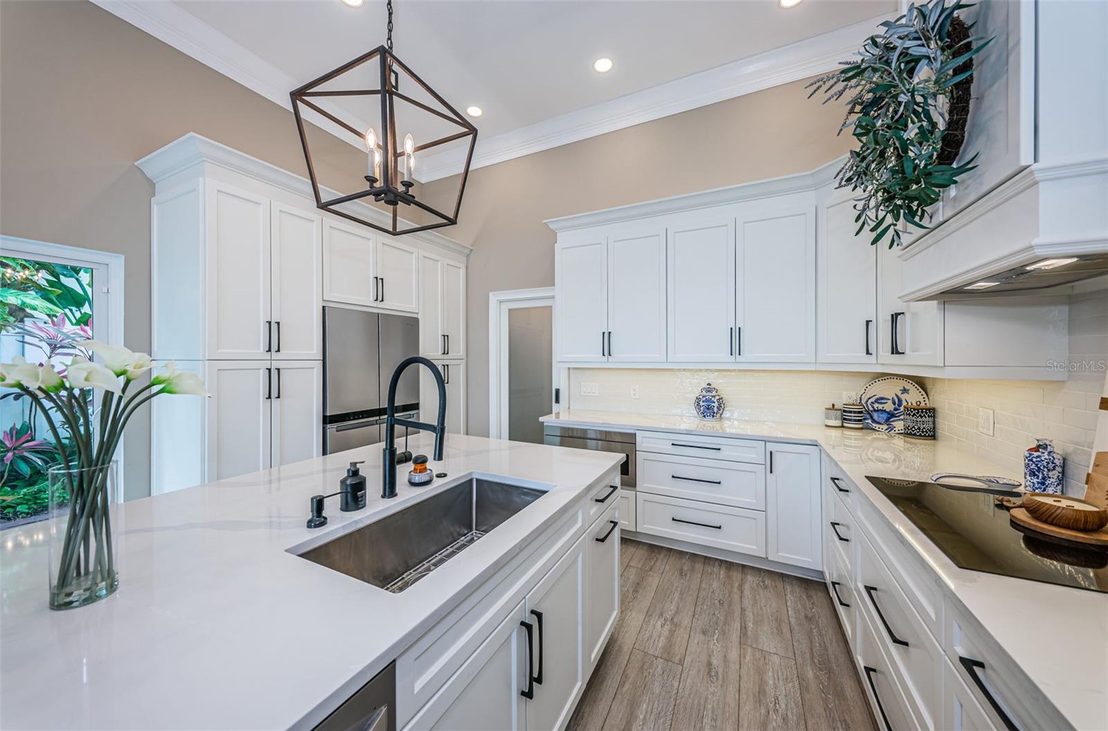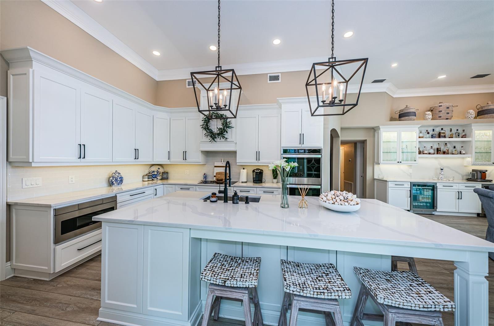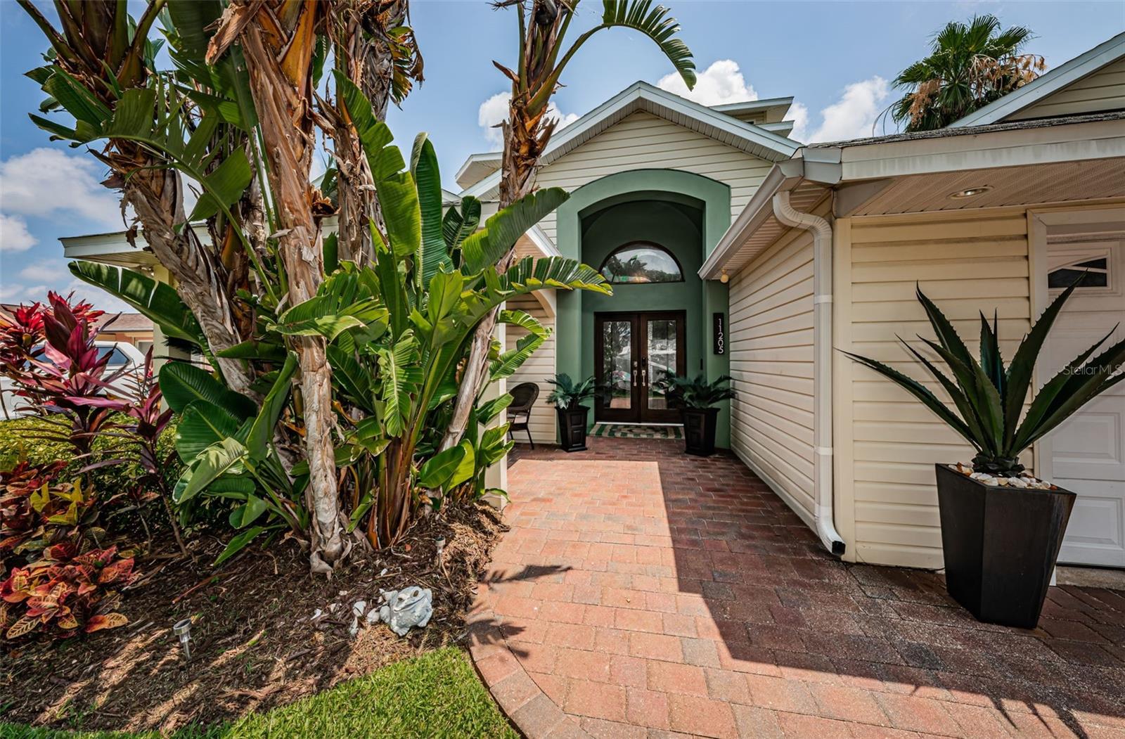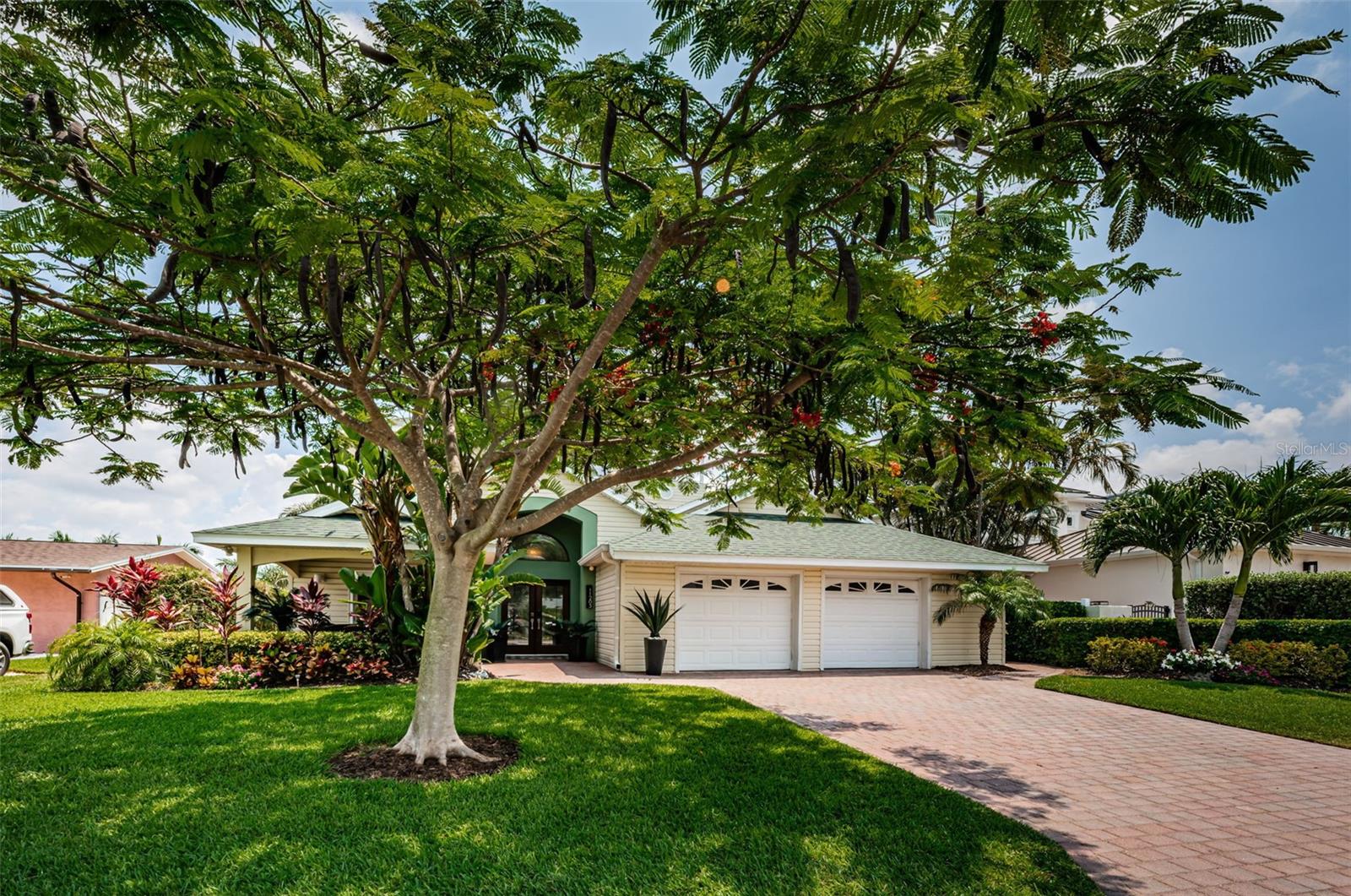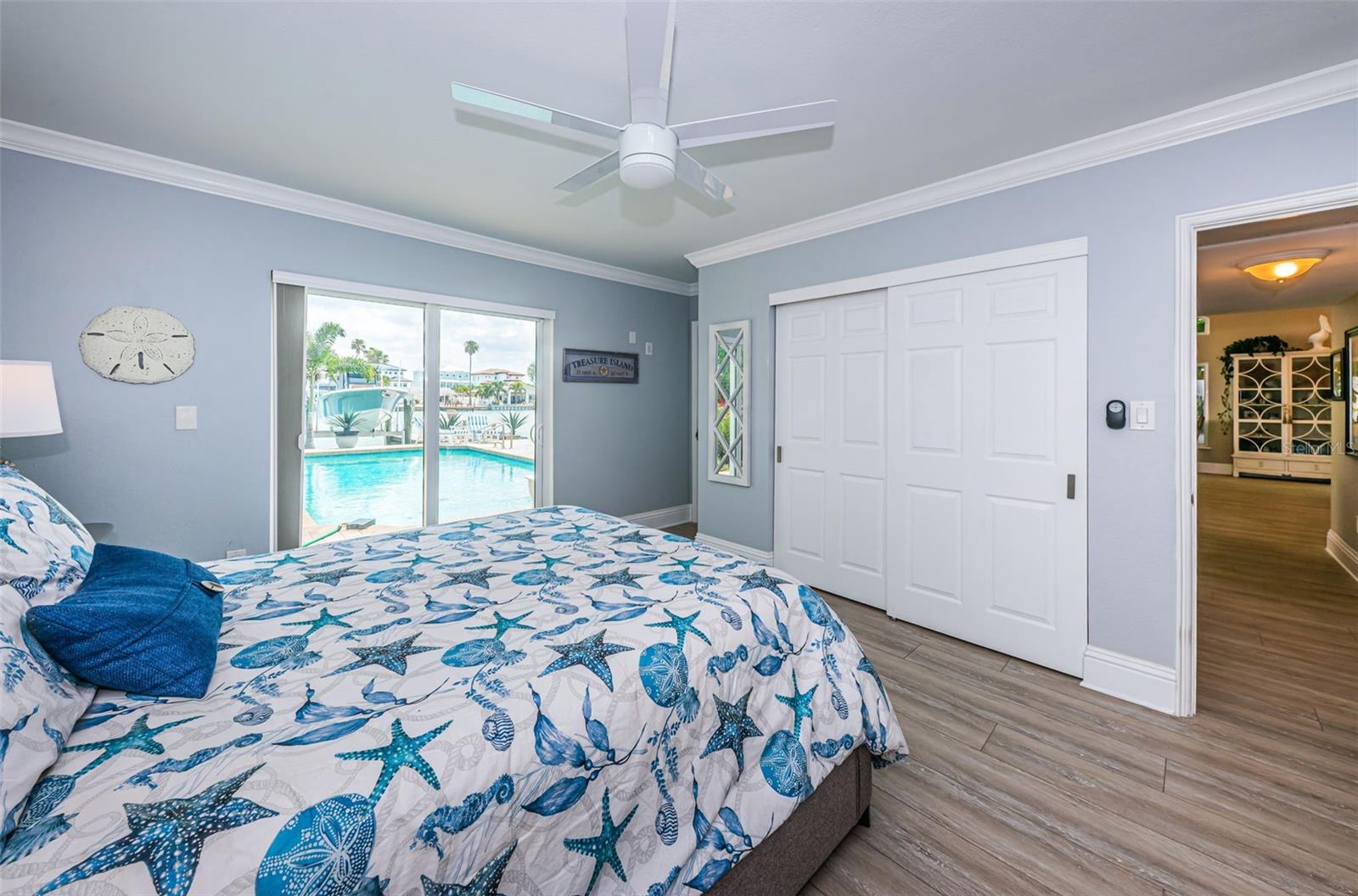 BEAUTIFULLY LANDSCAPED WITH A WONDERFUL SOUTHERN COASTAL APPEAL, THIS GORGEOUS WATERFRONT RESIDENCE OFFERS FABULOUS WATERVIEWS AND RAPID BOATING ACCESS TO THE GULF OF MEXICO! A lovely covered entry with spacious seating area introduces an elegant 13ft-high foyer and a luxuriant home with rich driftwood-style flooring, beautiful woodworking, radiant lighting and superb finishes. The terrific waterfront great room boasts 14ft-high ceilings, a fireplace and entertainment wall, and easy access to the large back yard pool deck. The posh designer kitchen features inspiring quartz surfaces, coastal-white wood cabinetry, high-quality stainless-steel appliances, a large island bar with prep center, and a sizable pantry closet system. The huge open dining area includes a custom, built-in luxury buffet and multi-chiller beverage center. The first level guest suite with splendid full bath, overlooks the waterfront and opens to the pool deck. Separate, full guest bath is beautifully tiled, with graceful fixtures and glasswork. Upstairs, rests the stunning waterfront owner’s suite, with 19ft-high vaulted ceilings, walk-in closet system, dedicated sitting area, and private balcony overlooking the pool deck and waterfront. The posh owner’s bath enjoys a lavish open-concept walk-in rainshower with shower wand, exquisite quartz surfaces, dual vanities and views of your waterfront. You’ll love the terrific upper-level lofted entertainment room with built-in beverage and entertainment center; room delivers dazzling panoramic views of the intracoastal waterway by day, and illuminated Treasure Island by night. Step out to the open deck and take in amazing waterviews in all four directions! Out back, discover a private, lushly-landscaped tropical oasis. A large paver deck (with pavered walkways that extend completely around the home) provides generous space for outdoor dining, with an extended lounging area around the impressive, oversized swimming pool. Your newer composite dock includes a seating area, step down platform for kayaks, and a 13,000 lb boat lift – from here, you’ll be in the Gulf of Mexico in just 10 minutes! This remarkable waterfront home has been meticulously maintained and is the definition of “move in ready.” An uncommon opportunity in an exceptional boating community close to the beach, shopping, dining and entertainment! Buyer to confirm all measurements.