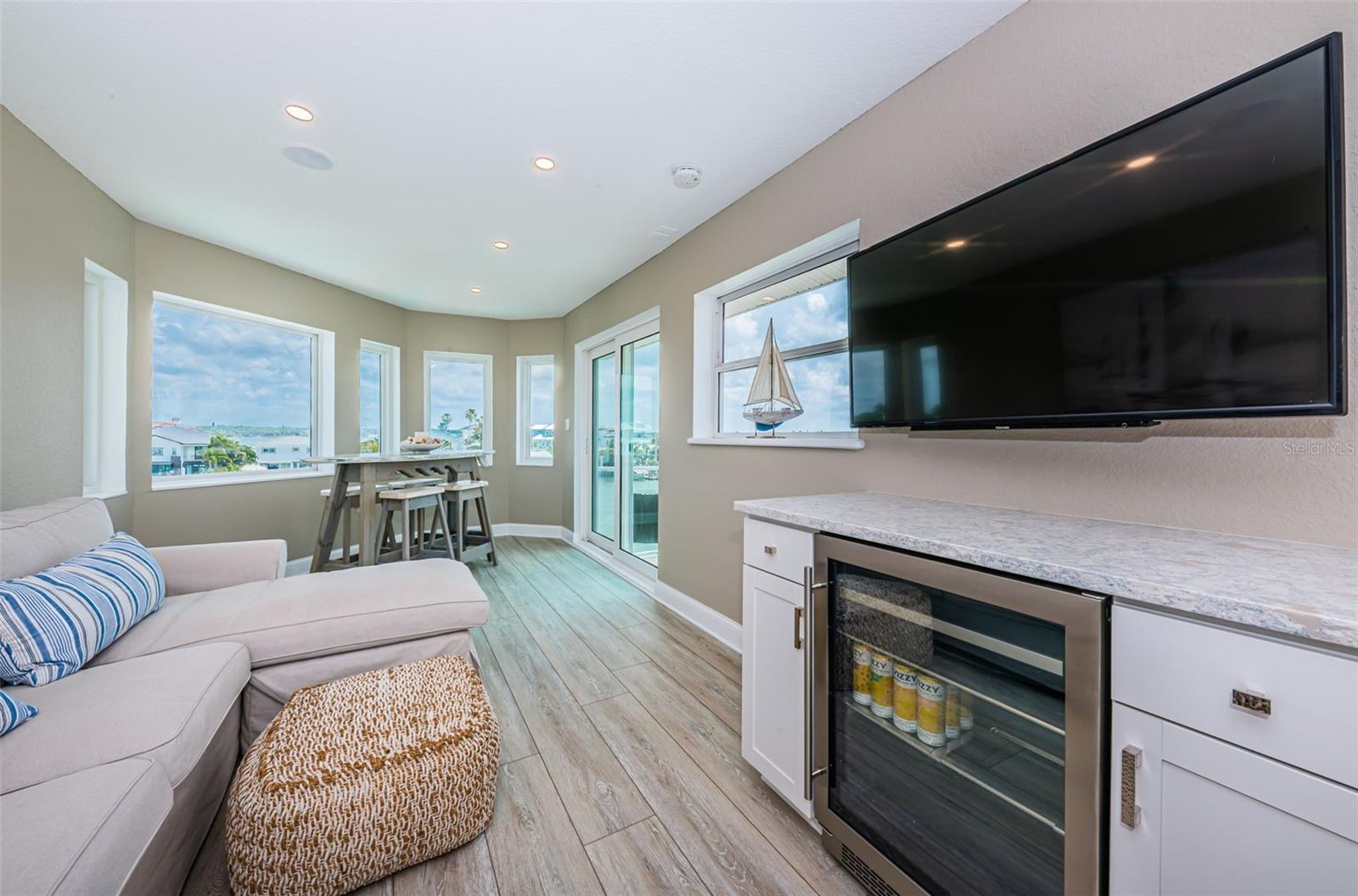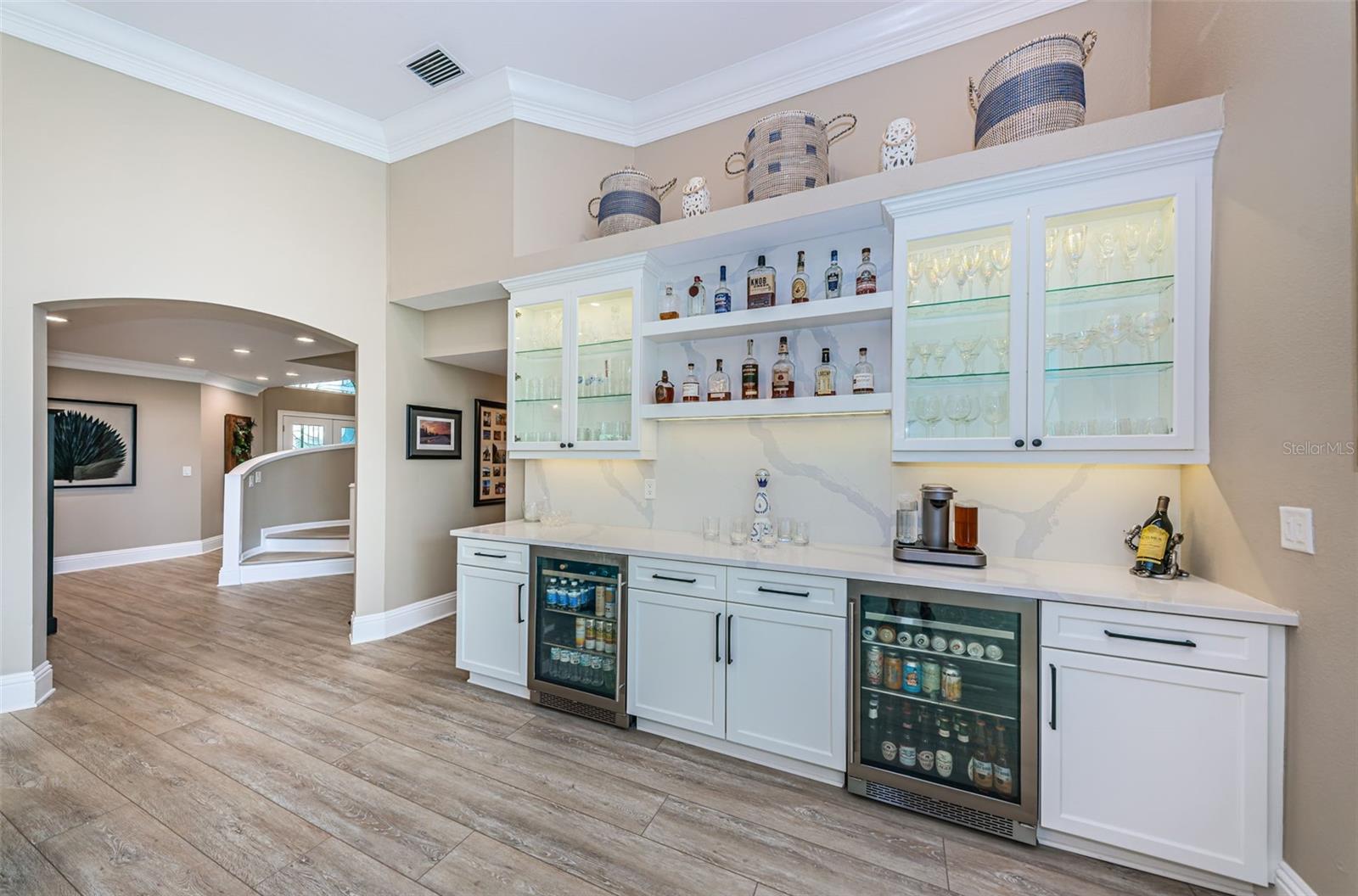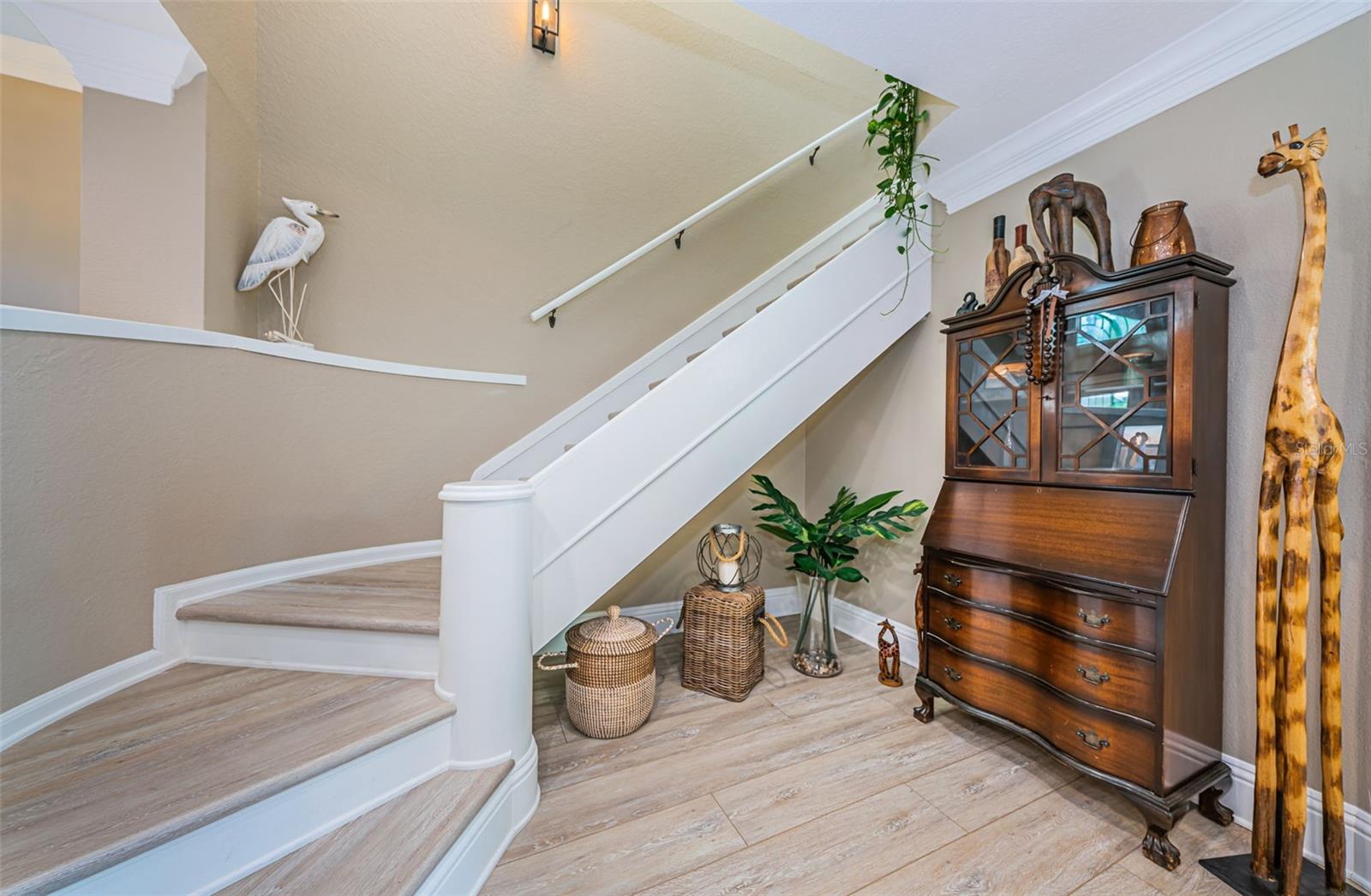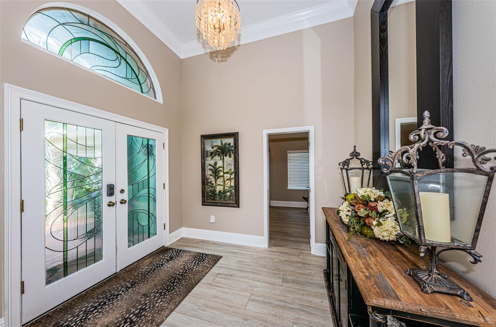 BEAUTIFULLY LANDSCAPED WITH A WONDERFUL SOUTHERN COASTAL APPEAL, THIS GORGEOUS WATERFRONT RESIDENCE OFFERS FABULOUS WATERVIEWS AND RAPID BOATING ACCESS TO THE GULF OF MEXICO! A lovely covered entry with spacious seating area introduces an elegant 13ft-high foyer and a luxuriant home with rich driftwood-style flooring, beautiful woodworking, radiant lighting and superb finishes. The terrific waterfront great room boasts 14ft-high ceilings, a fireplace and entertainment wall, and easy access to the large back yard pool deck. The posh designer kitchen features inspiring quartz surfaces, coastal-white wood cabinetry, high-quality stainless-steel appliances, a large island bar with prep center, and a sizable pantry closet system. The huge open dining area includes a custom, built-in luxury buffet and multi-chiller beverage center. The first level guest suite with splendid full bath, overlooks the waterfront and opens to the pool deck. Separate, full guest bath is beautifully tiled, with graceful fixtures and glasswork. Upstairs, rests the stunning waterfront owner’s suite, with 19ft-high vaulted ceilings, walk-in closet system, dedicated sitting area, and private balcony overlooking the pool deck and waterfront. The posh owner’s bath enjoys a lavish open-concept walk-in rainshower with shower wand, exquisite quartz surfaces, dual vanities and views of your waterfront. You’ll love the terrific upper-level lofted entertainment room with built-in beverage and entertainment center; room delivers dazzling panoramic views of the intracoastal waterway by day, and illuminated Treasure Island by night. Step out to the open deck and take in amazing waterviews in all four directions! Out back, discover a private, lushly-landscaped tropical oasis. A large paver deck (with pavered walkways that extend completely around the home) provides generous space for outdoor dining, with an extended lounging area around the impressive, oversized swimming pool. Your newer composite dock includes a seating area, step down platform for kayaks, and a 13,000 lb boat lift – from here, you’ll be in the Gulf of Mexico in just 10 minutes! This remarkable waterfront home has been meticulously maintained and is the definition of “move in ready.” An uncommon opportunity in an exceptional boating community close to the beach, shopping, dining and entertainment! Buyer to confirm all measurements.