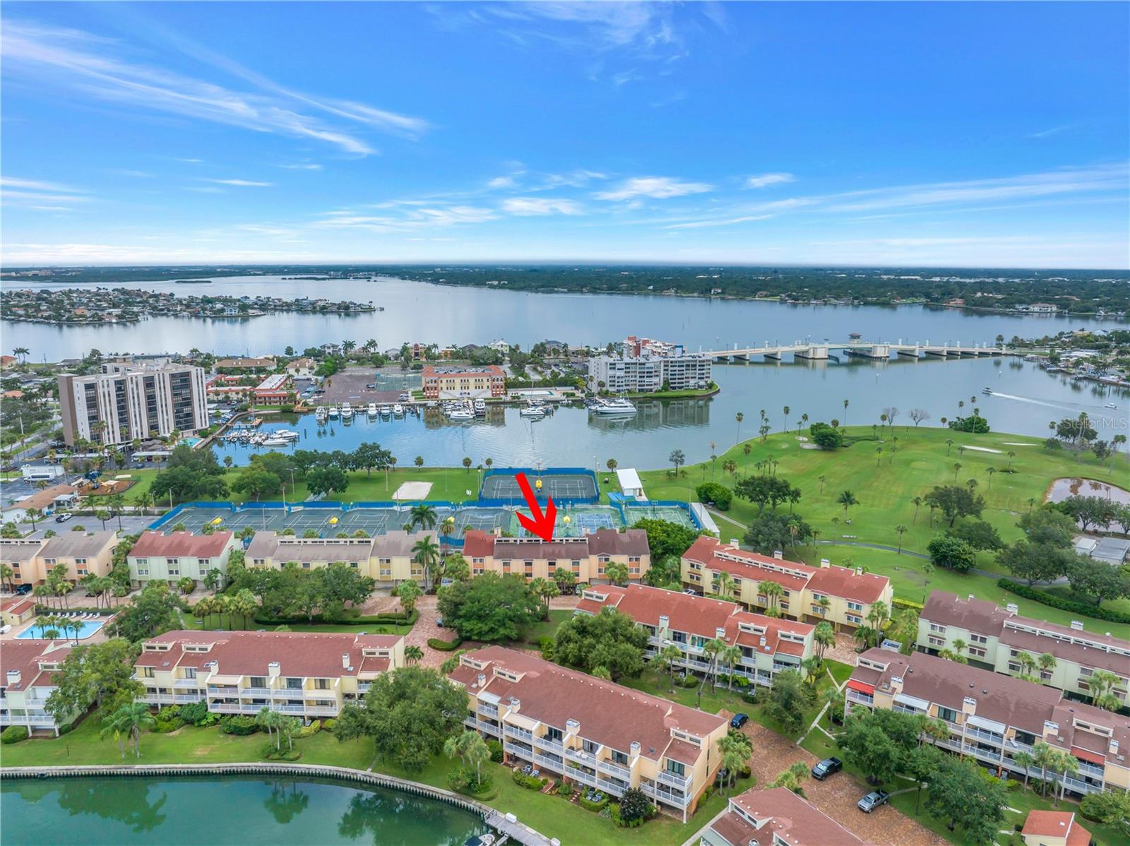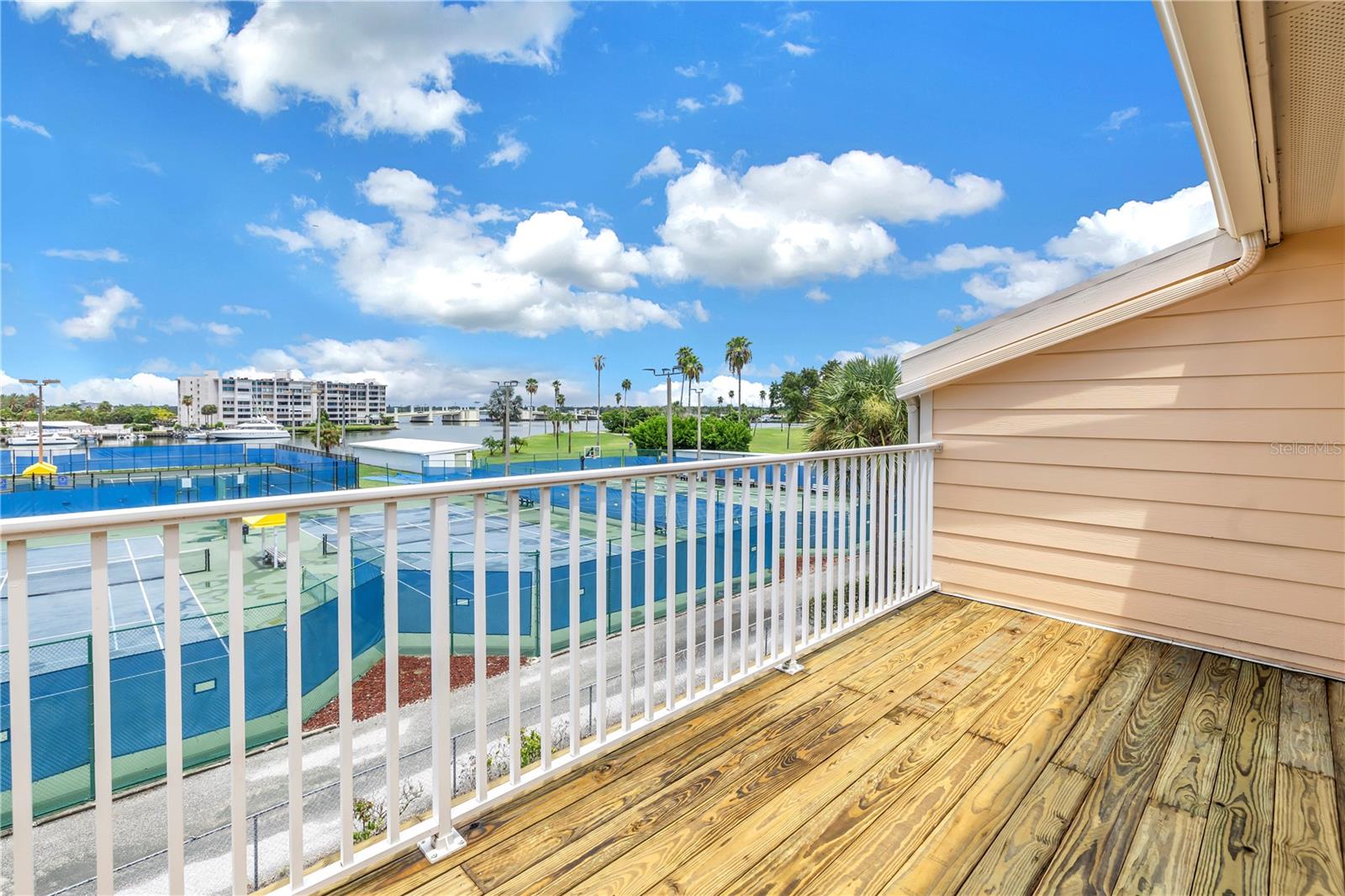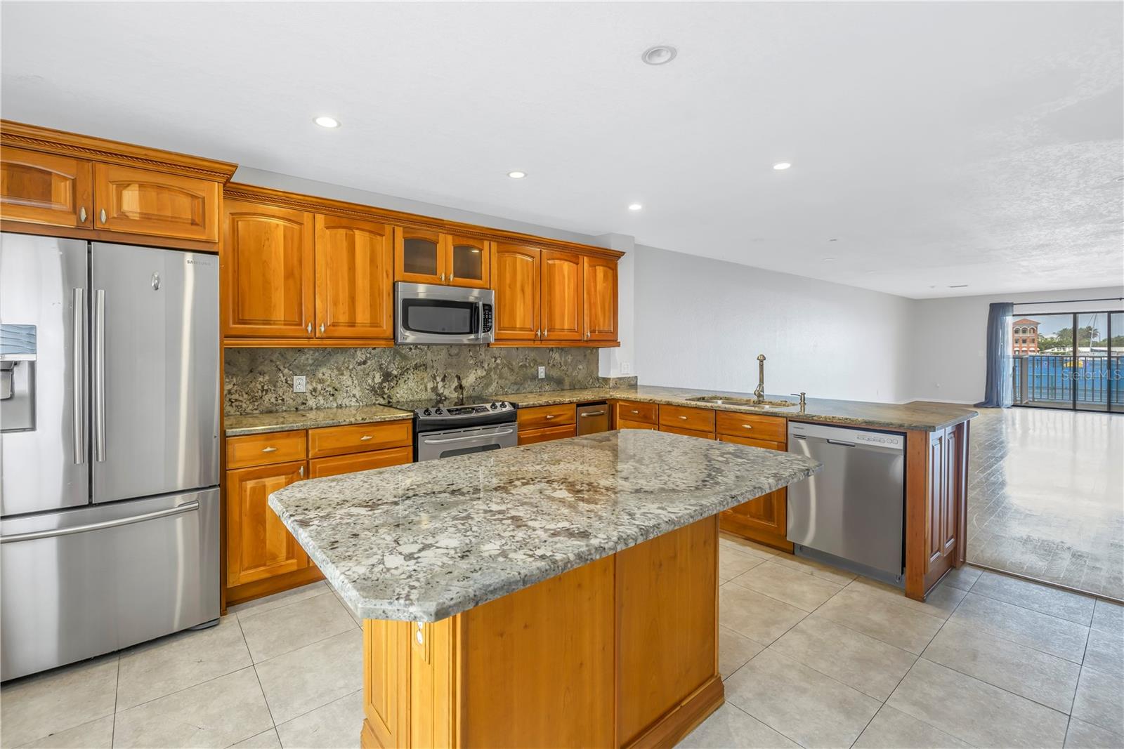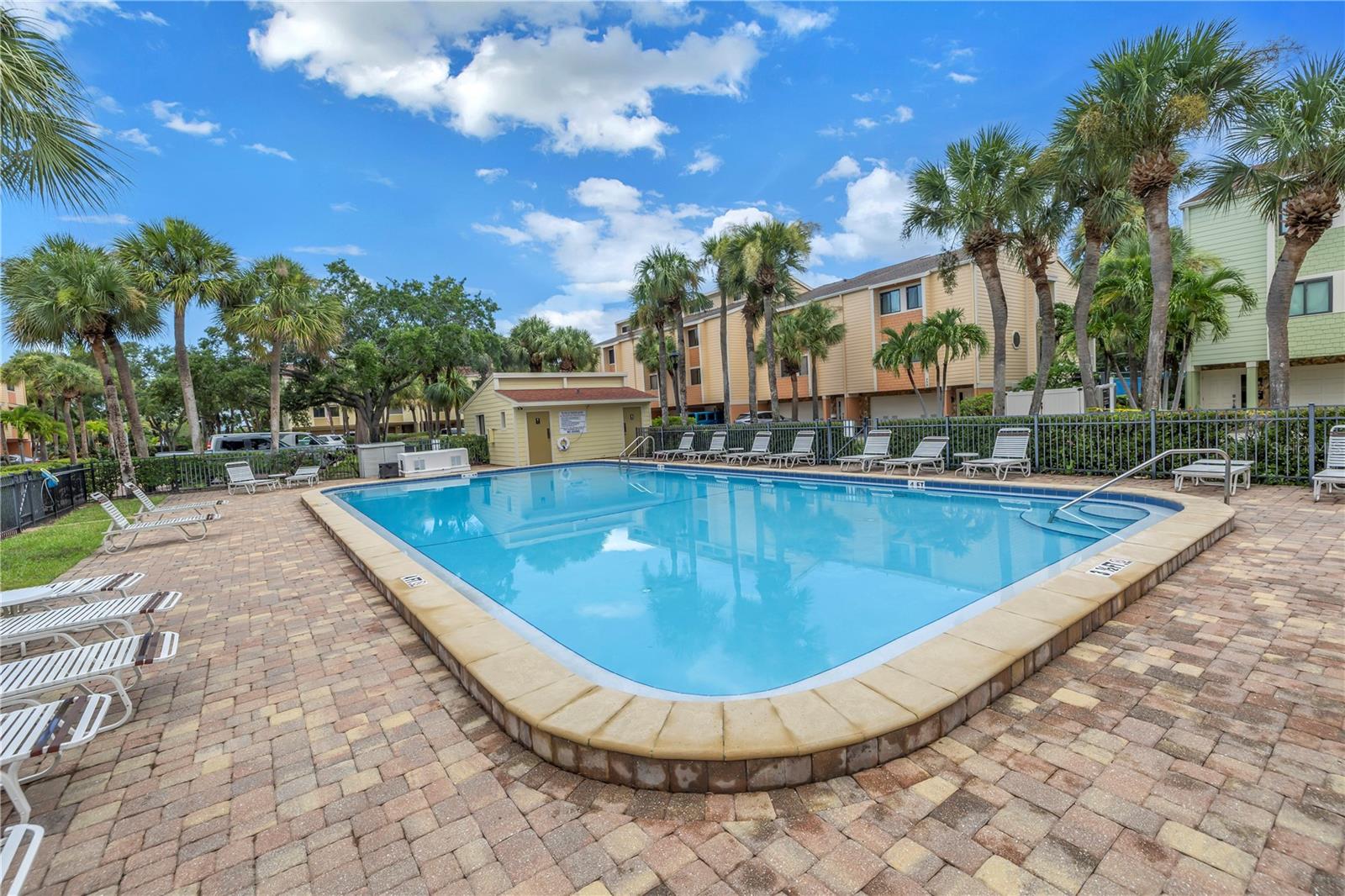 This townhome boasts split ensuite bedrooms which feature a new deck with stunning views of the ICW and the Treasure Island Causeway Bridge. The community offers amenities such as a pool, a covered entertainment area, and plenty of parking along with your own garage. Inside, the great room has hardwood floors, and the sliding glass doors offer water views that lead to the deck, allowing natural light to fill the space. The open floor plan seamlessly connects the great room to the kitchen, which is equipped with granite countertops, tile floors, a bar, island, stainless steel appliances and a walk-in pantry. The primary suite features sliding glass doors and a large walk-in closet. The primary bathroom includes tile floors, granite countertops, and a walk-in shower. Convenience is key with an upstairs laundry room. On the terrace level, you'll find a versatile flex room with access to an exterior patio. Residents can enjoy fishing from the dock with water views, enhancing the serene living experience.