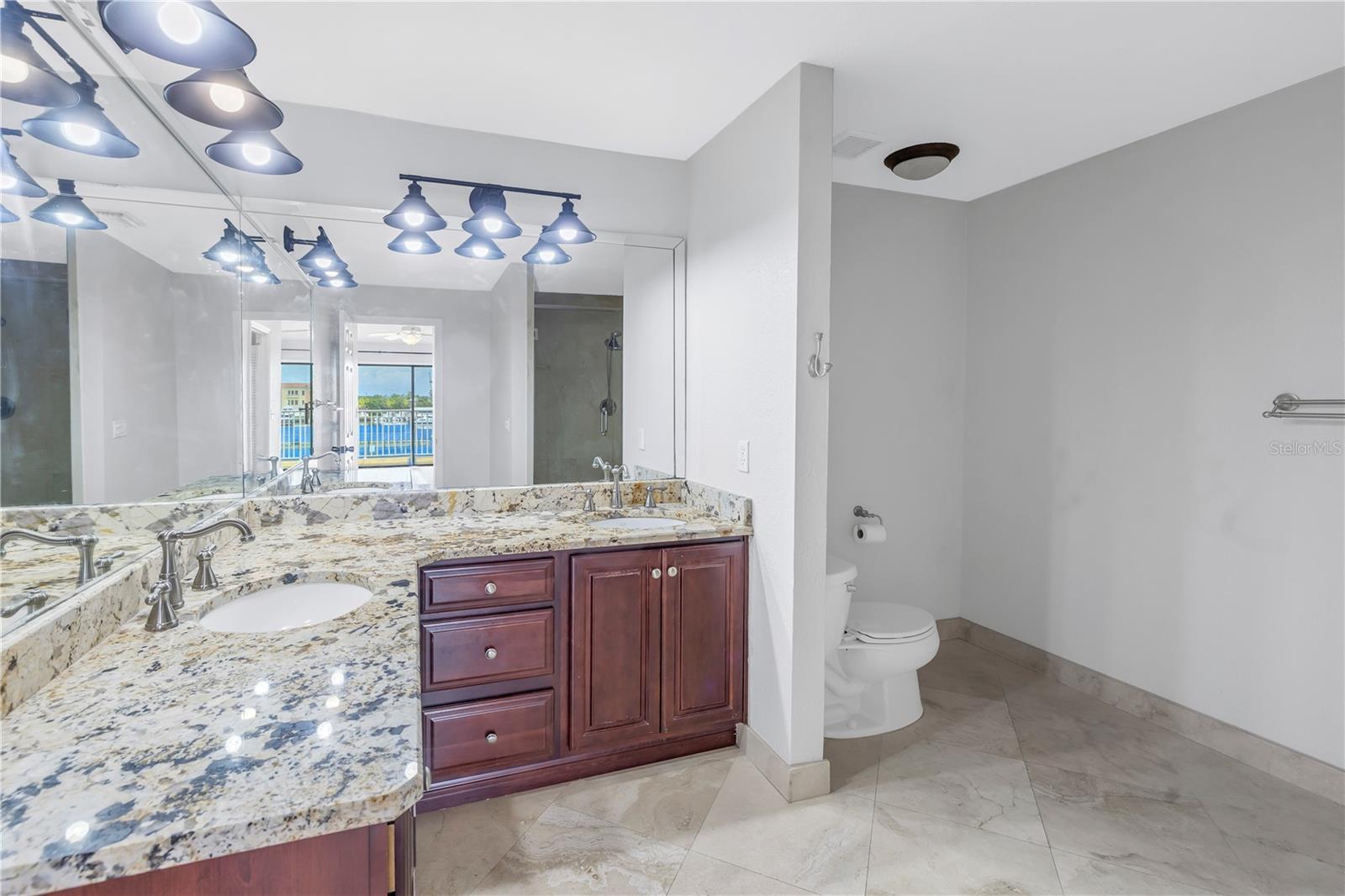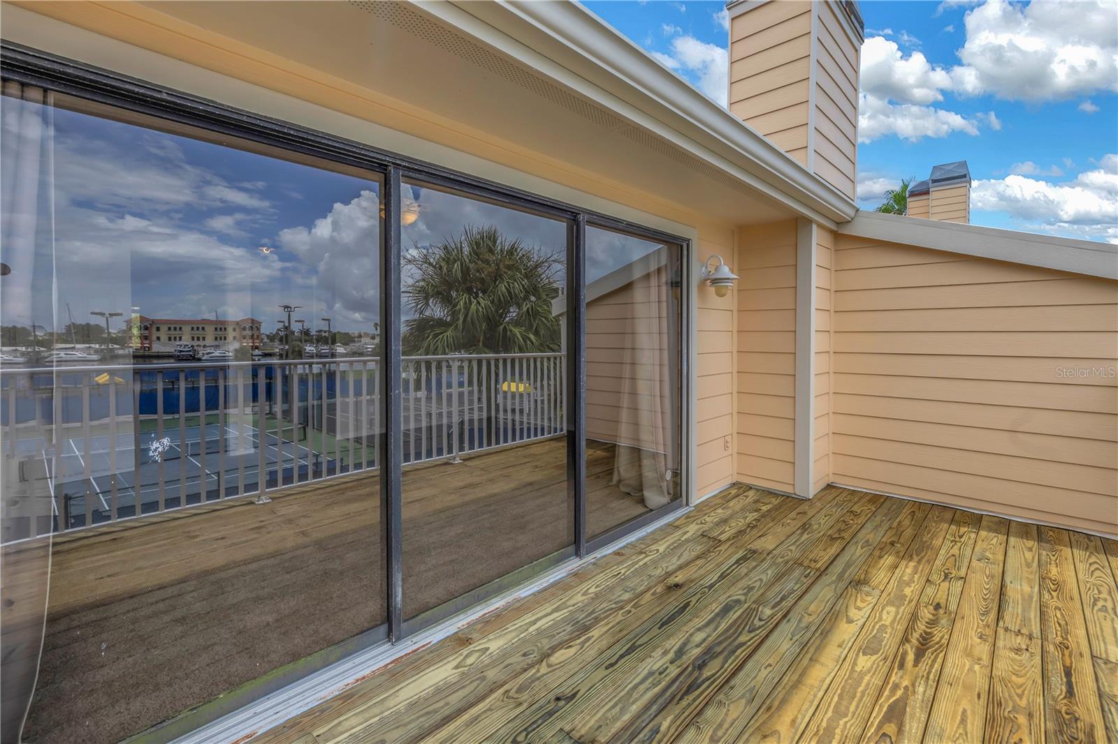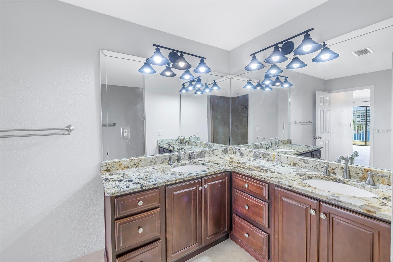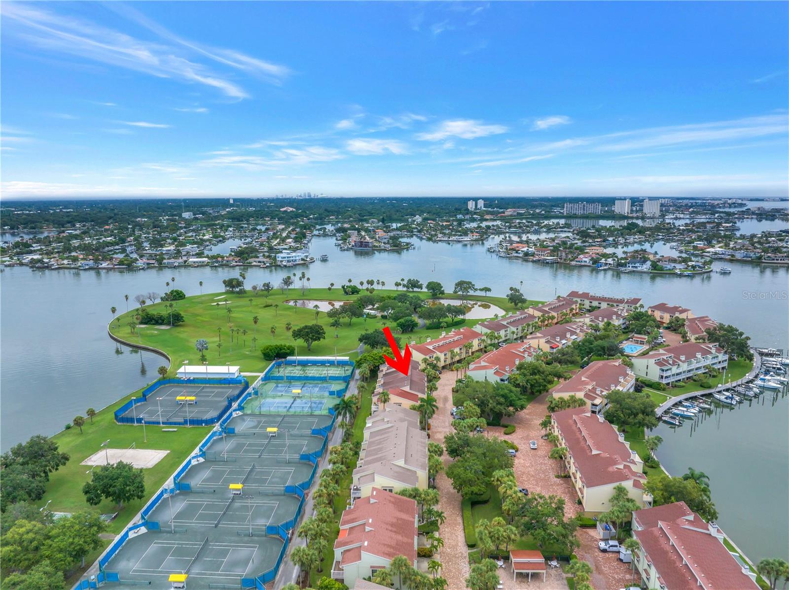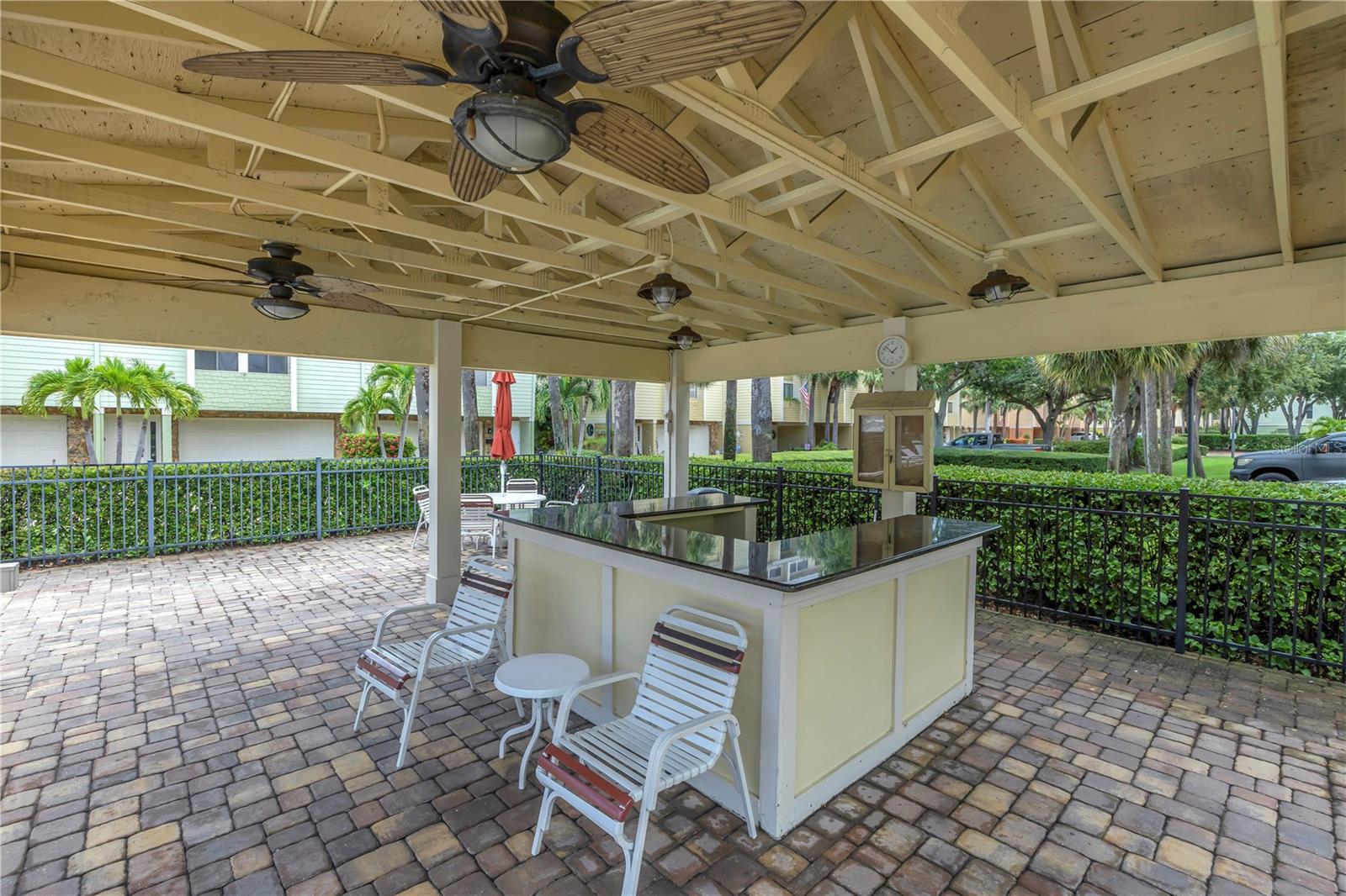 This townhome boasts split ensuite bedrooms which feature a new deck with stunning views of the ICW and the Treasure Island Causeway Bridge. The community offers amenities such as a pool, a covered entertainment area, and plenty of parking along with your own garage. Inside, the great room has hardwood floors, and the sliding glass doors offer water views that lead to the deck, allowing natural light to fill the space. The open floor plan seamlessly connects the great room to the kitchen, which is equipped with granite countertops, tile floors, a bar, island, stainless steel appliances and a walk-in pantry. The primary suite features sliding glass doors and a large walk-in closet. The primary bathroom includes tile floors, granite countertops, and a walk-in shower. Convenience is key with an upstairs laundry room. On the terrace level, you'll find a versatile flex room with access to an exterior patio. Residents can enjoy fishing from the dock with water views, enhancing the serene living experience.