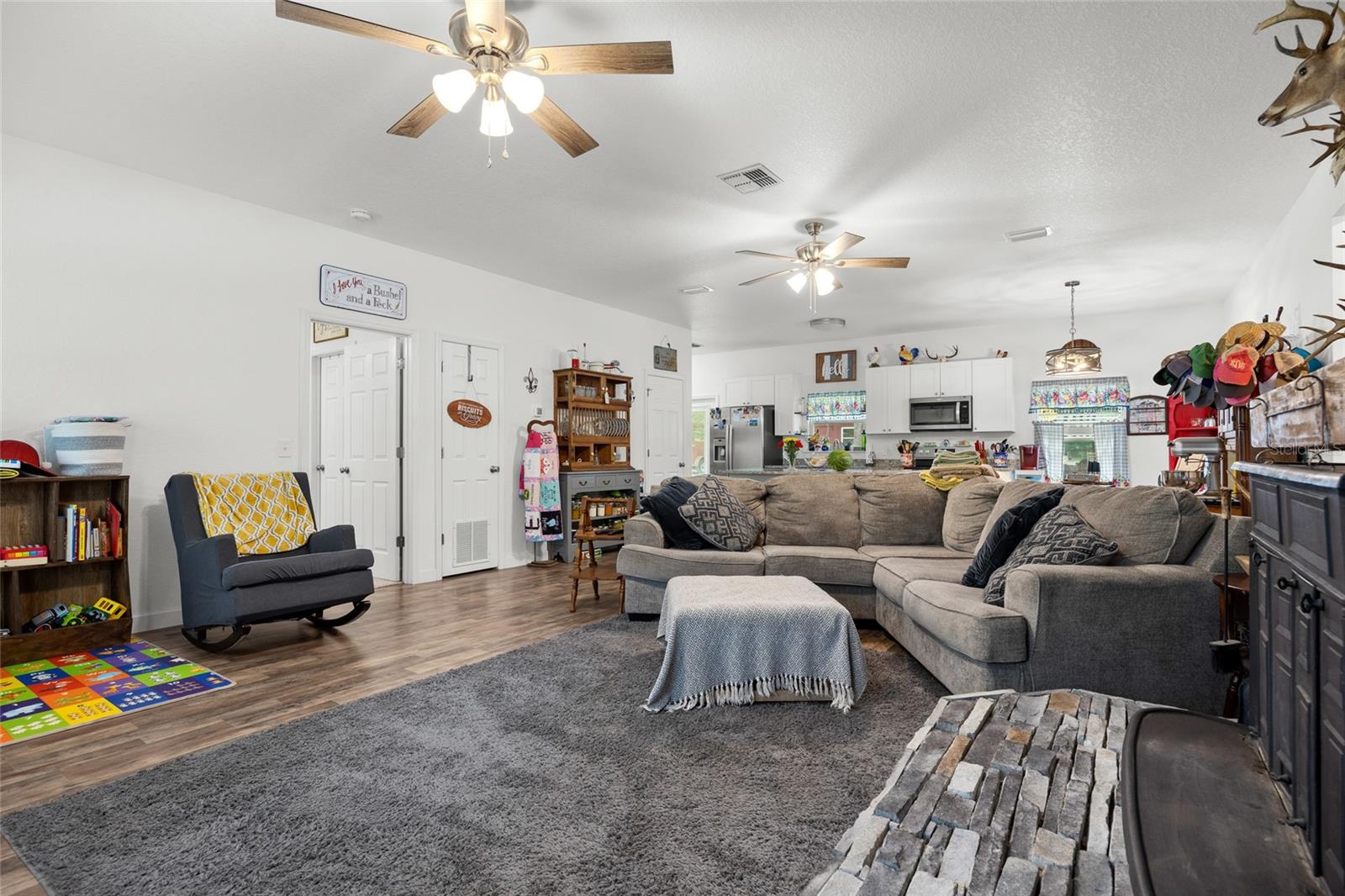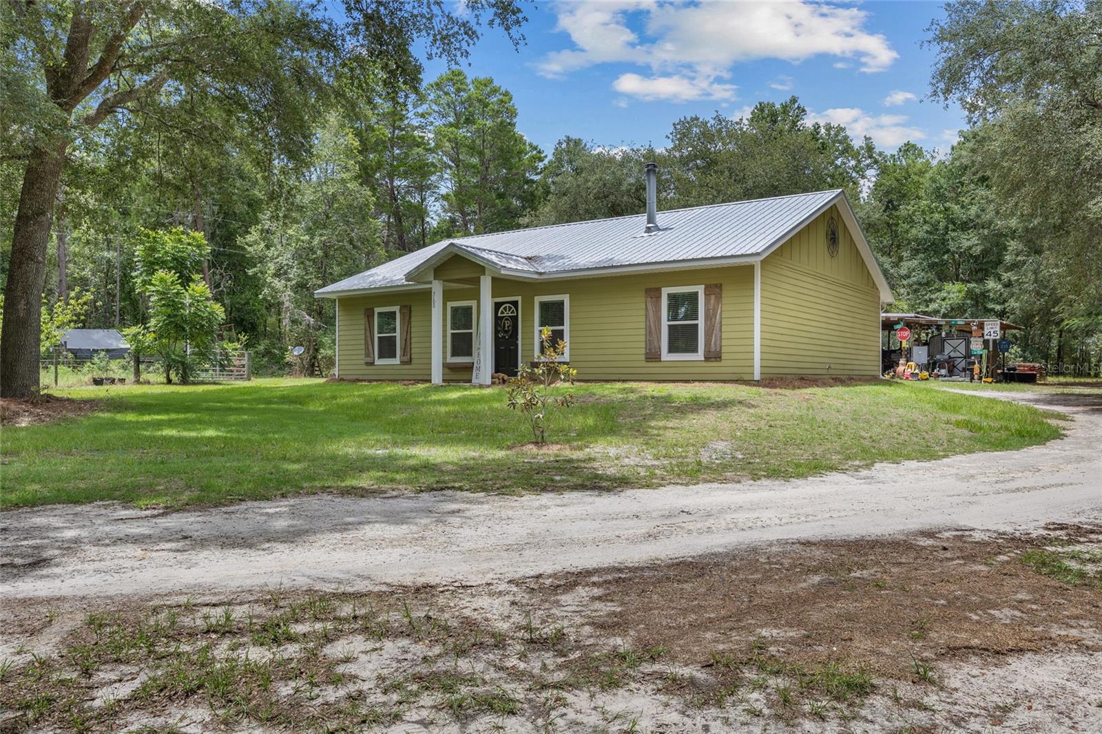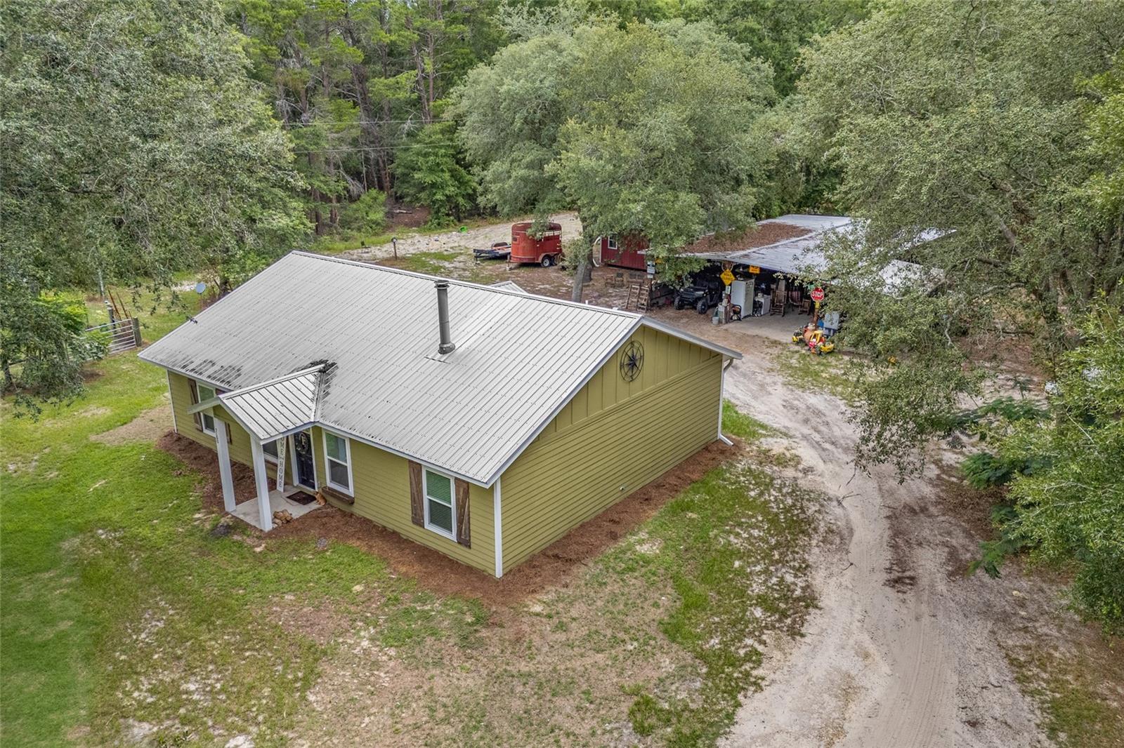 Discover the charm of this adorable 3-bedroom, 2-bathroom home situated on nearly 5 acres of serene land! Built in 2021, this home features a durable metal roof and a thoughtful split floor plan, perfect for modern living. The inviting living room boasts a wood-burning stove set against a stunning brick backdrop, creating a cozy ambiance for relaxing evenings. The spacious master bathroom is a true retreat, complete with a luxurious dream tub for ultimate relaxation. Culinary enthusiasts will adore the dream kitchen, which includes a large island that offers ample space for meal preparation and casual dining. Outside, you'll find a massive 40 x 50 open barn equipped with power and water, providing abundant storage for vehicles, recreational toys, and more. A 50 amp RV hook up as well. Despite its secluded feel, this property is conveniently located—just 15 minutes from High Springs, 30 minutes from the nearest hospital, and an hour from the coastal beauty of Steinhatchee. This home offers a perfect blend of tranquility and accessibility, making it an ideal sanctuary for those seeking both peace and convenience.