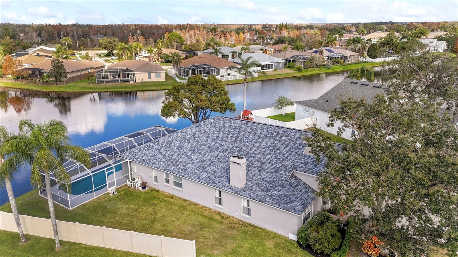 HIGH AND DRY! THIS HOUSE HAS NEVER FLOODED! Welcome to the highly desirable Thousand Oaks Community! This 4 BED, 3 BATH, 3 CAR GARAGE, PLUS OFFICE, POOL HOME is situated on a PREMIUM, OVERSIZED, WATERFRONT LOT! AMAZING UPDATES include: NEW TOP OF LINE ROOF (2024) with transferrable warranty, NEW RUNTRU BY TRANE HVAC (2024) with transferrable warranty, and RHEEM Water Heater (2020). Approaching the house, you are instantly greeted by the freshly LANDSCAPED GARDEN and OAK TREE and MASSIVE SIDE YARDS. Upon entering, you'll notice the beautiful VAULTED CEILINGS and the VIEW straight ahead of the POOL, POND, and PRESERVE through the glass sliders. Immediately to the left are the double doors to the office which features plantation shutters on the front window. Continue to the living room with WOOD BURNING FIREPLACE which adds both heat and ambiance on cold nights. The dining room, currently used as a game room, is to the right and is perfectly placed in the center of the home. It also features a pass-through door to the primary closet to double as a coat closet. The family room showcases the view of the PRIVATE BACKYARD OASIS and is open to the kitchen and breakfast nook. Continue to the spacious kitchen with tall wood cabinets with tons of storage and separate area for breakfast nook. Off the family room to the left is the EXTENDED PRIMARY SUITE with private access to the lanai and sweeping views through the window. The PRIMARY boasts an EN-SUITE BATH with dual sink vanity, separate water closet, jacuzzi tub, separate shower, and LARGE WALK IN CLOSET with pass-thru door. The back right portion of the home features a FULL BATH with access to the lanai/pool area. This bathroom is also an en-suite to the secondary bedroom, which has a walk in closet. The front right portion of the home contains the laundry room, and 2 more secondary bedrooms that share a FULL BATH. Head outside through the tall sliders to view the MASSIVE LANAI with freshly painted pool deck, EXTRA LONG 36'8" POOL designed for pool volleyball and other activities, and spa. On your private lanai, enjoy the panoramic water and peaceful preserve views which is the perfect way to recenter and be peaceful after a long day. 2 large side yards (FENCED) with playground. Additional features are On-Q Cable, Phone, and Internet. Pool pump replaced 2024. Pool is plumbed and wired for heat. CONVENIENTLY LOCATED just minutes away from shopping, restaurants, trails, and SR-54. TOP RATED SCHOOLS! LOW HOA and NO CDD. X flood zone.